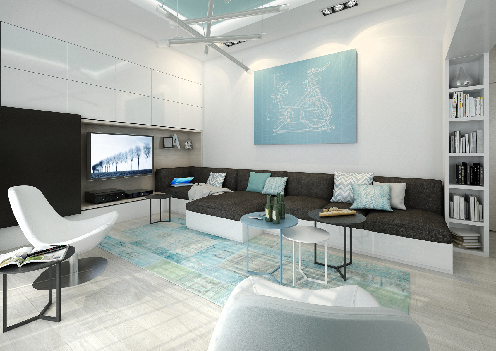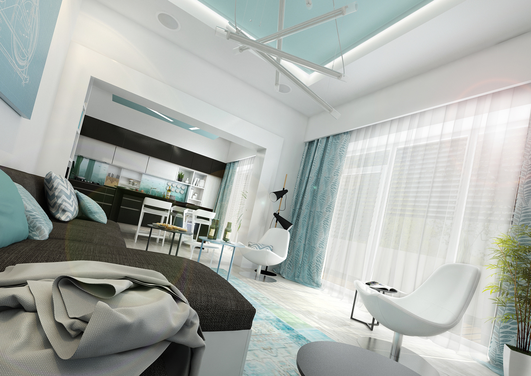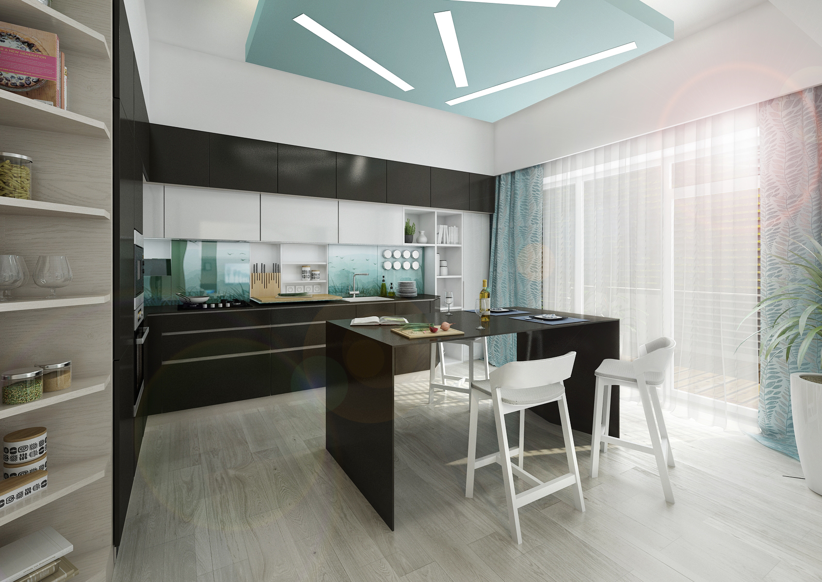 is designed in a modern style in a turquoise-black-white combination together with a light wooden floor made of bleached oak. A black compact top is used for the worktop and the bar / dining table. Untraditionally conceived tiling behind worktop. Behind the tempered glass, glued with a graphic motif, there is also a hinged storage space, for example for spices, knives, chopping boards, etc. In the living room, the main feature is a TV wall with a sliding element, behind which you can hide a TV or library.