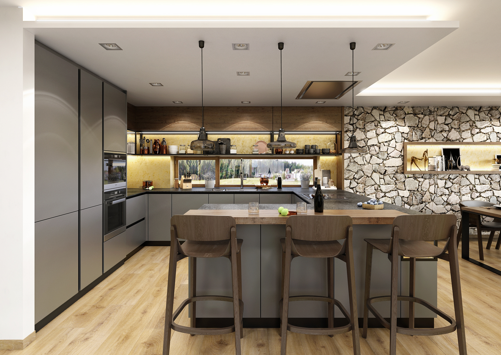 The spacious kitchen is U-shaped with built-in appliances. The gray handleless cabinets are complemented by black details that match the stone worktop. The upper cabinets are designed in dark walnut decor, as are the bar and bar stools.