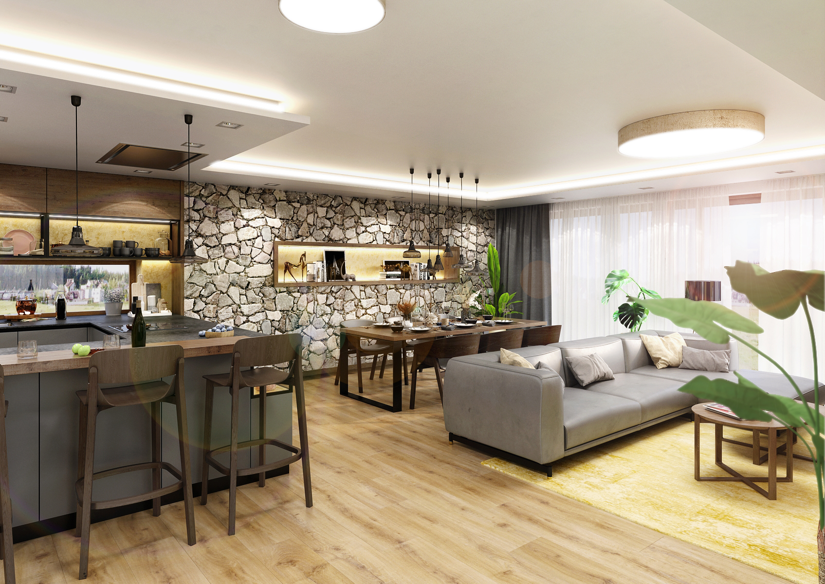 The kitchen is connected to the dining room with the living room, where the most interesting element is the tiling behind the dining table made of natural stone with a built-in illuminated shelf.