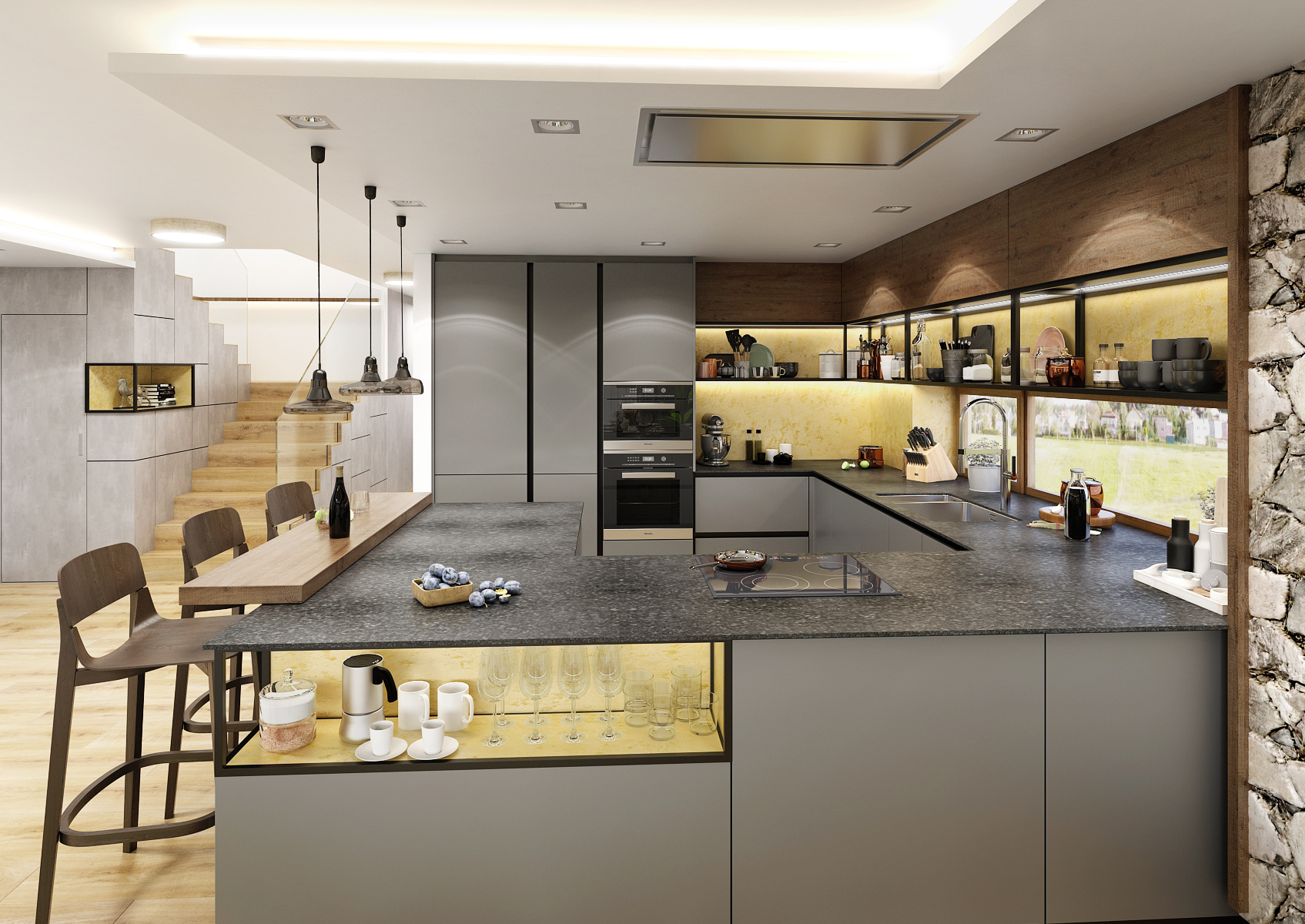 Above the longitudinal window, which provides a view of nature while cooking, there is an illuminated shelf for, for example, an exhibition of premium alcohol. A golden textured concrete screed protrudes behind the shelf, brightening the space. There is also an open storage space with a metal structure in the kitchen.