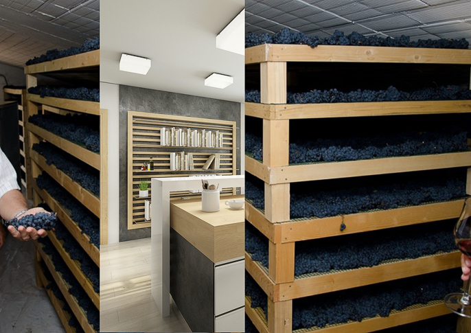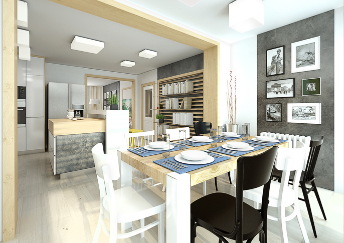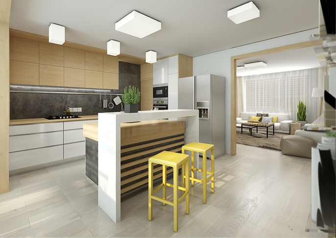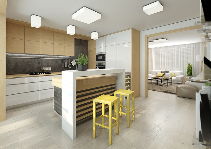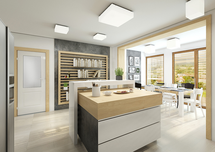 The interior is connected by two repeating elements - a black decorative spatula and wooden chips, from which the original tiling of the kitchen island and a wall shelf for books are made. The inspiration came from wine dryers, which is a job and a hobby for homeowners.