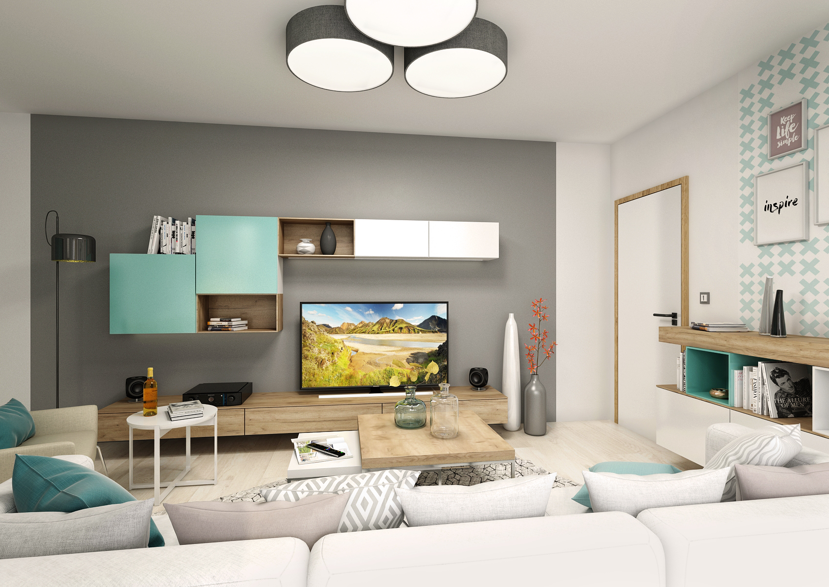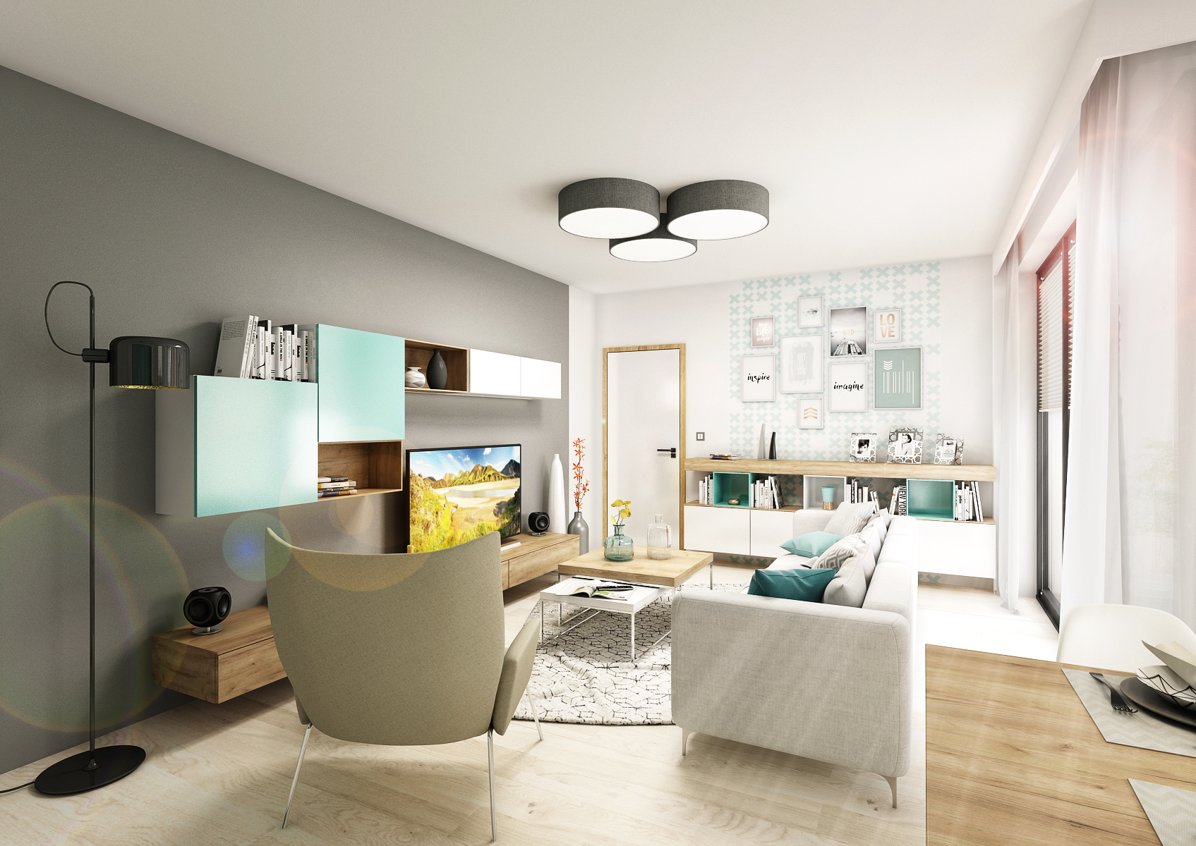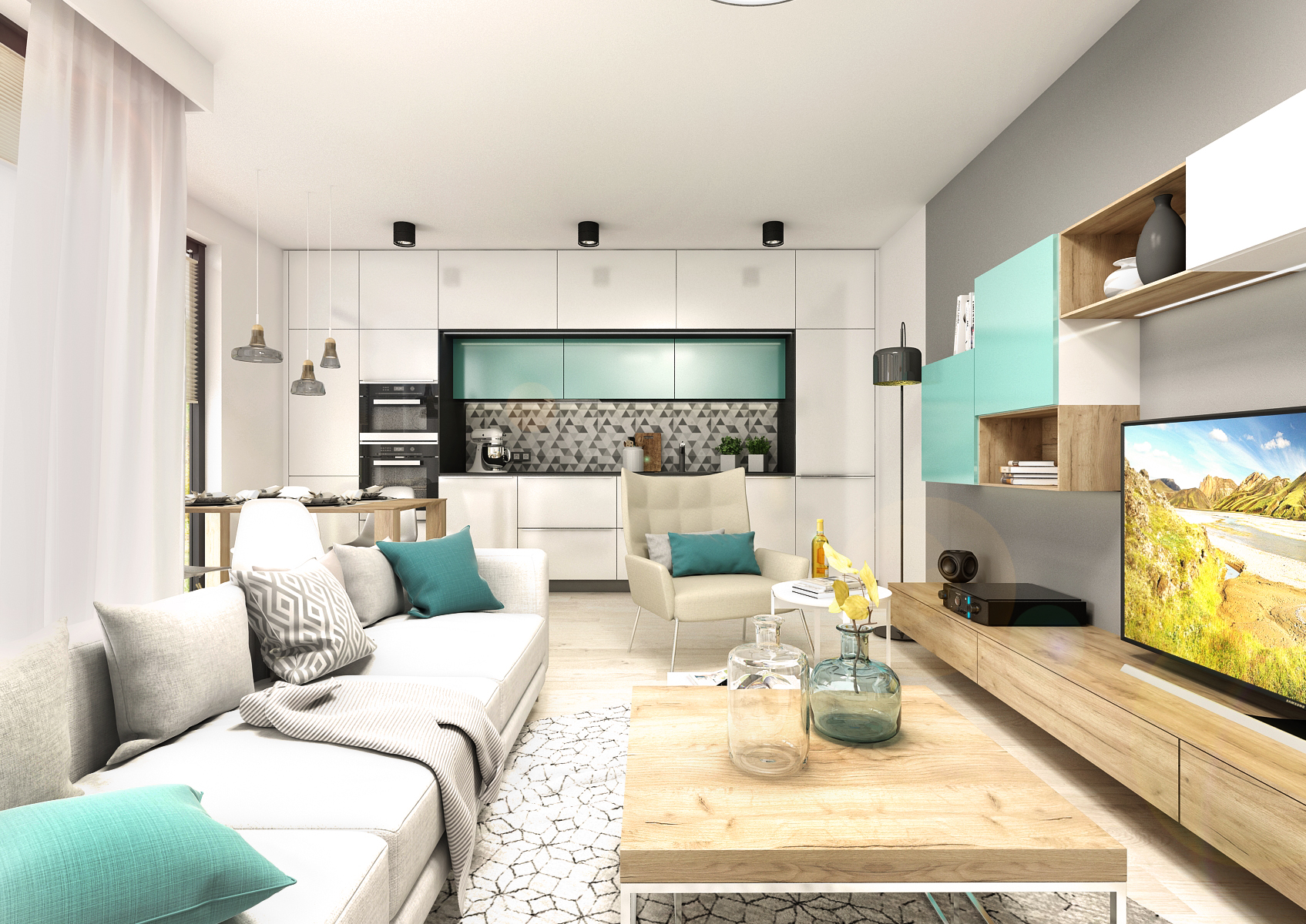 The kitchen combined with the living room is quite common today. The design for a new 2 + kk residential building is conceived in a modern