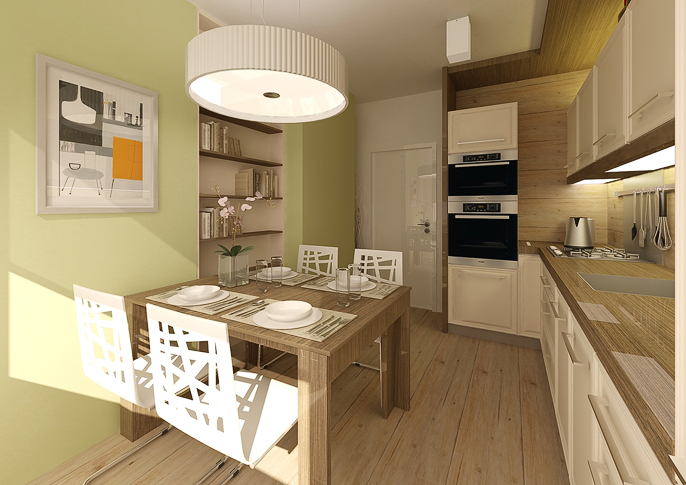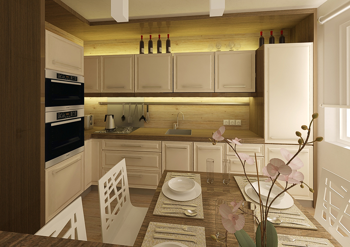 The natural materials used and the earthy colors in combination with the pure white on the kitchen door underline the rustic tuning of the kitchen without the design losing its relevance. The LED backlight highlights the material and illuminates the work surface.