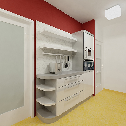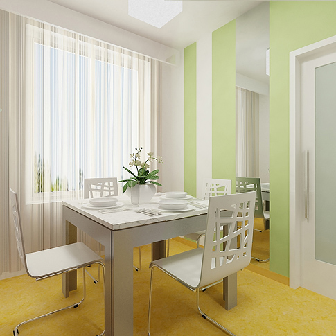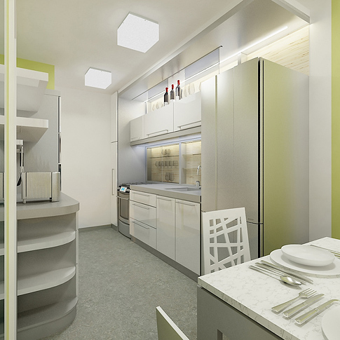 Modern kitchen in classic style in white design. Doors with lacobel tiling and silver corpora. The wall tiling is replaced by glass showcase.