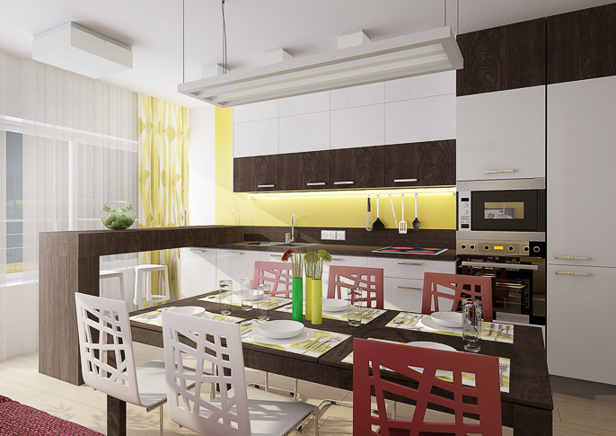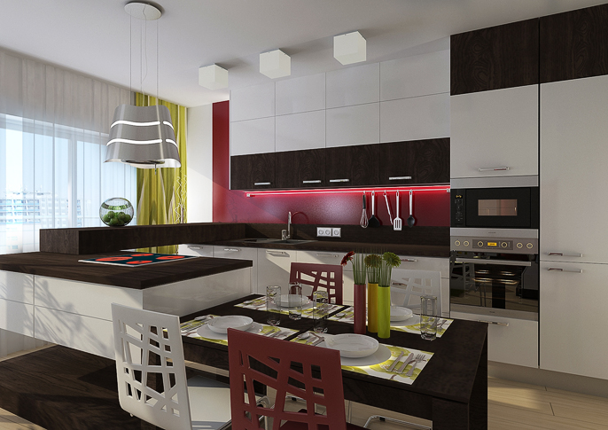 Kitchen with bar counter which connects kitchen unit and island, is solved in white laminate and wood veneer. Red tiling behind the kitchen unit contrasts with green furniture (or vice versa).