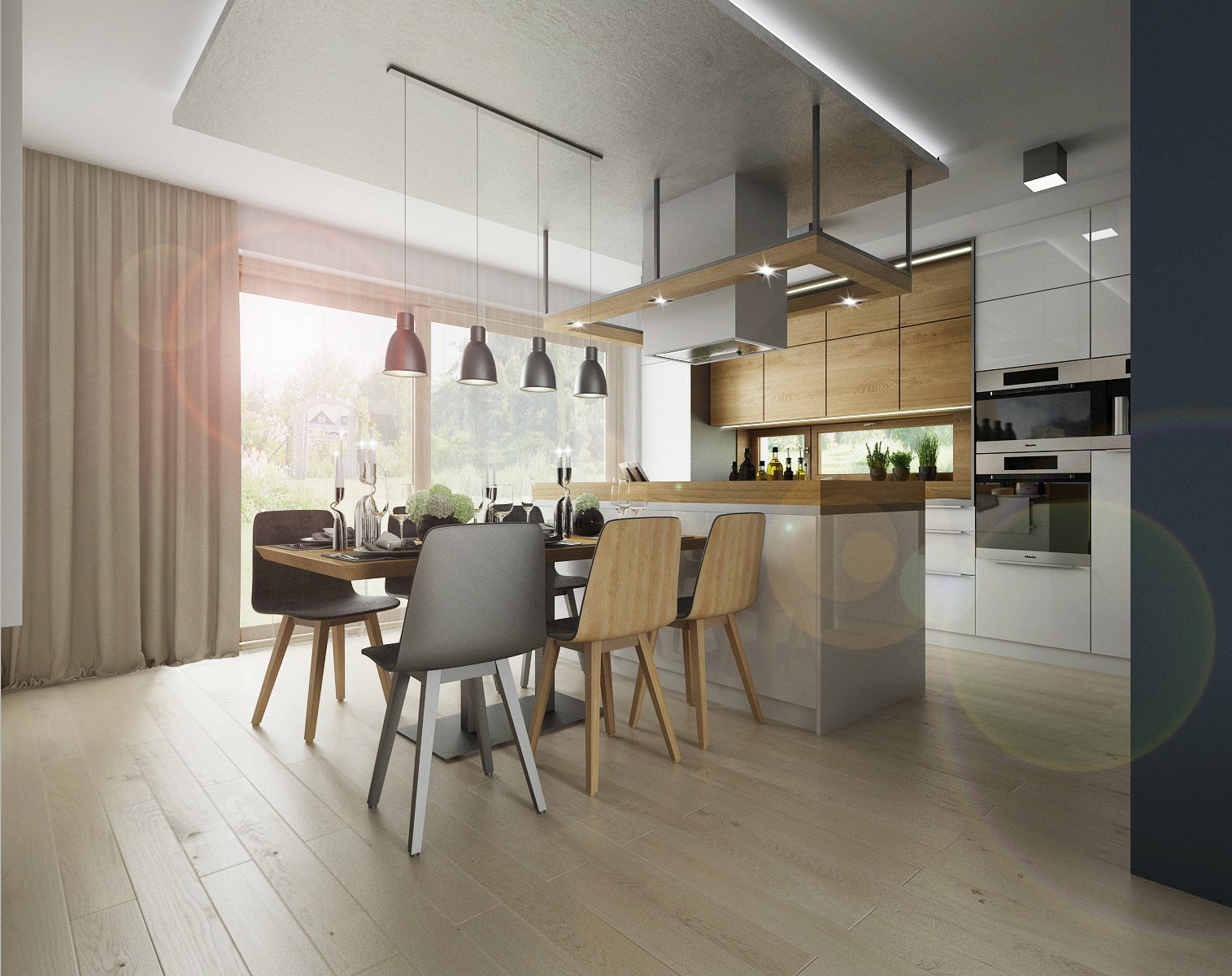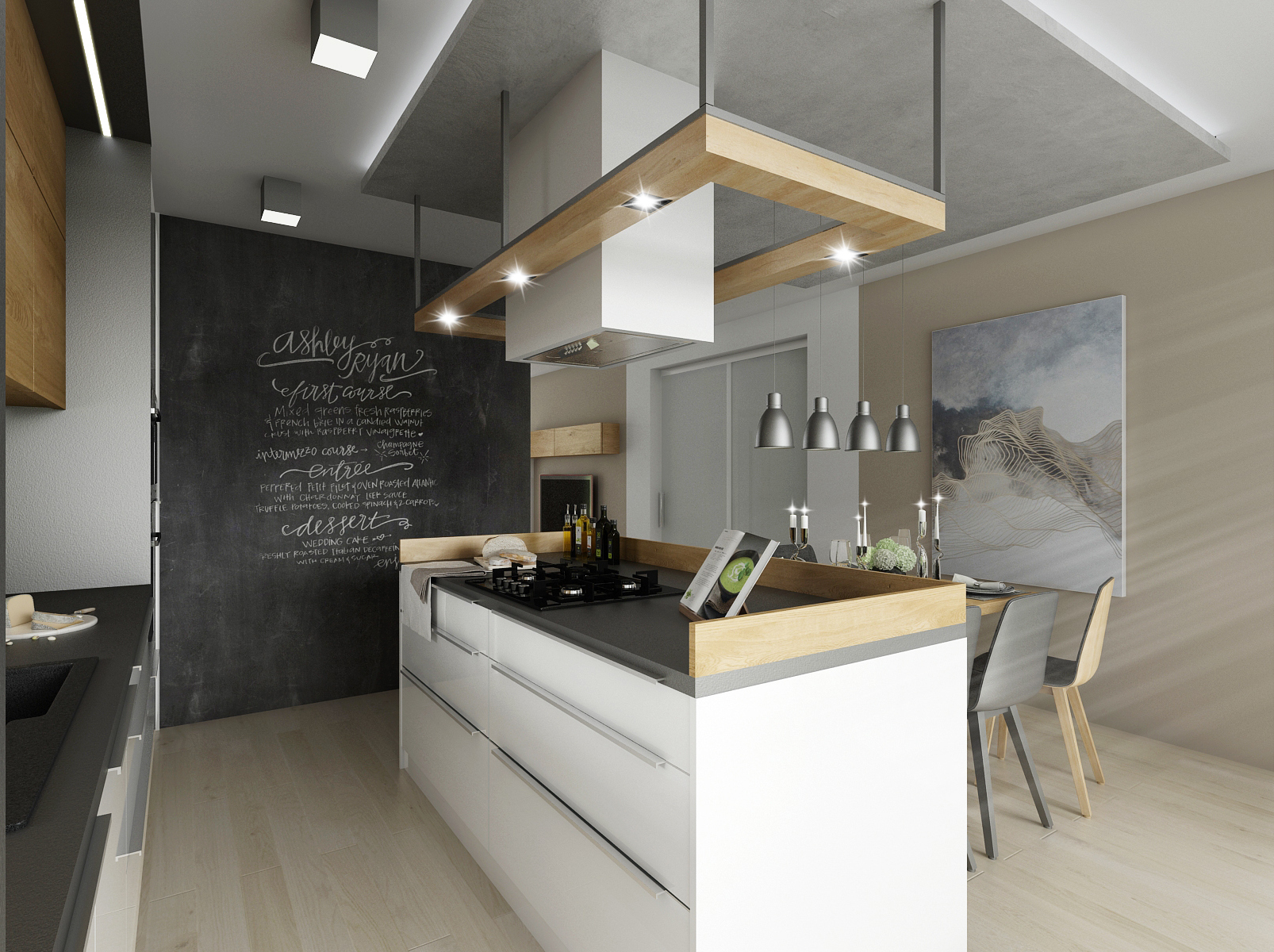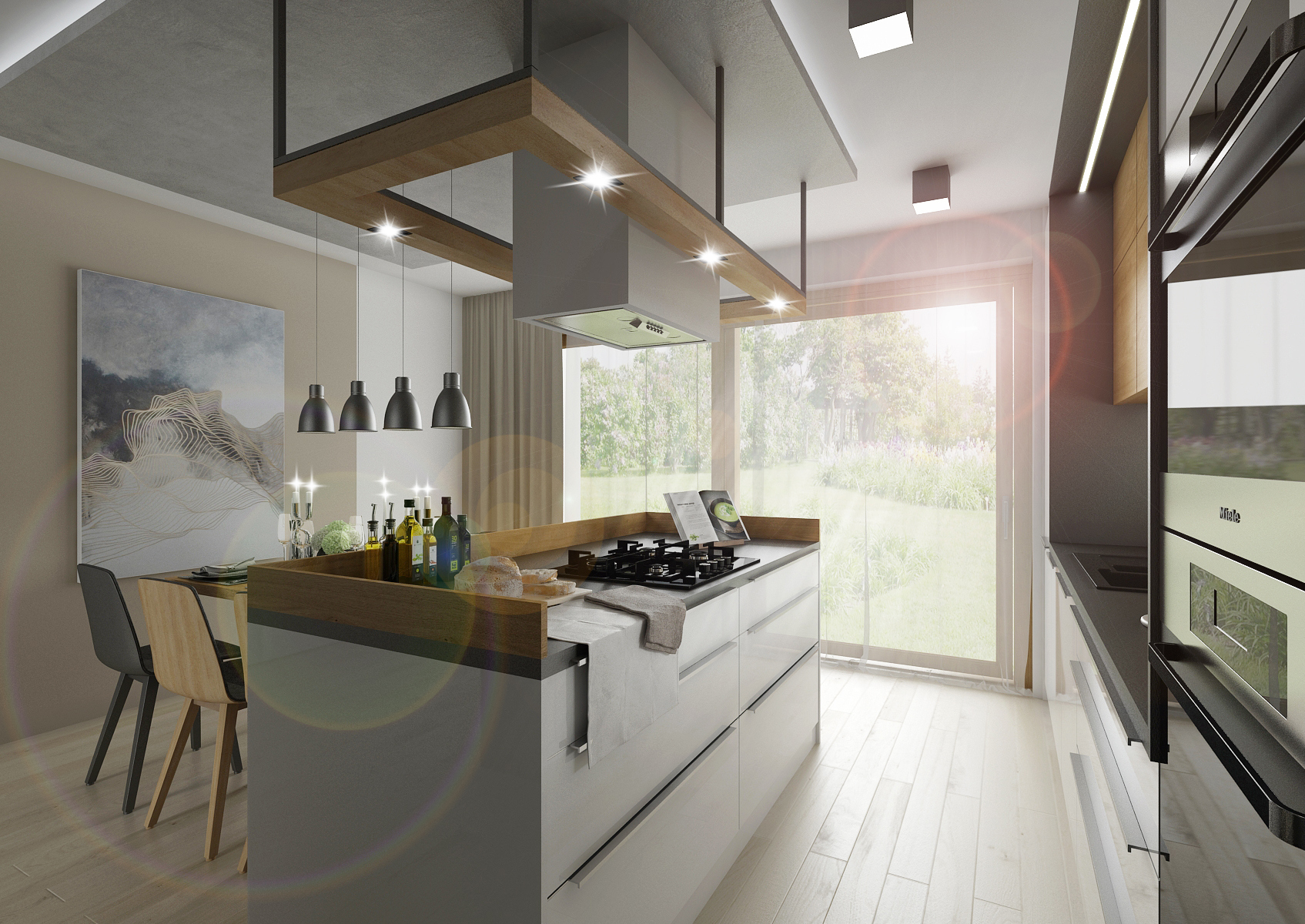 The kitchen unit in white gloss is completed by veneered upper cabinets inserted between the technological columns. The upper cabinets are without handles, opening Tip-on. The lower cabinets and pull-outs open easily thanks to the so-called impact aluminum profile. A space extractor and a decorative light ramp, which are the size of a kitchen island with a gas hob, are hung on the backlit ceiling target. This variant of the hob was taken into account during the design and the gas and electricity distributions were brought to the island in the floor.