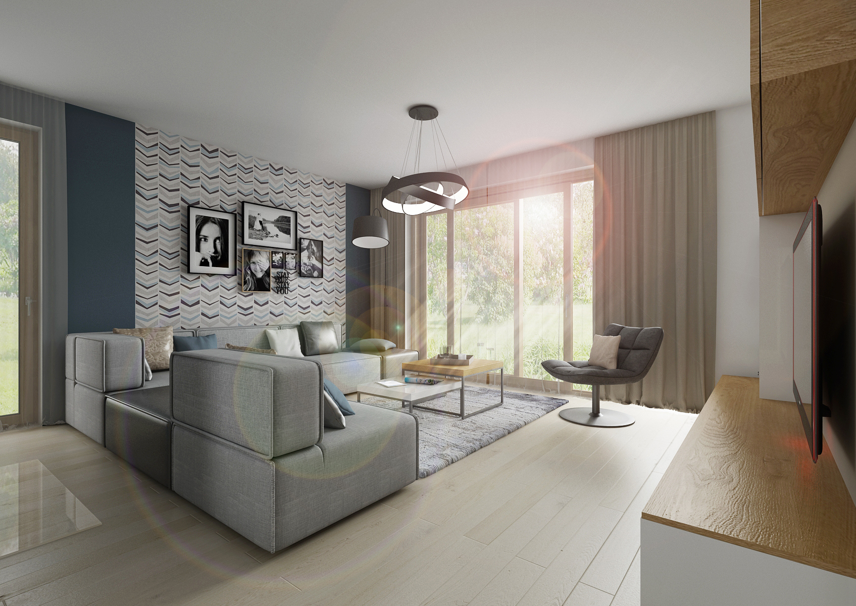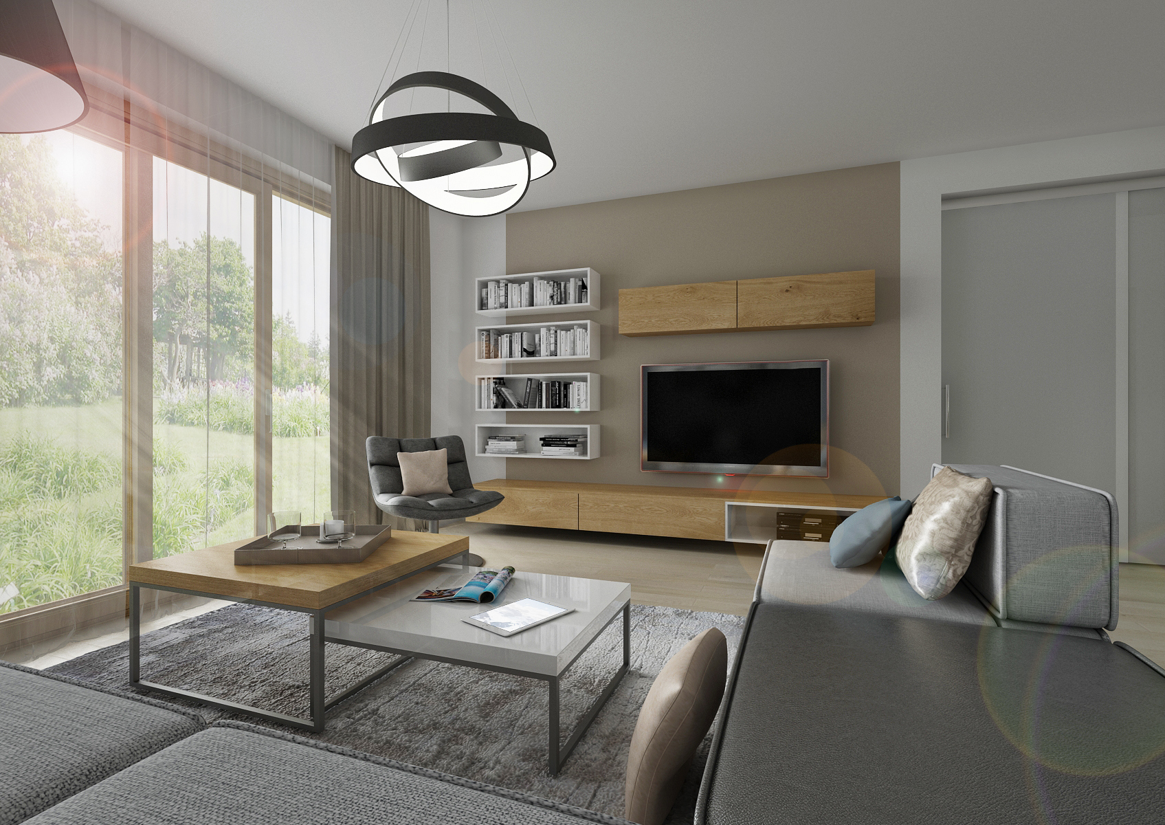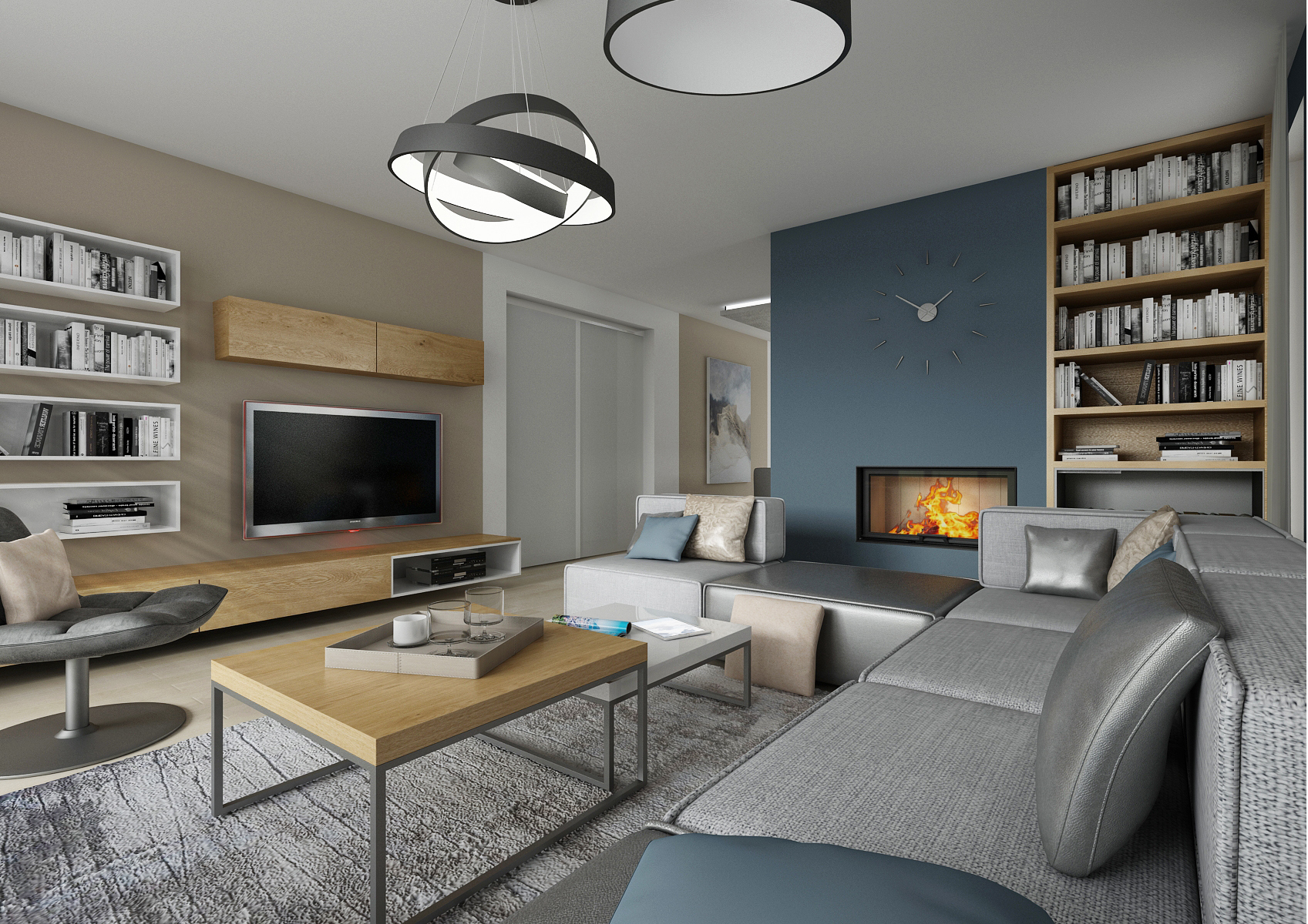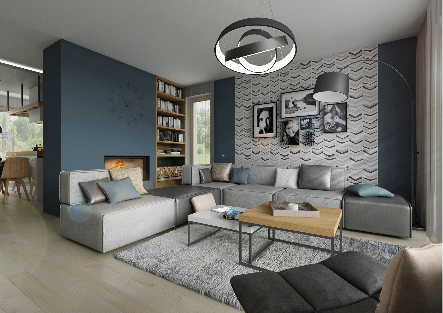 The simple rectangular space was divided with a wall with an integrated fireplace, a niche for wood and an indispensable library reaching to the ceiling. The living room consists of only a minimum of furniture. The sofa can be modified as needed. It is a modular set of the Italian brand Bonaldo. An interesting element is the designer ceiling light.