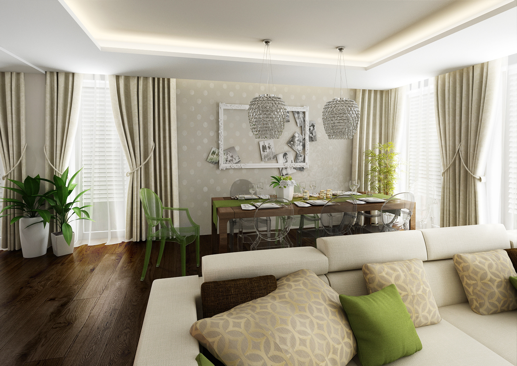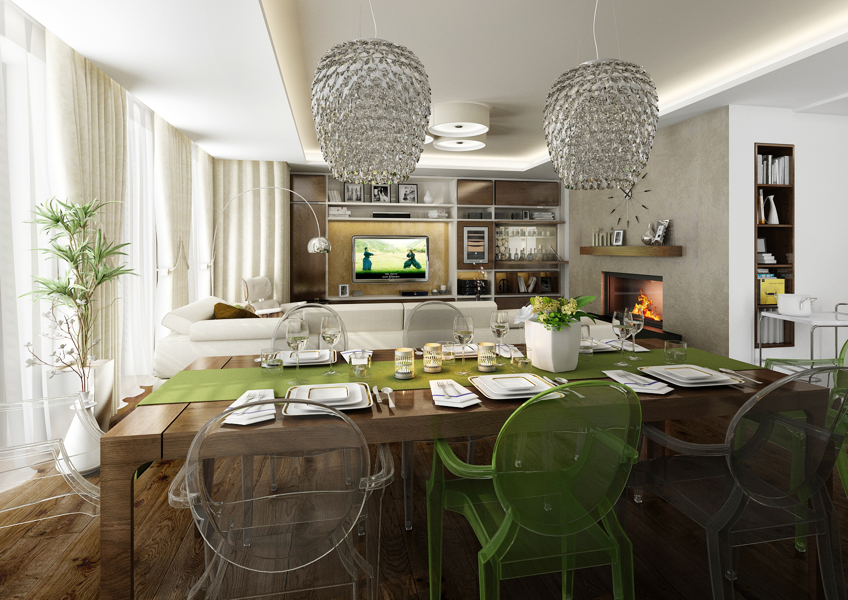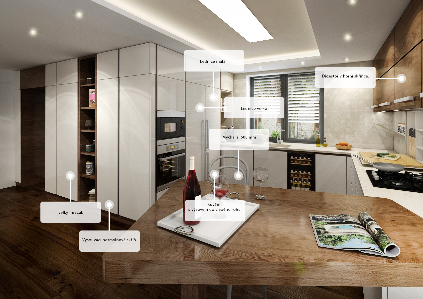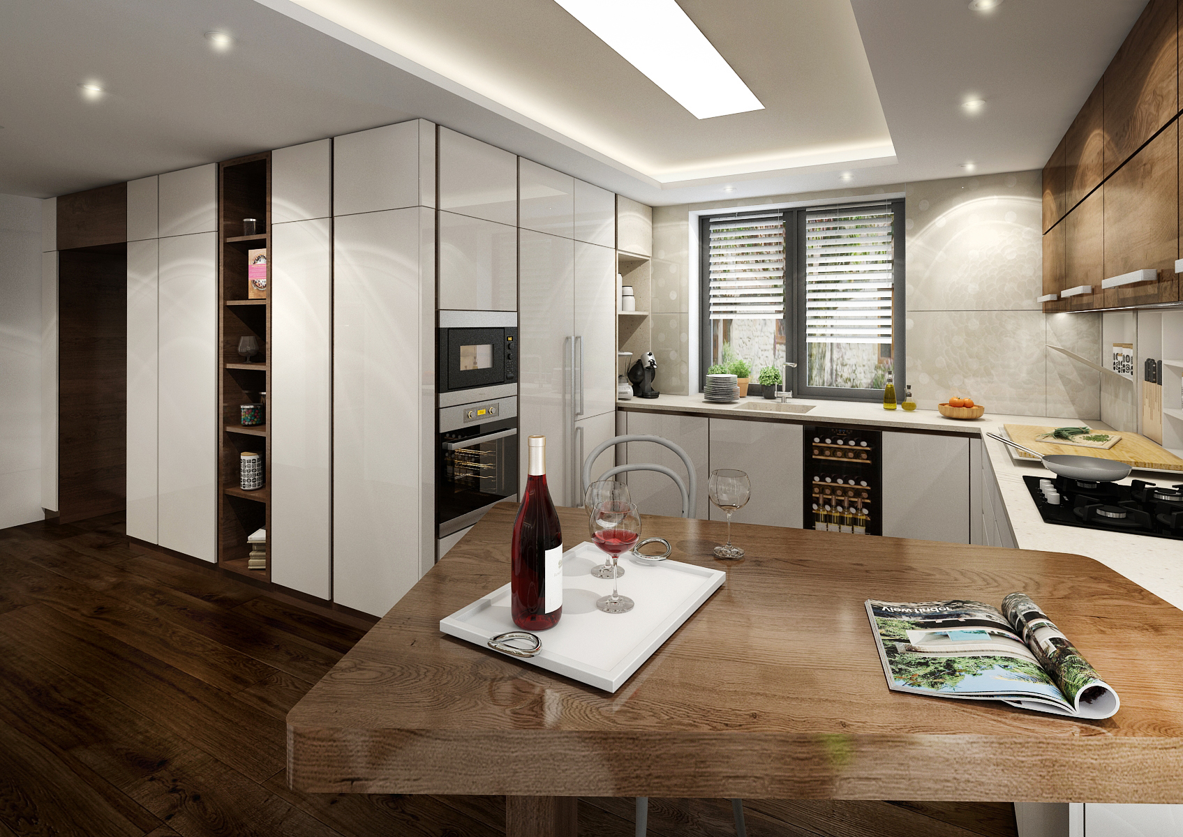 Luxurious kitchen area with solid dark stained oak plank floor. A worktop is made of an artificial stone with Lacobel glass cladding, which took the wallpaper graphics from the dining table. Part of the tiling is magnetic and hides a folding space for kitchen details. The line is followed by an atypically shaped bar table with TON chairs.