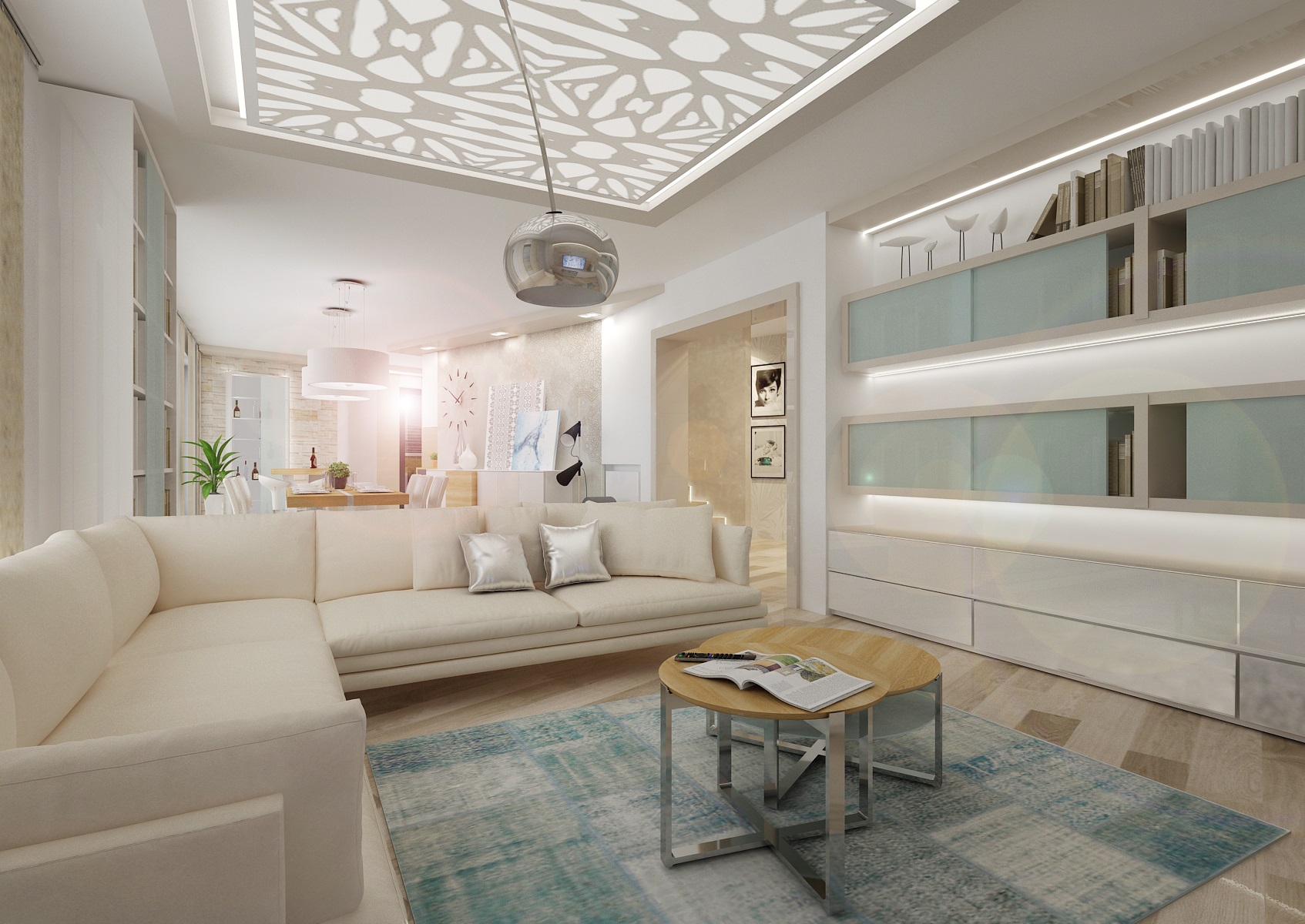 An attractive decoration is a patterned backlit panel above the living area.