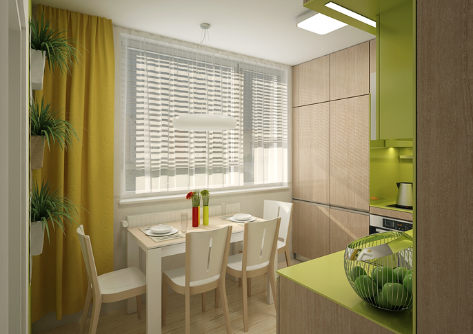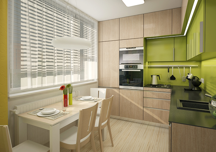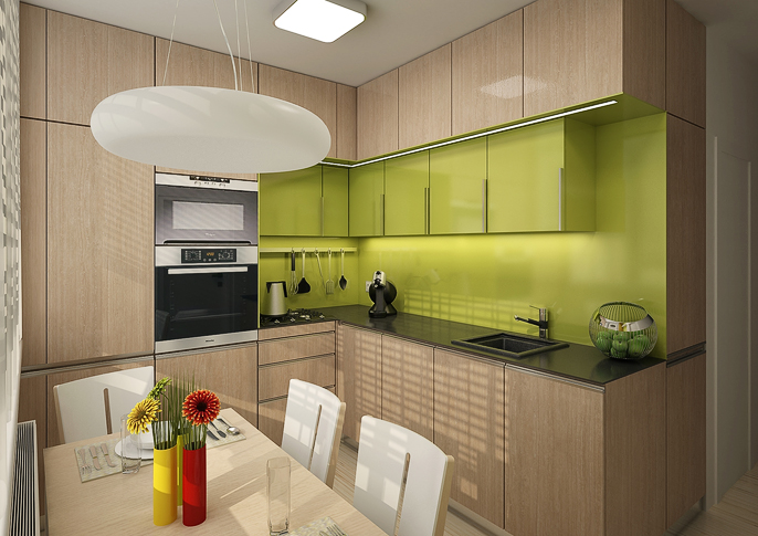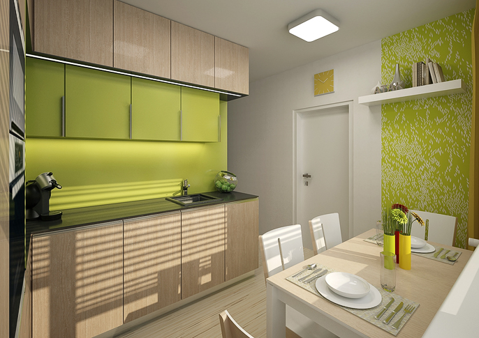 The design of the kitchen unit in an apartment building is makes makec maximum use of the specified small space. The lime-colored tiling in combination with light veneer looks fresh.