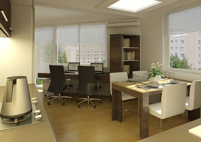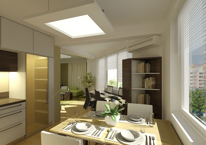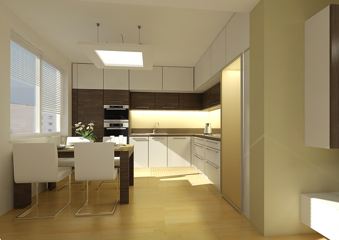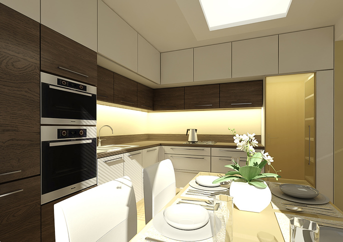 Renovated kitchen in a modern style. Combination of white color and wood pattern in a dark shade. The work surface is illuminated by an LED strip. The upper cabinets have different depths to make the most of the storage space.
