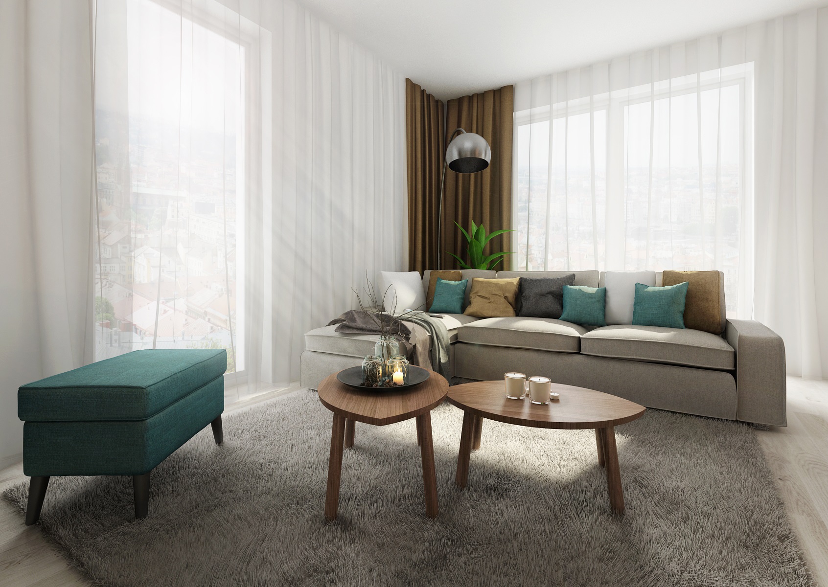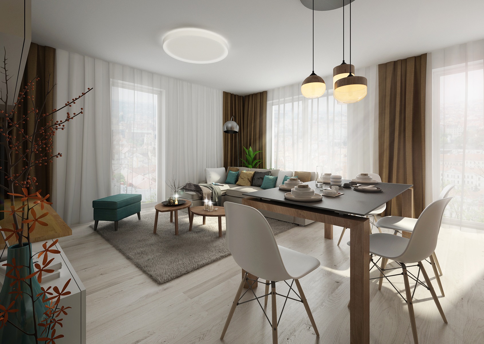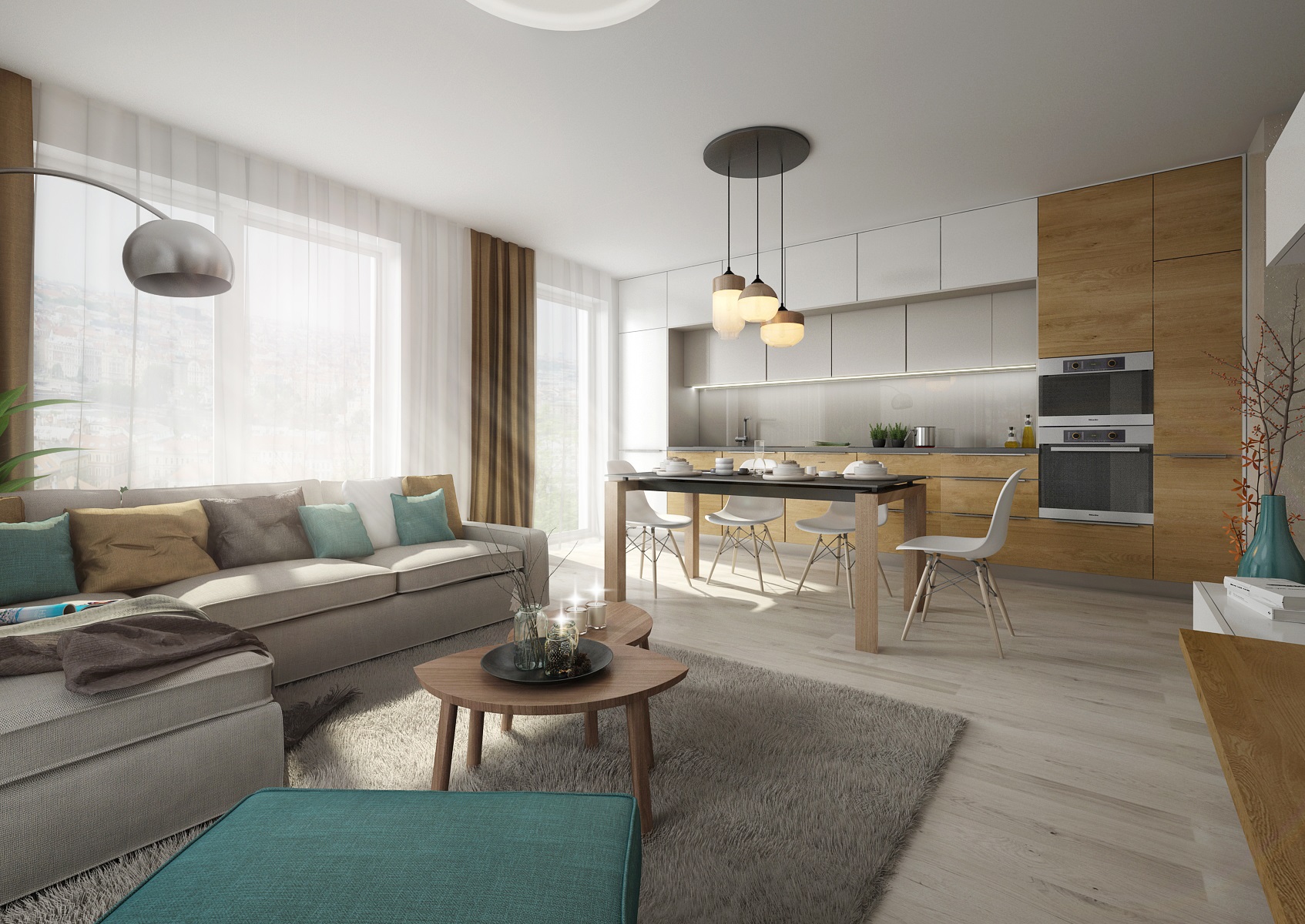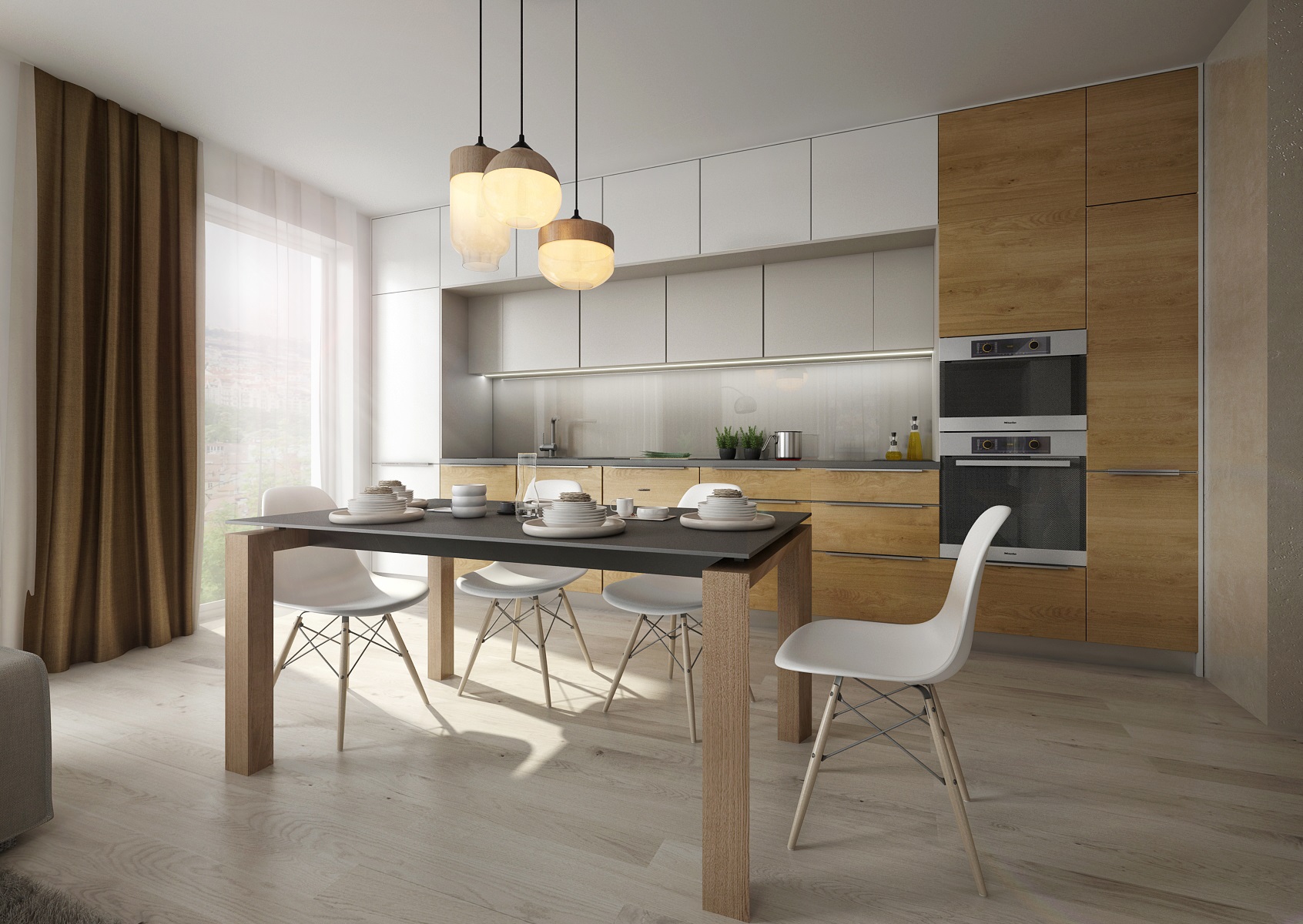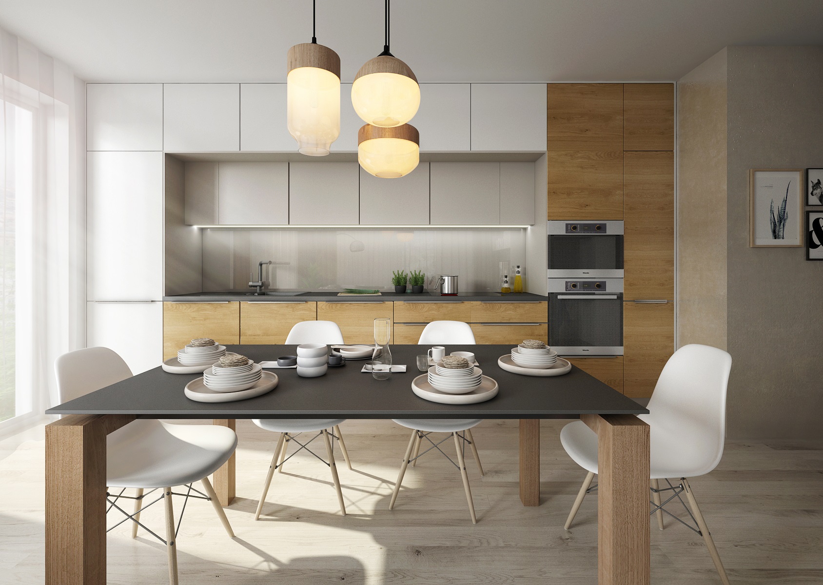 Scandinavian inspiration was reflected in the design of common areas of the kitchen with living room. A combination of white and more shades of gray with oak wood decor was used. The dining table top with a wooden base was also made of artificial stone used for the kitchen worktop. The simply furnished interior looks airy and cozy at the same time.