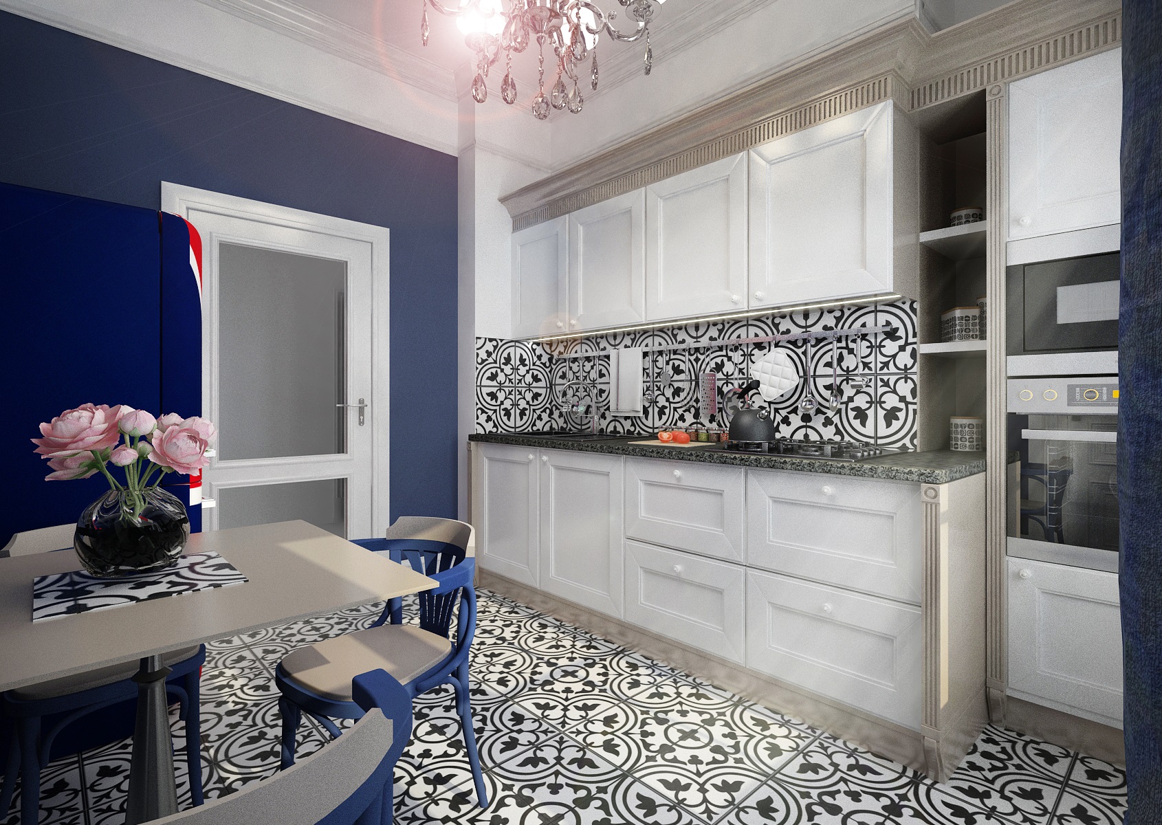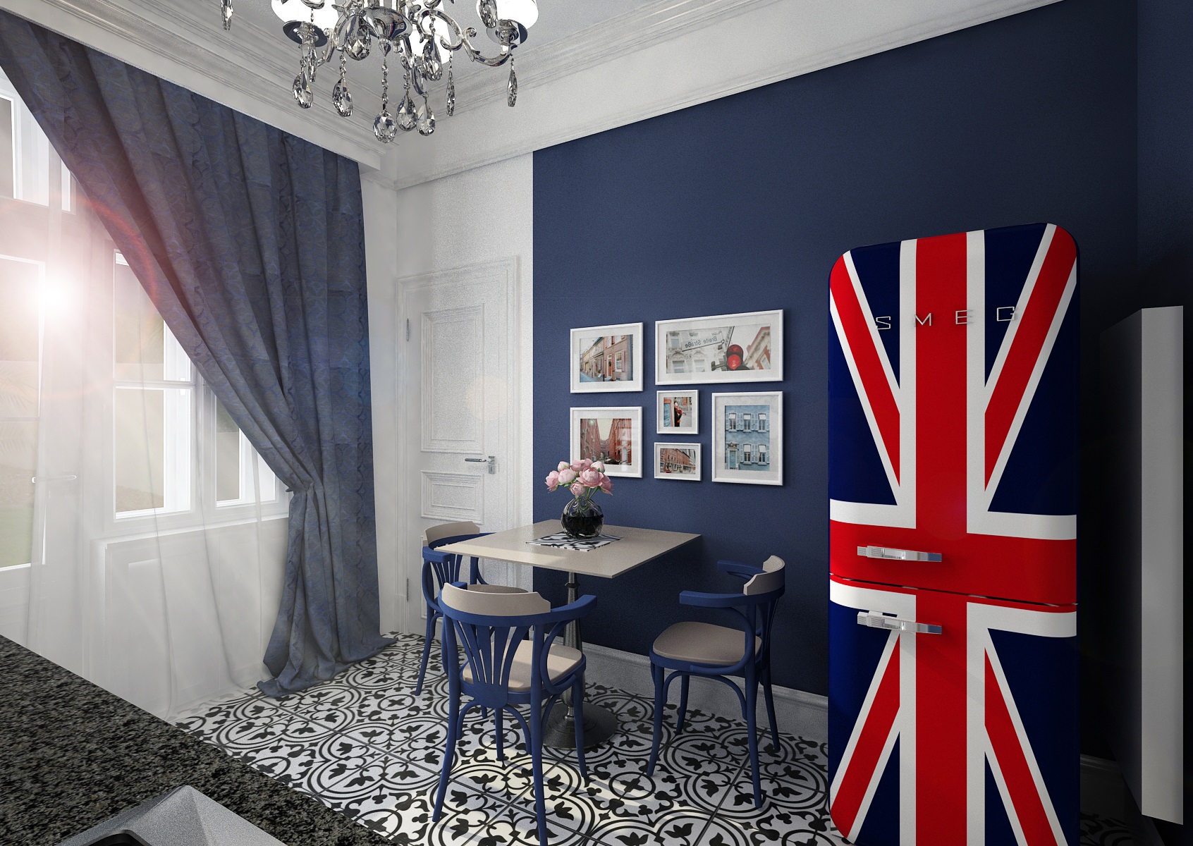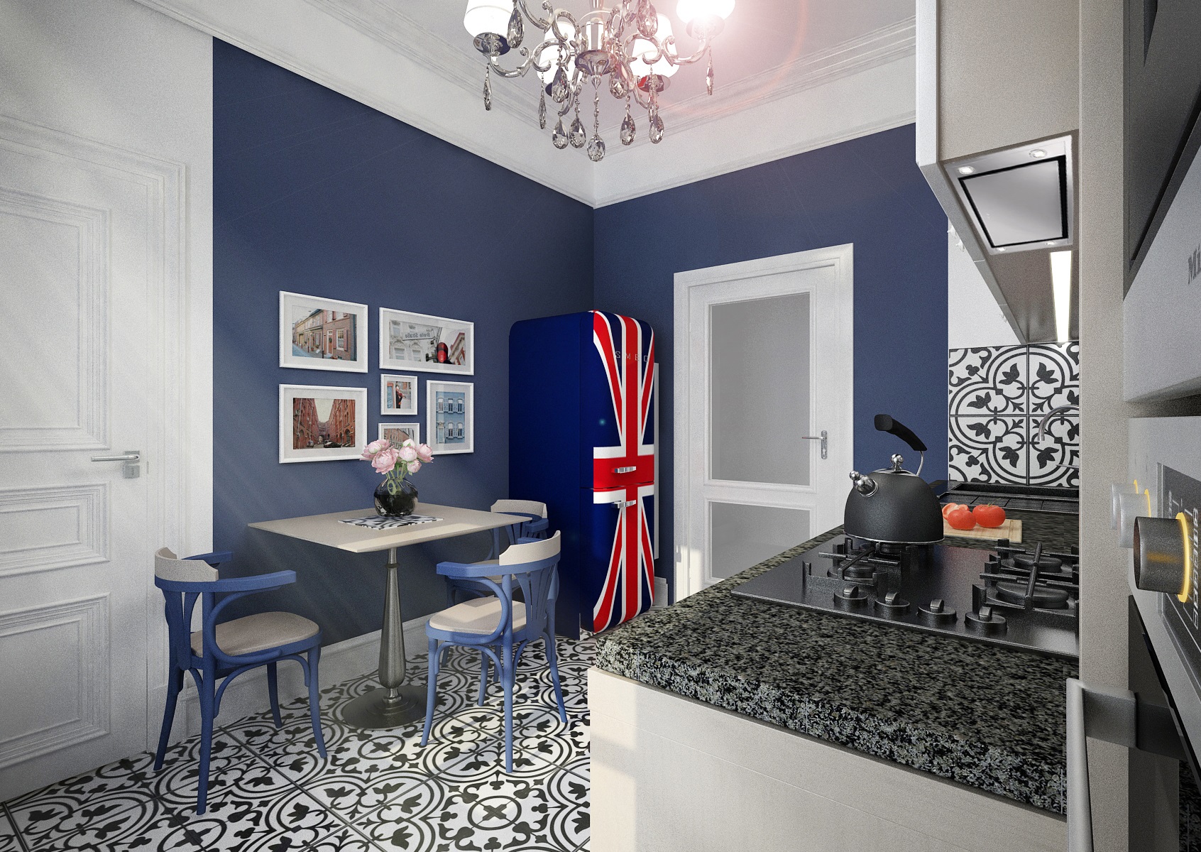 The clien wanted a suitable kitchen for the apartment in the historic house in the city center. The rich blue accent on the walls unfolded from the iconic retro refrigerator of the SMEG brand with distinctive Union Jack print. This is complemented by the light design of the kitchen unit, assembled in a simple line with decorative elements such as decorative top ledges and side columns. There is also a type-suitable granite worktop and tiles with a distinctive drawing. We will sit on the TON No. 56 chair in the corresponding color at the table. And the highlight of the interior is the perfectly matching crystal chandelier.