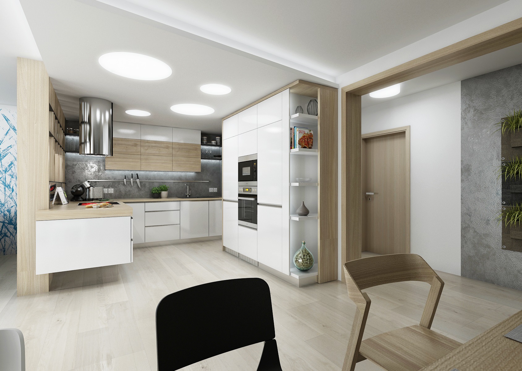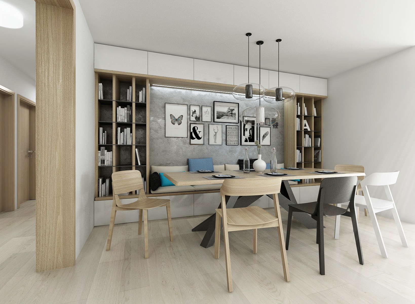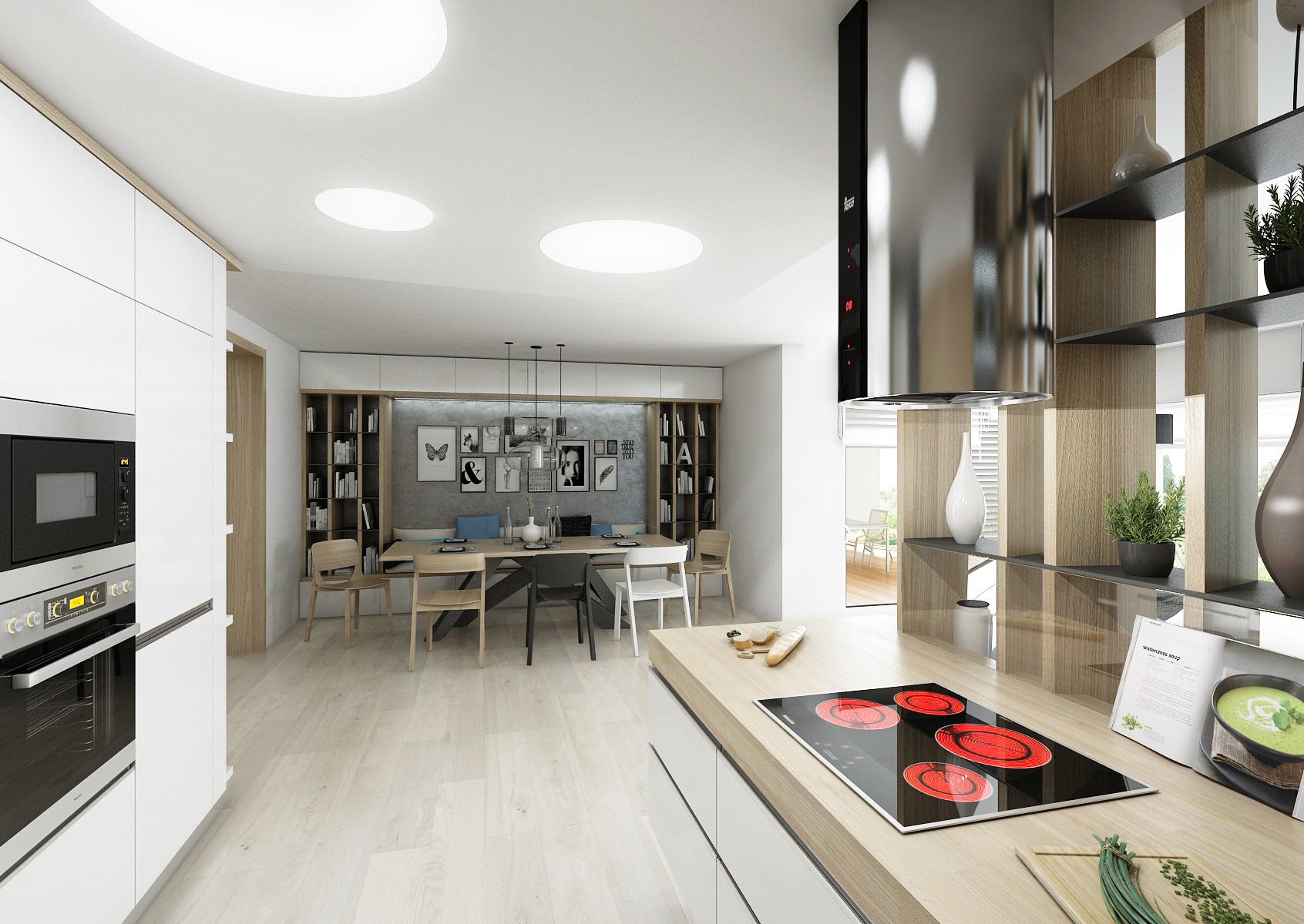 living area by a shelf system / library, which is accessible from both sides. It is a decorative and practical element that makes the room attractive. A part of the kitchen unit with a hob hanging into the space is hung on the shelf, which looks more airy thanks to the use of a glass base. The kitchen space is also defined by a lowered ceiling. The shelf design is repeated on the design of the built-in cabinet with a bench at the dining table.