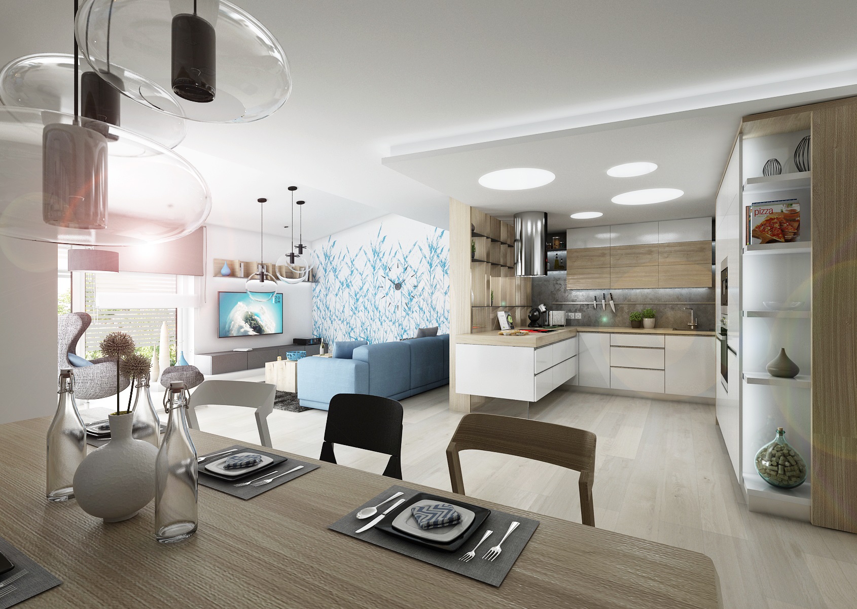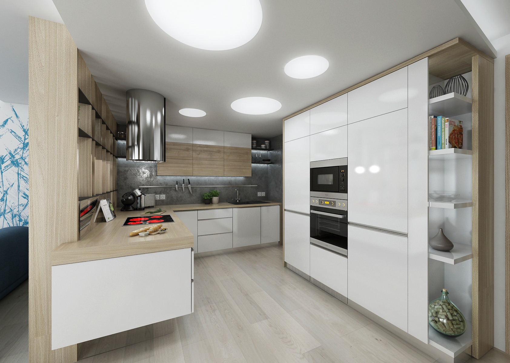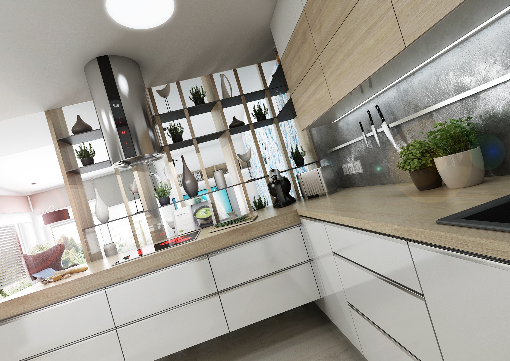 living area by a shelf system / library, which is accessible from both sides. It is a decorative and practical element that makes the room attractive. A part of the kitchen unit with a hob hanging into the space is hung on the shelf, which looks more airy thanks to the use of a glass base. The kitchen space is also defined by a lowered ceiling. The shelf design is repeated on the design of the built-in cabinet with a bench at the dining table.