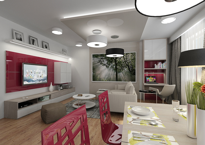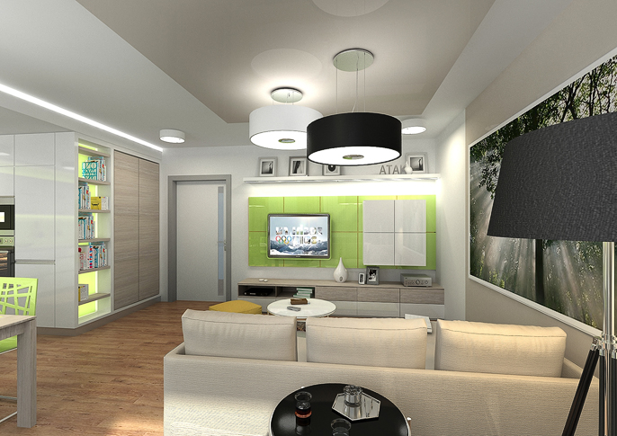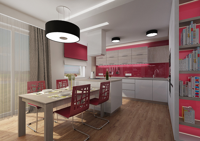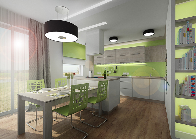Kitchen with living room in a family house in two color variants. In the kitchen and living area, colored glass lacobel, bleached oak, white and cream shades of paintings, sofas, etc. appear on the tiles.