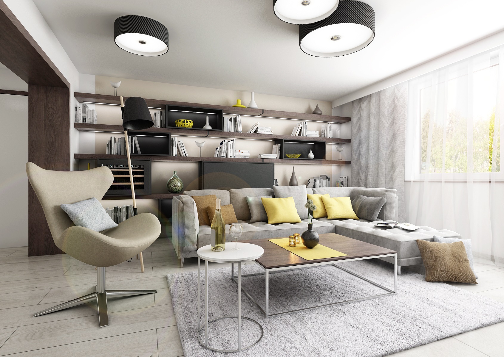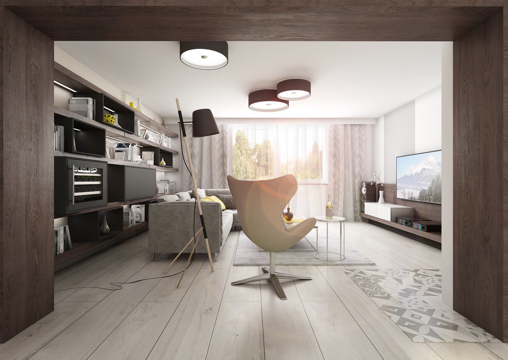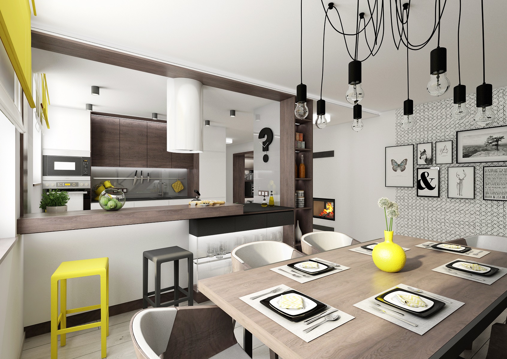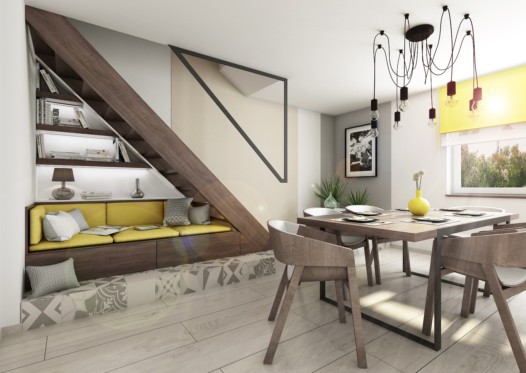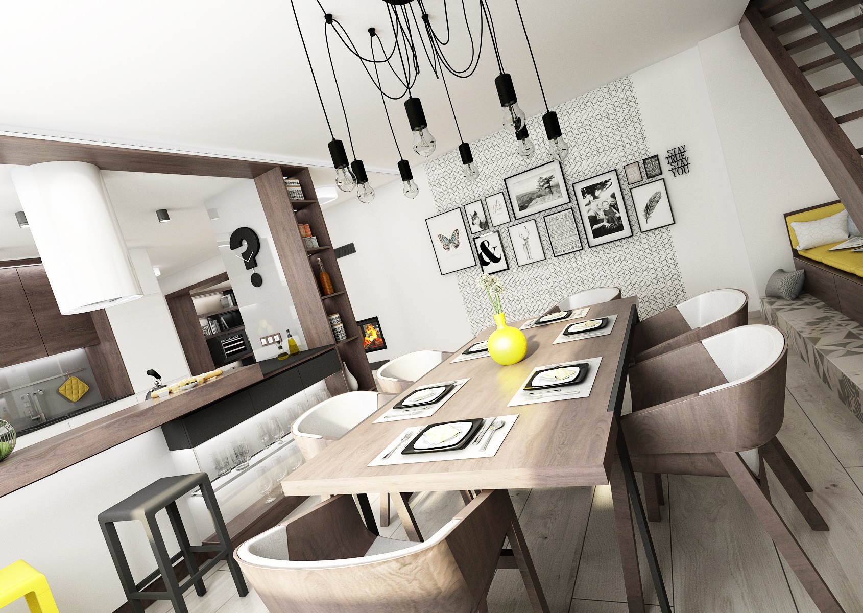 The initial task of the reconstruction of the kitchen with a dining room was subsequently extended by the requirement to restore the living room and the staircase to the first floor, which rises from the dining area. The ground floor is dominated by white, which in contrast is complemented by a dark brown walnut decor with a few accents of black and yellow. The kitchen consists of two parallel kitchen units, the hob is turned into space, bounded by a bar counter and terminated by a column with shelves. The column had to be preserved as a supporting element and, together with the ceiling cladding on the island, optically divides the space. The dining table is custom made from a plate with walnut veneer and a metal base. Its design is also reflected in the form of railings on the stairs, unusually lowered from the ceiling. A cozy reading corner penetrated beneath them.