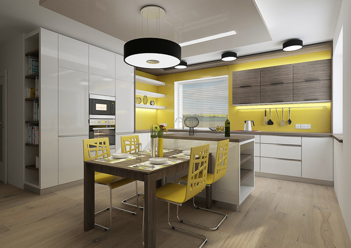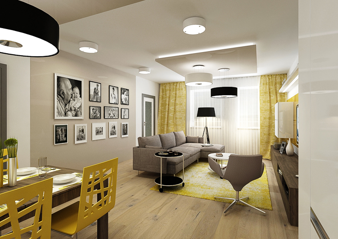 The living room, which is connected with the kitchen and dining room, is tuned to the earthy colors in combination with yellow lacobel cladding behind the kitchen unit and the TV, and other yellow accessories. Doors of the kitchen cabinets are in white in combination with wenge.