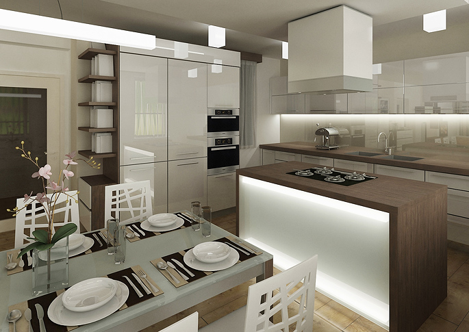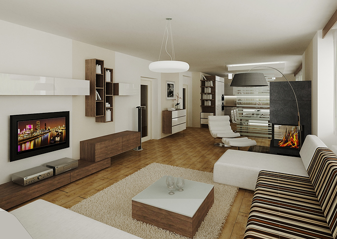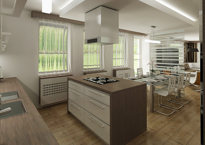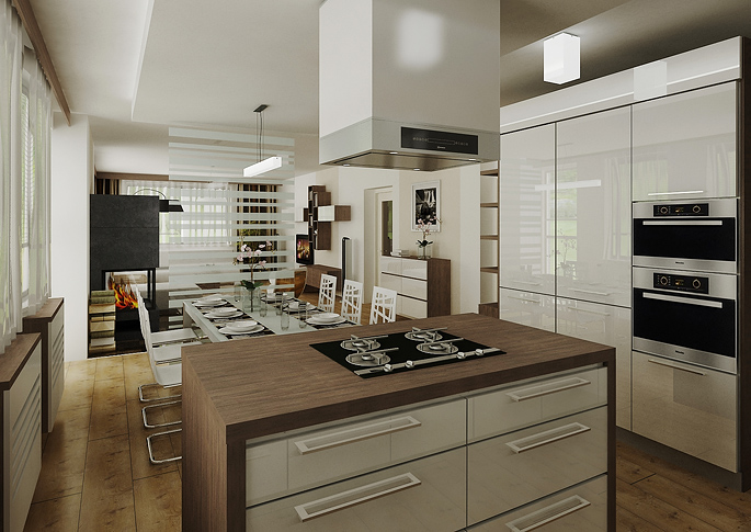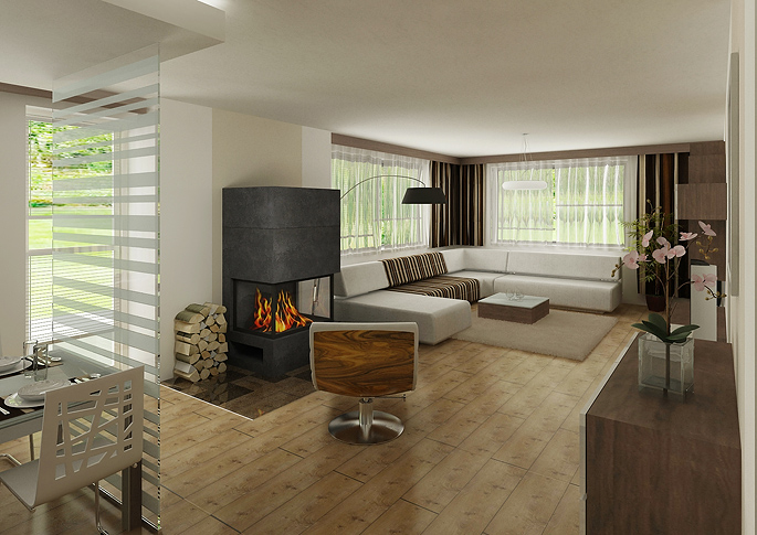 The living room in the family house is part of a large free space. The central role is played by a large corner sofa. A lot of daylight penetrates into the space. A fireplace and a number of tasteful accessories can not be missed.Thanks to the light colors, the space looks modern and clean.