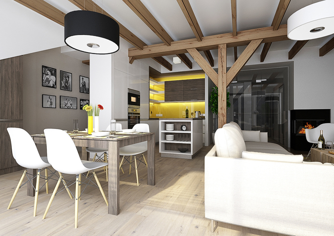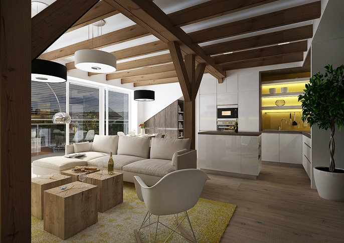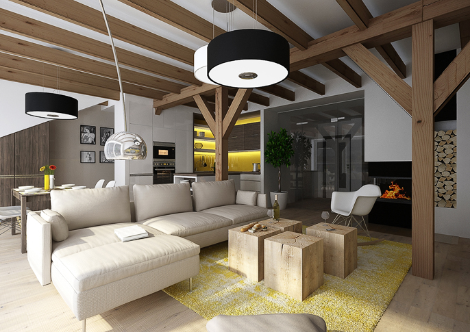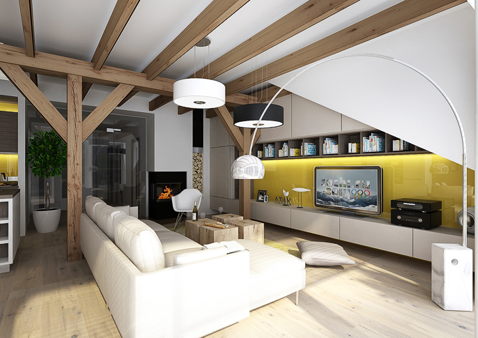 Design of a living room in the attic. The color combination is complemented by yellow in earthy tones. There are LED strips on the top of the wooden beams that intersect the entire space and are used to create indirect intimate lighting.