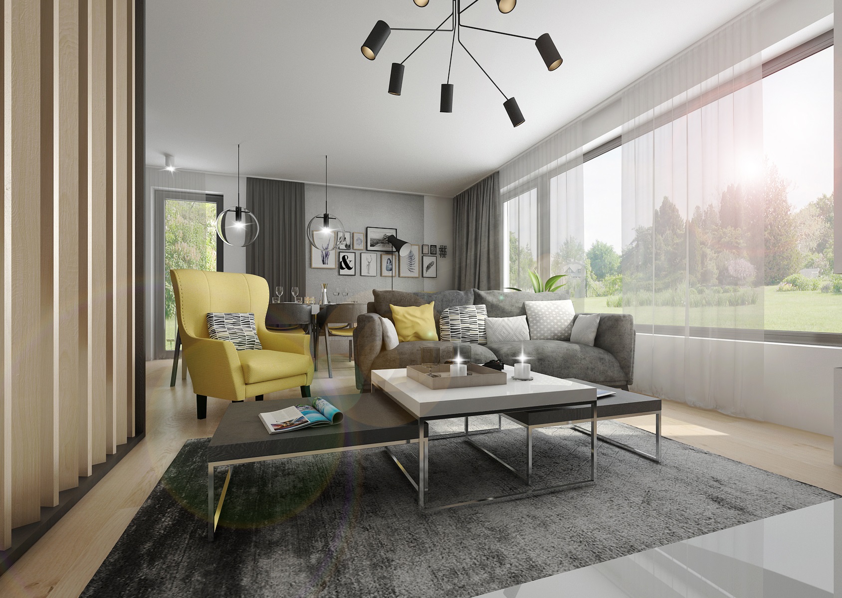The Merano armchair with distinctive yellow upholstery differs in color from the rest of furnishing. And this is also repeated on TON dining chairs.