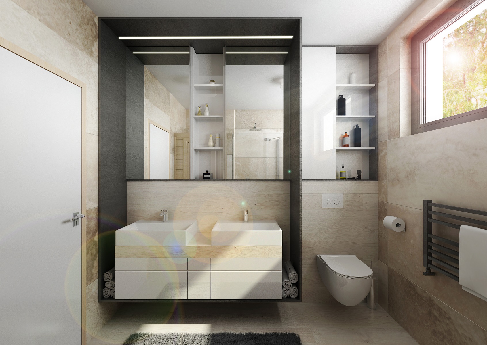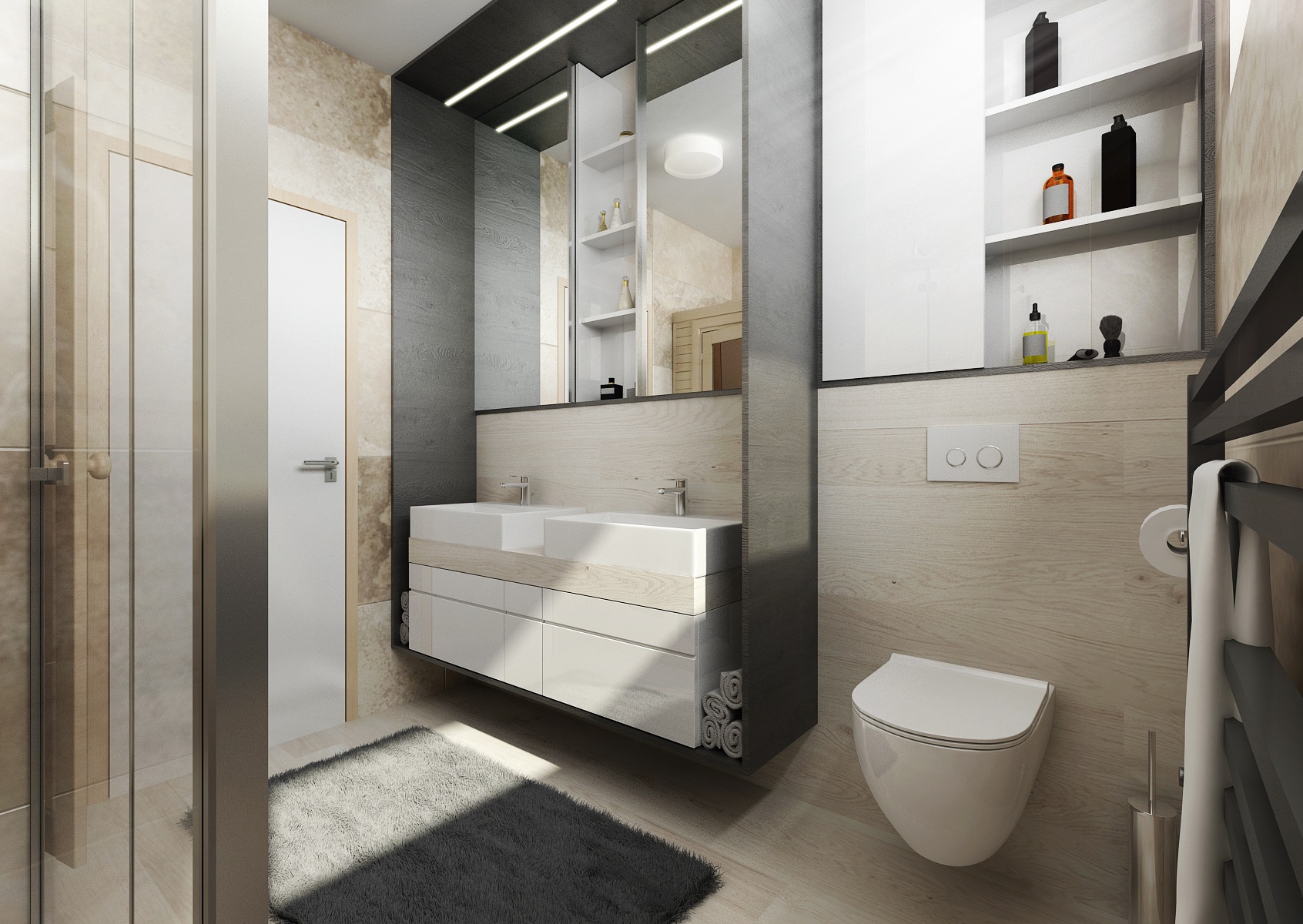 A bedroom and a bathroom upstairs were designed by using the same material. The floating floor in the bathroom was replaced by ceramic tiles imitating wood.