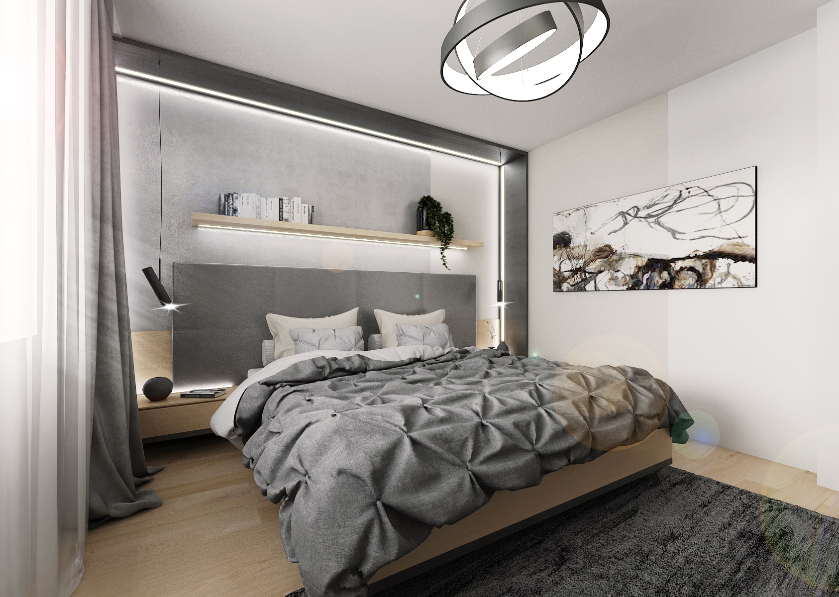 The combination of matte black with structure and white in high gloss, softens shades of gray and especially natural maple, which was also chosen as the decor of the floating floor. The staircase is shielded from the living space by a slatted partition - a frame with vertical chips, which are rotated on top of each other.