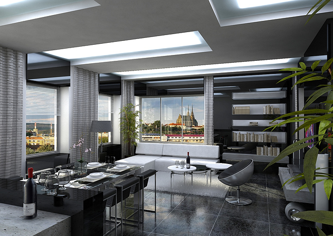 The light enters the elegant living room through numerous window areas. A black lacobel was used on the furniture in combination with gray and white decorations. Light surfaces copying the windows are built-in the ceiling.