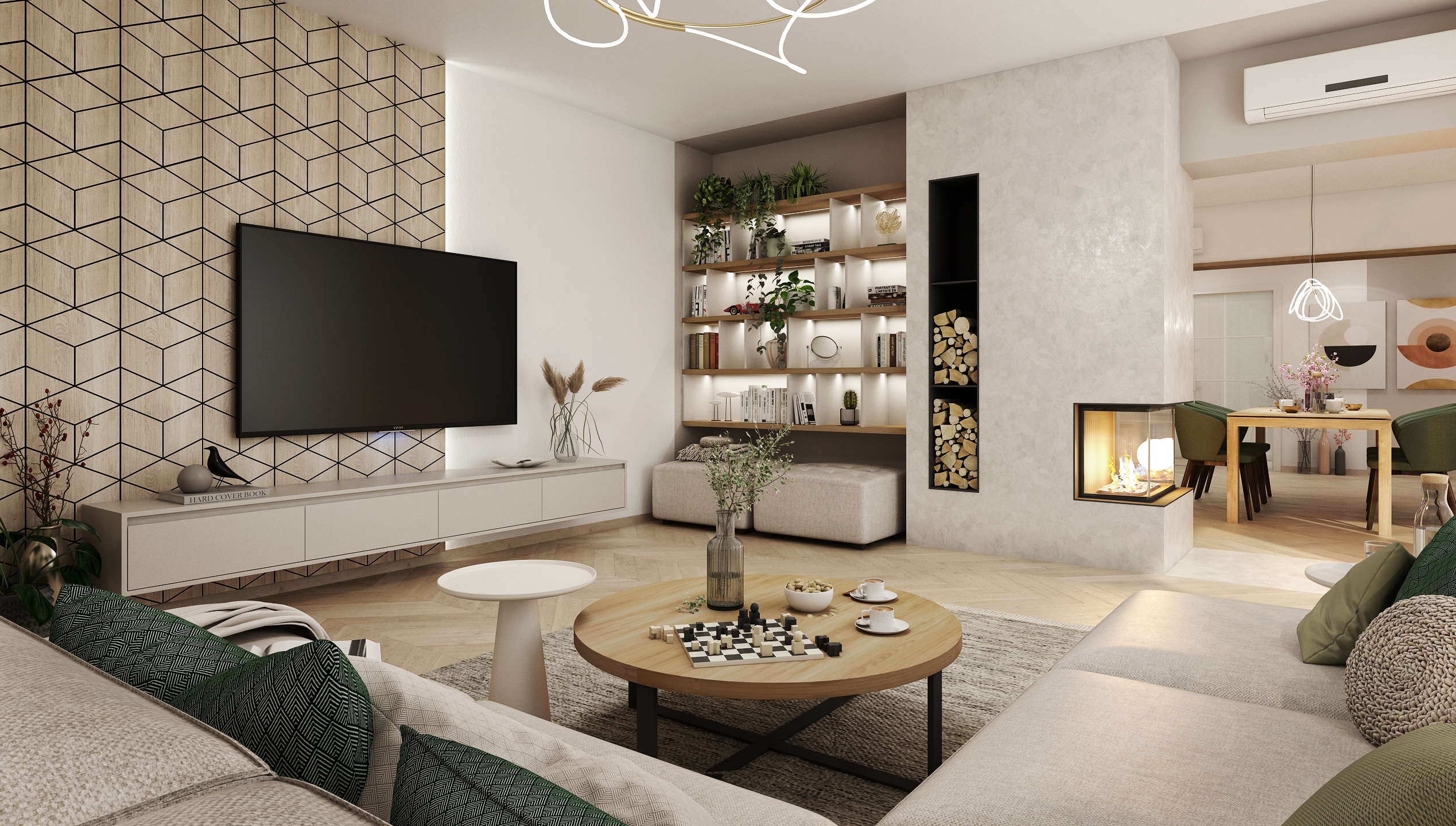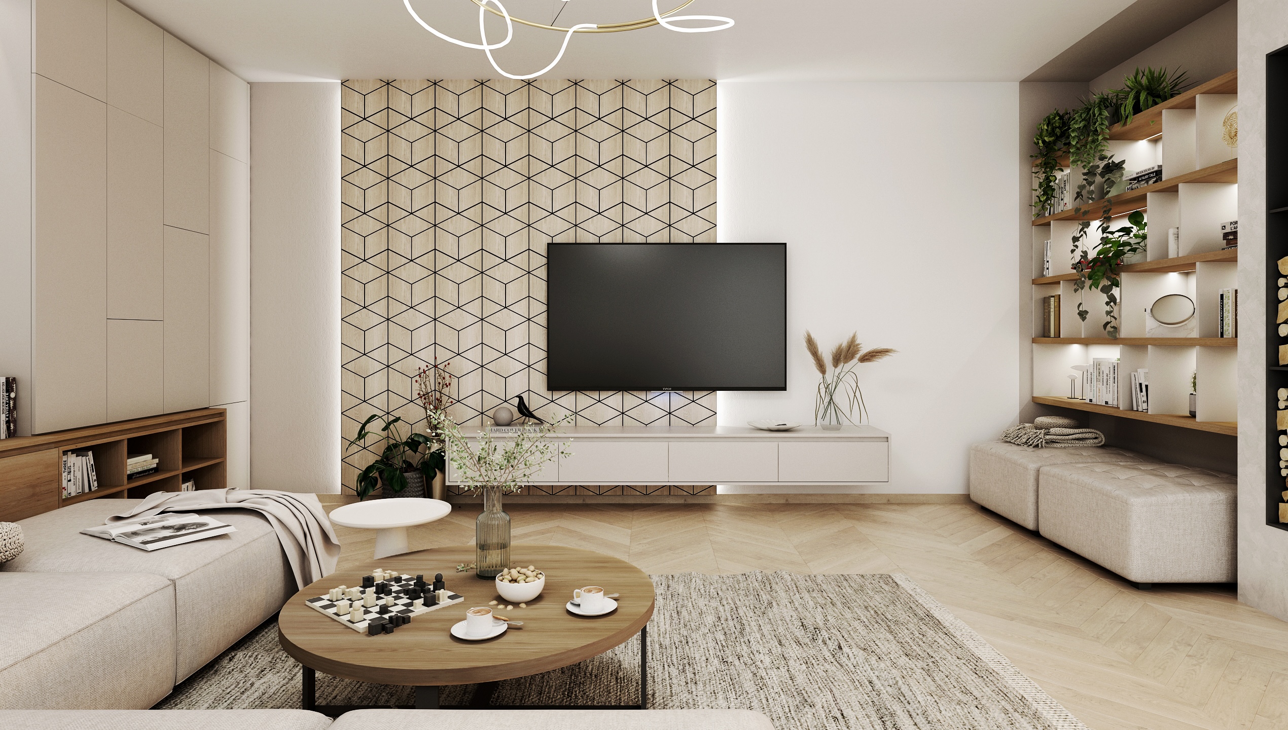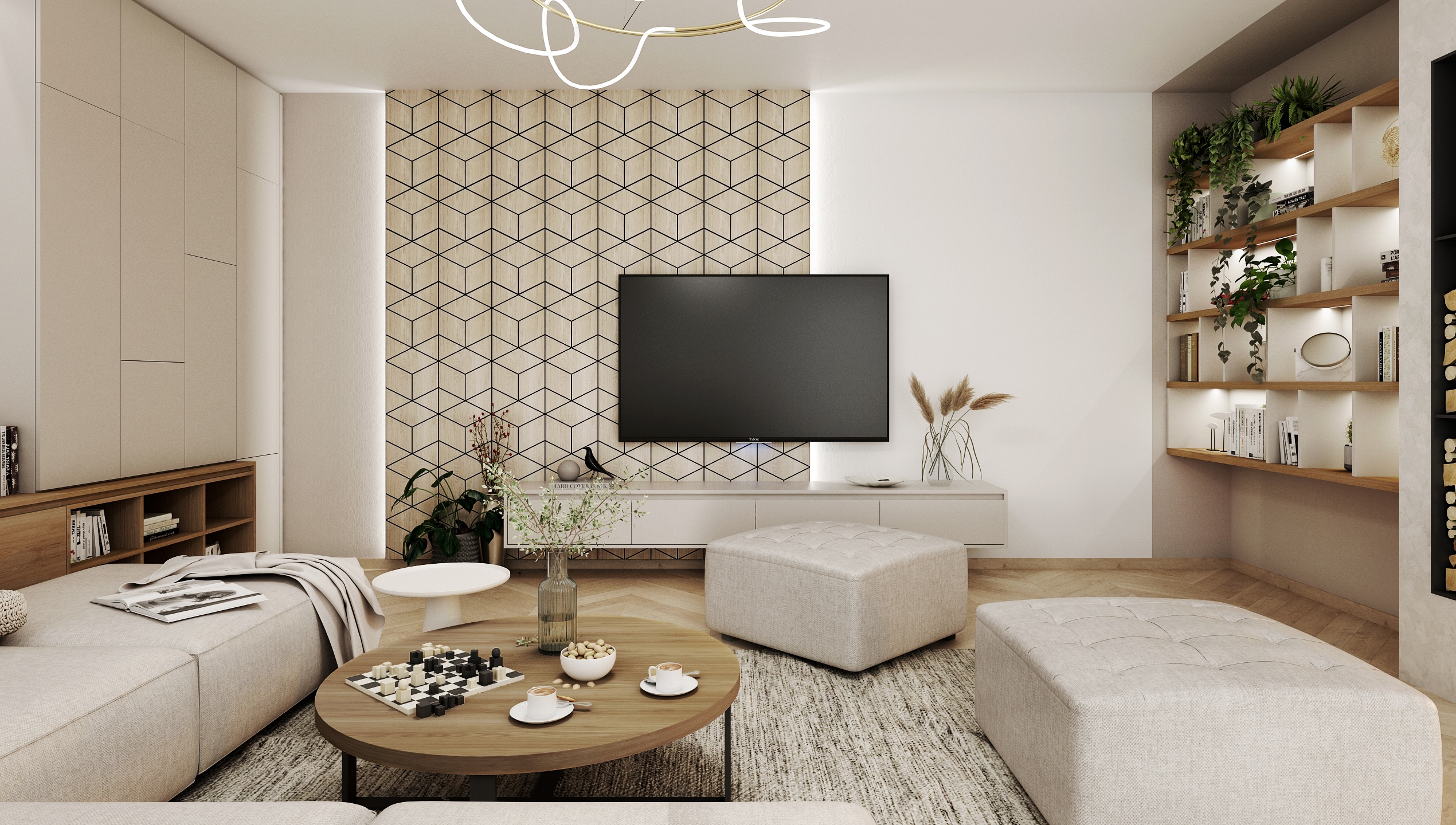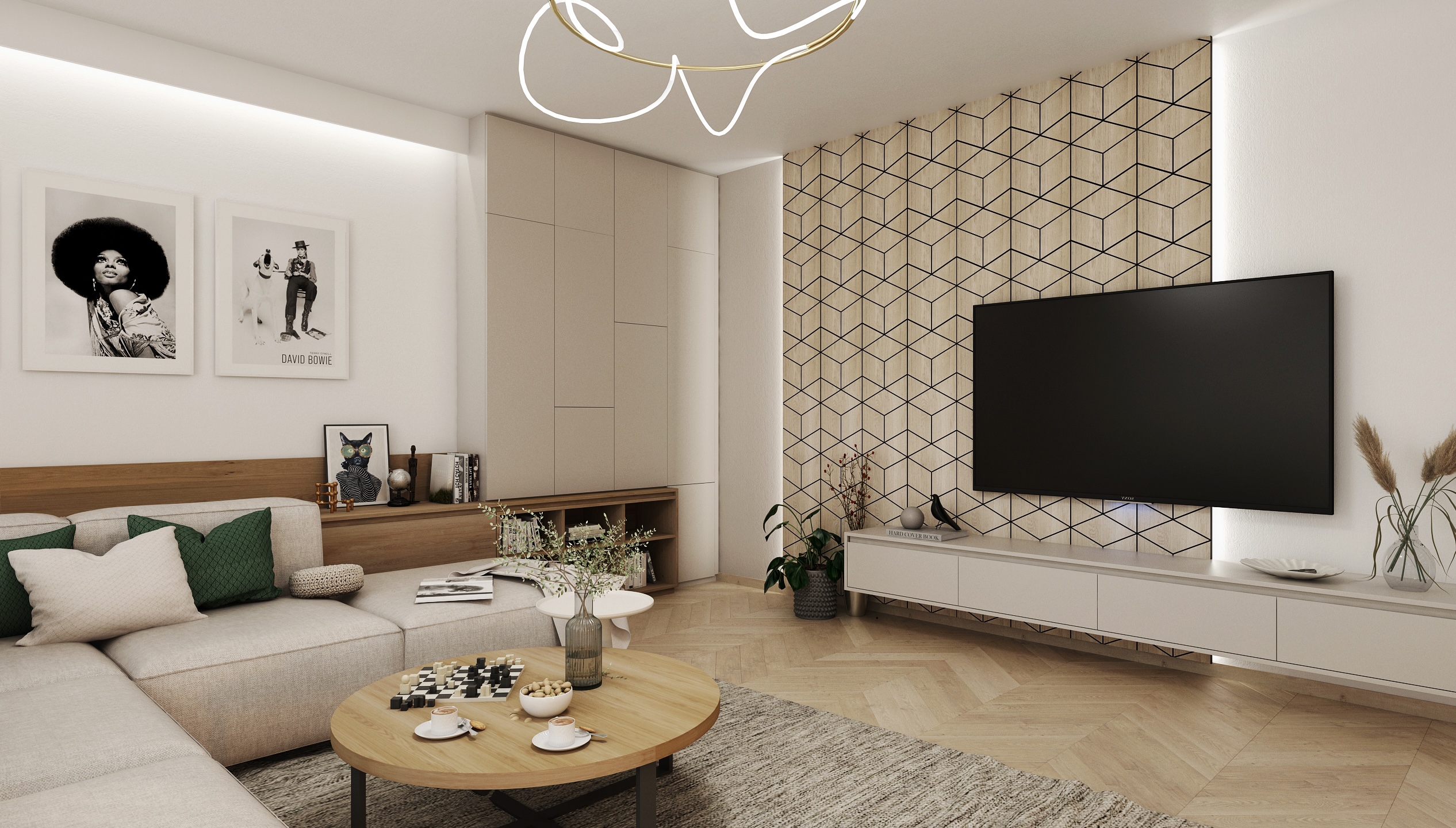 The walls are decorated with black and white photographs and geometric tiles behind the television, which add originality to the space. A modern designer light fixture on the ceiling softens the interior and brings an artistic element.