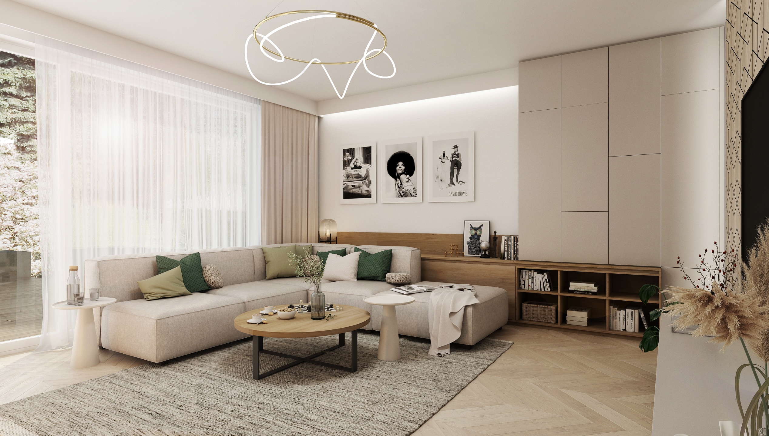 The dominant feature of the space is a large corner sofa in a neutral shade complemented by colorful pillows. Together with a round wooden table and a soft carpet, it creates an ideal place for relaxation and social gatherings.