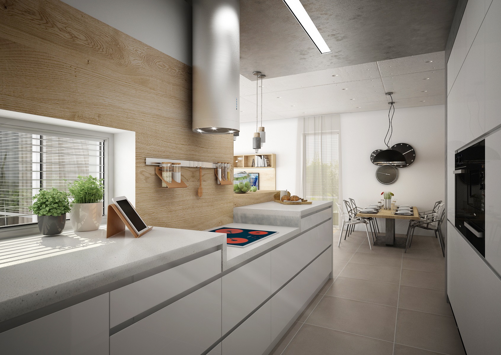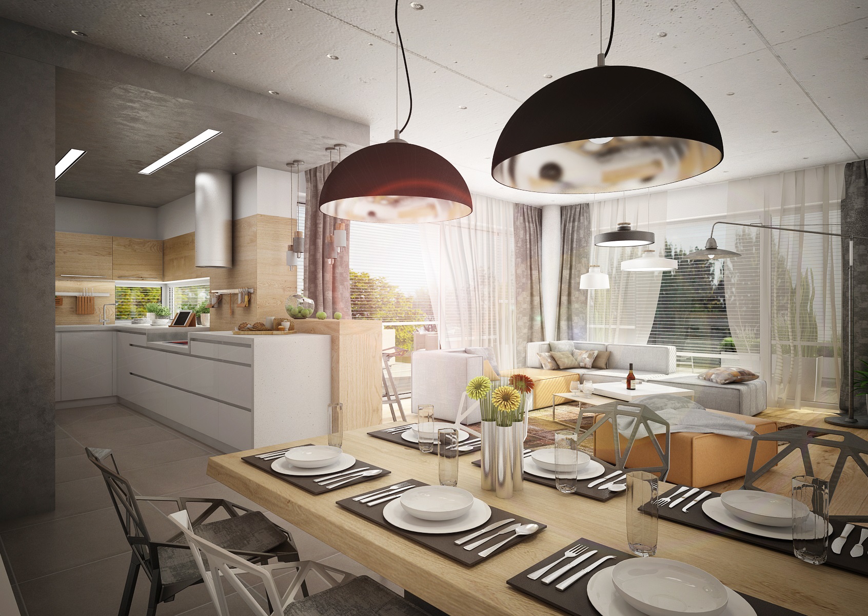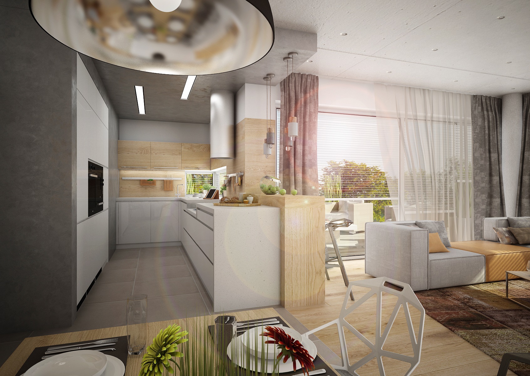 We did not have a recognized concrete ceiling in our designs for a long time. And in this modern living room with kitchen and dining room, clients wished for it. In the kitchen, the ceiling has been lowered with a spatula to remove the hood, and the worktop has a reduced height of 85 cm in place of the hob to make food preparation more ergonomically friendly.