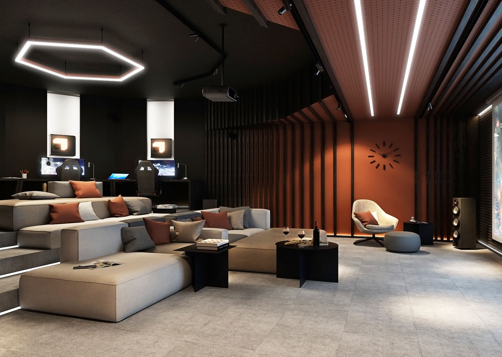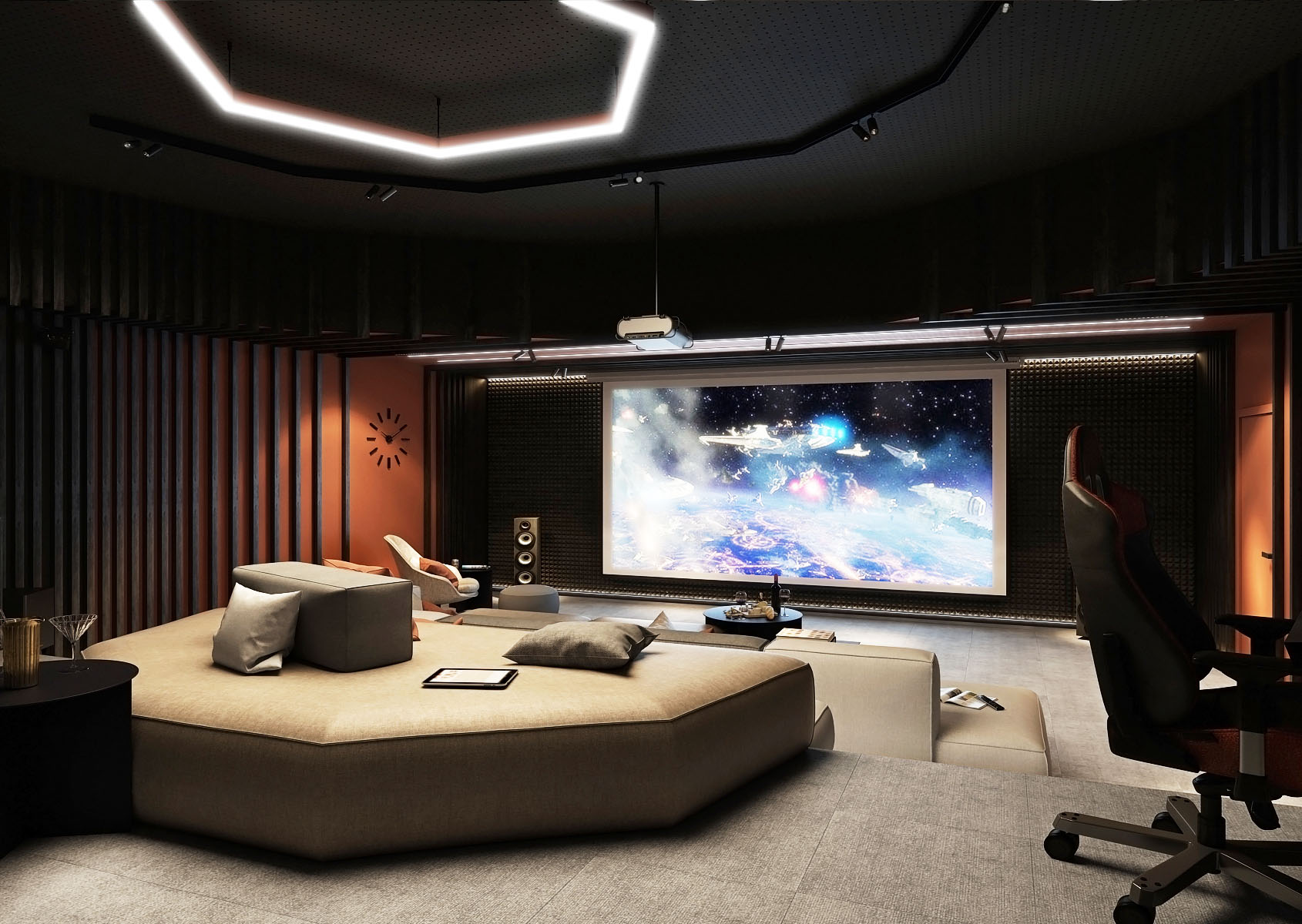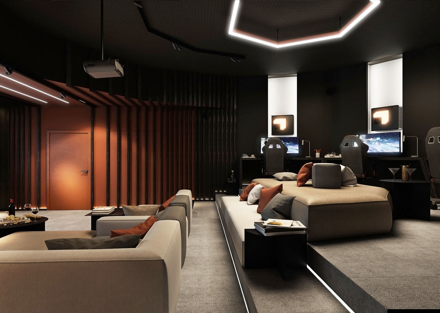 A home cinema with a game room is designed in a graduated space of an irregular room shape.