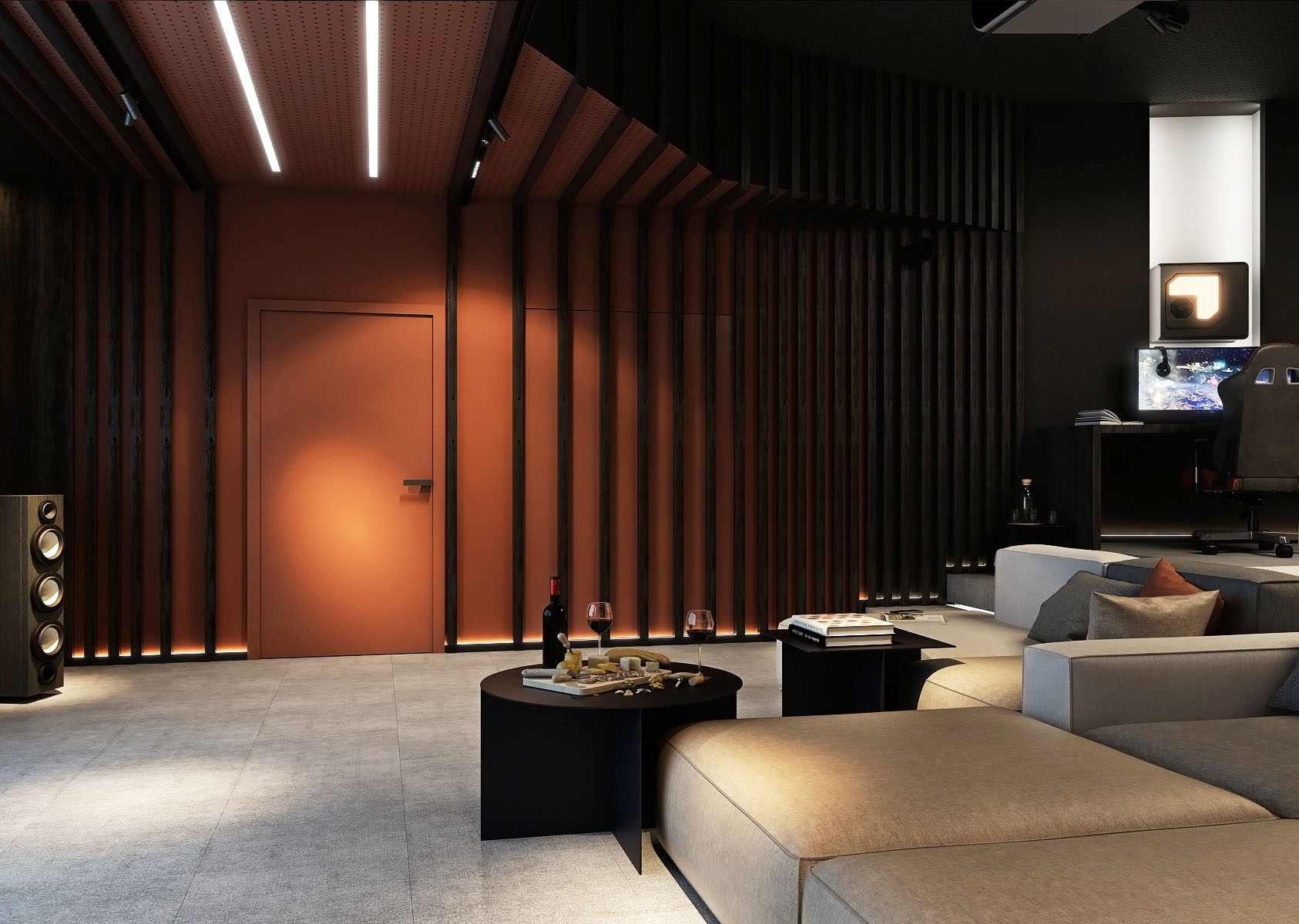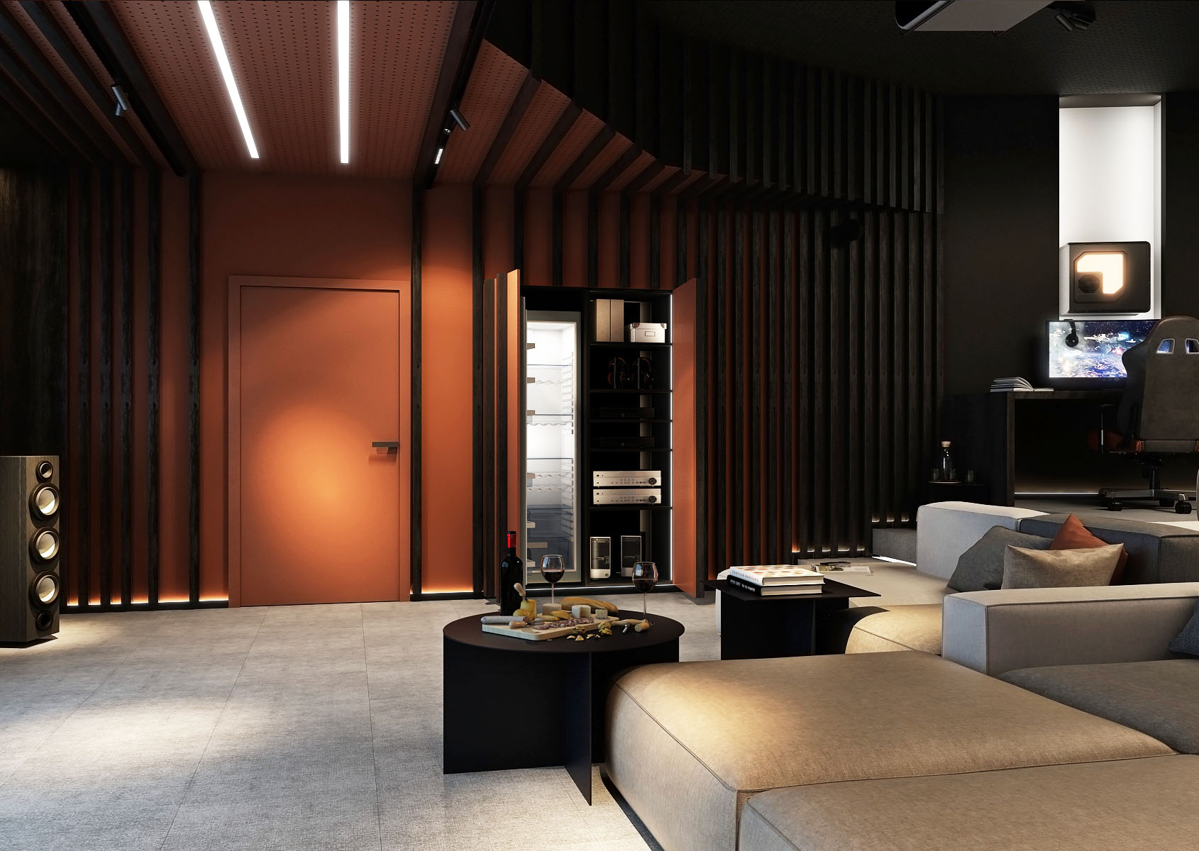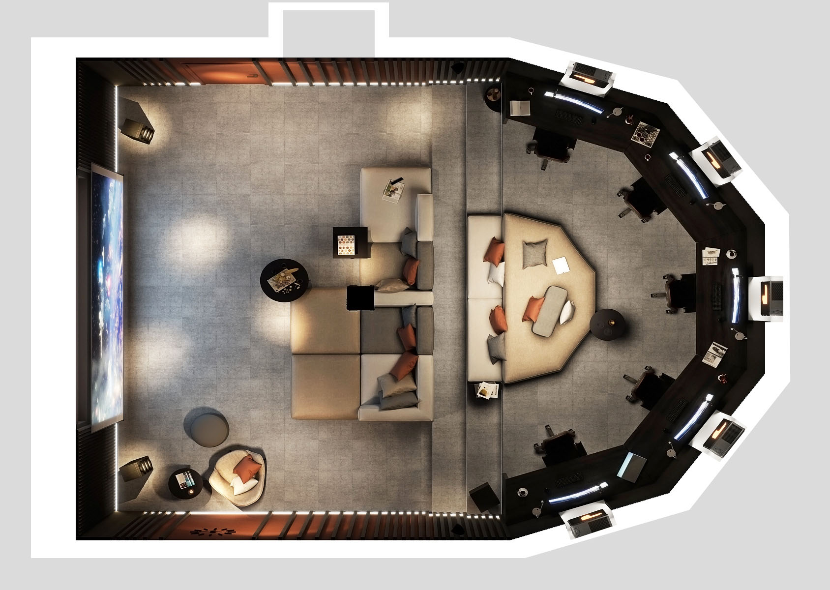 A home cinema with a game room is designed in a graduated space of an irregular room shape.