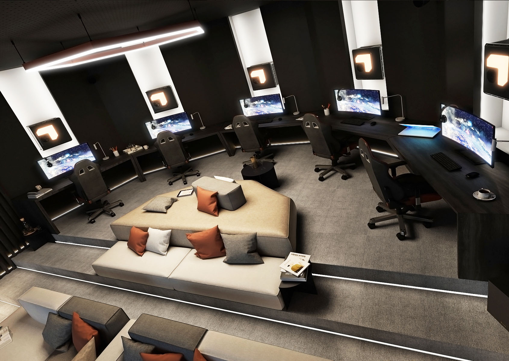 The raised part of the half decagon is used for playing computer games, which is served by the gaming tables located at each edge. Stairs lead to the lower part with the home cinema, in the middle of which there is a built-in seating area that copies the shape of the room.
