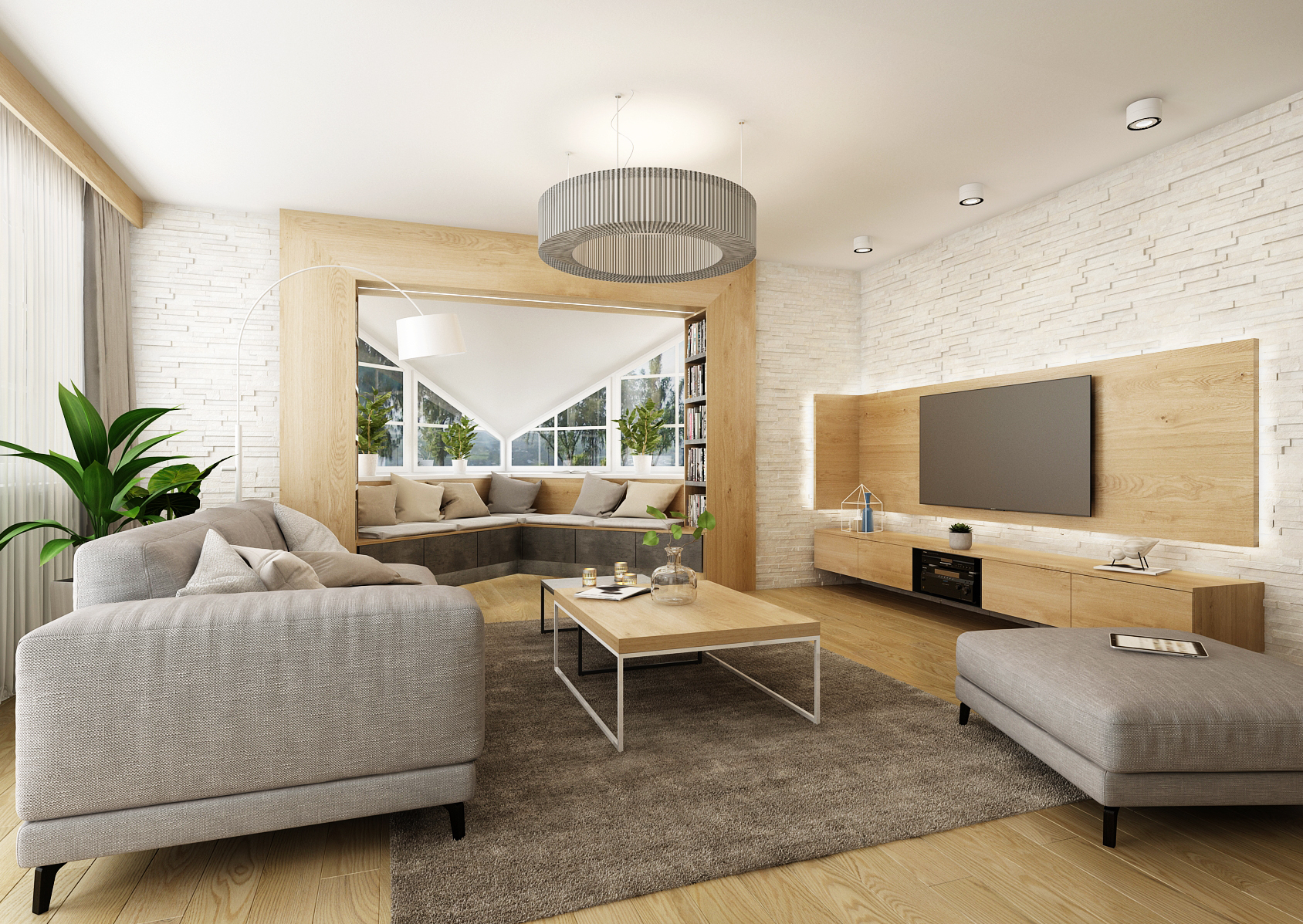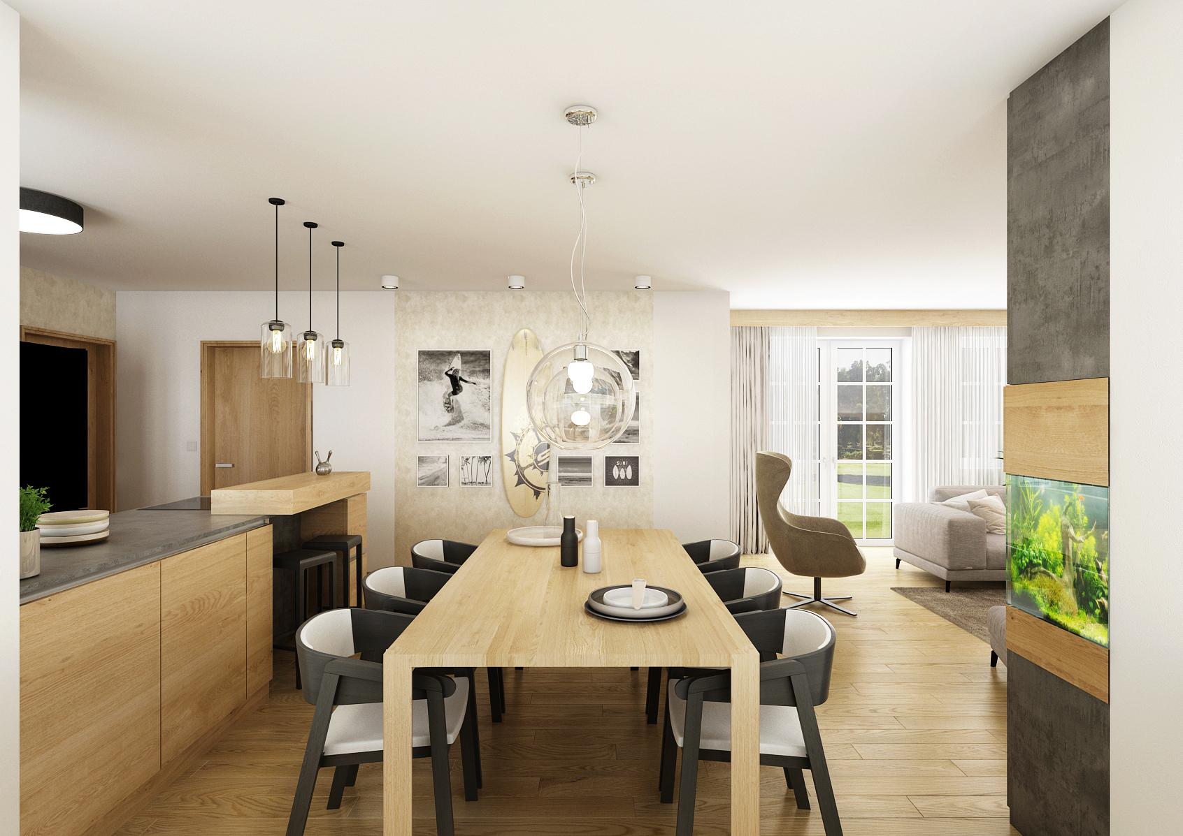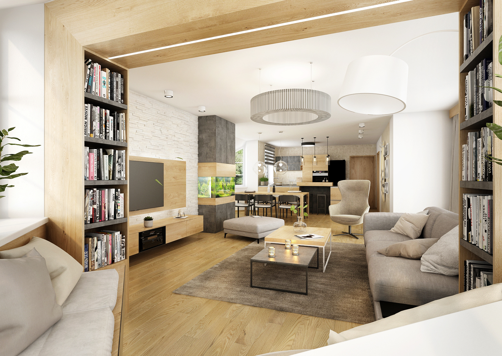 Behind the six-seater spacious table is a living room, which is dominated by a built-in aquarium and a niche that can be used as a relaxation corner with a library. Opposite the spacious gray sofa is a TV located on an oak panel, which is complemented by ambient lighting. An interesting feature is the white stone cladding in combination with light oak wood on the furniture elements and the passage.