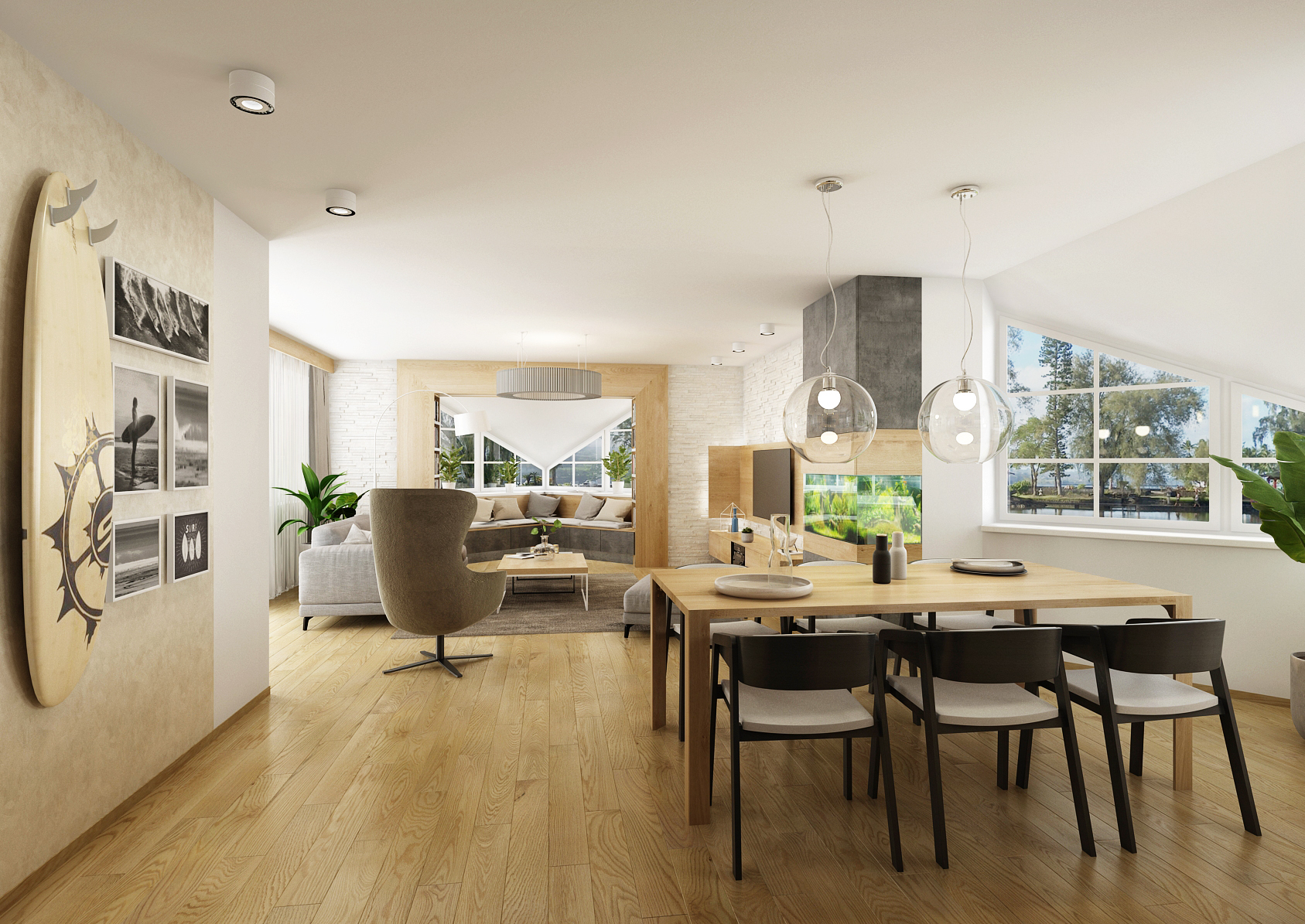 The room is illuminated with both spotlights and designer pendant lights. Irregular windows give the space natural light during the day and a touch of the nineties throughout the day.