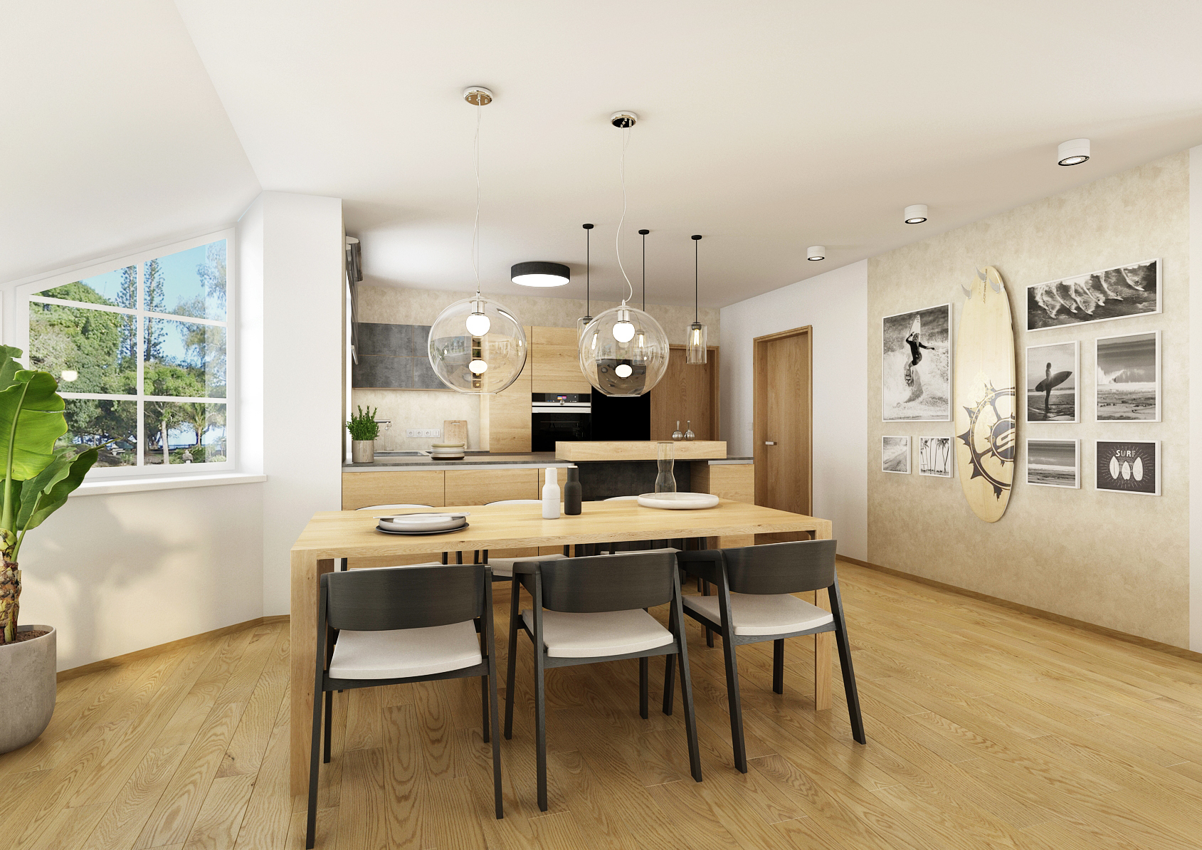 The dining room with kitchenette is situated in a niche in an irregular interior. The kitchen does not lack a bar counter stretching from one wall to the opposite, where space is created for browsing. The entire interior is decorated in light colors combined with a structured trowel and oak wood.
