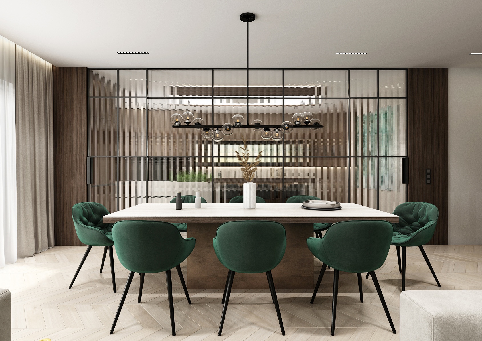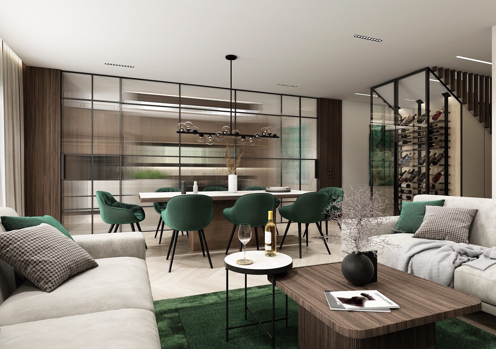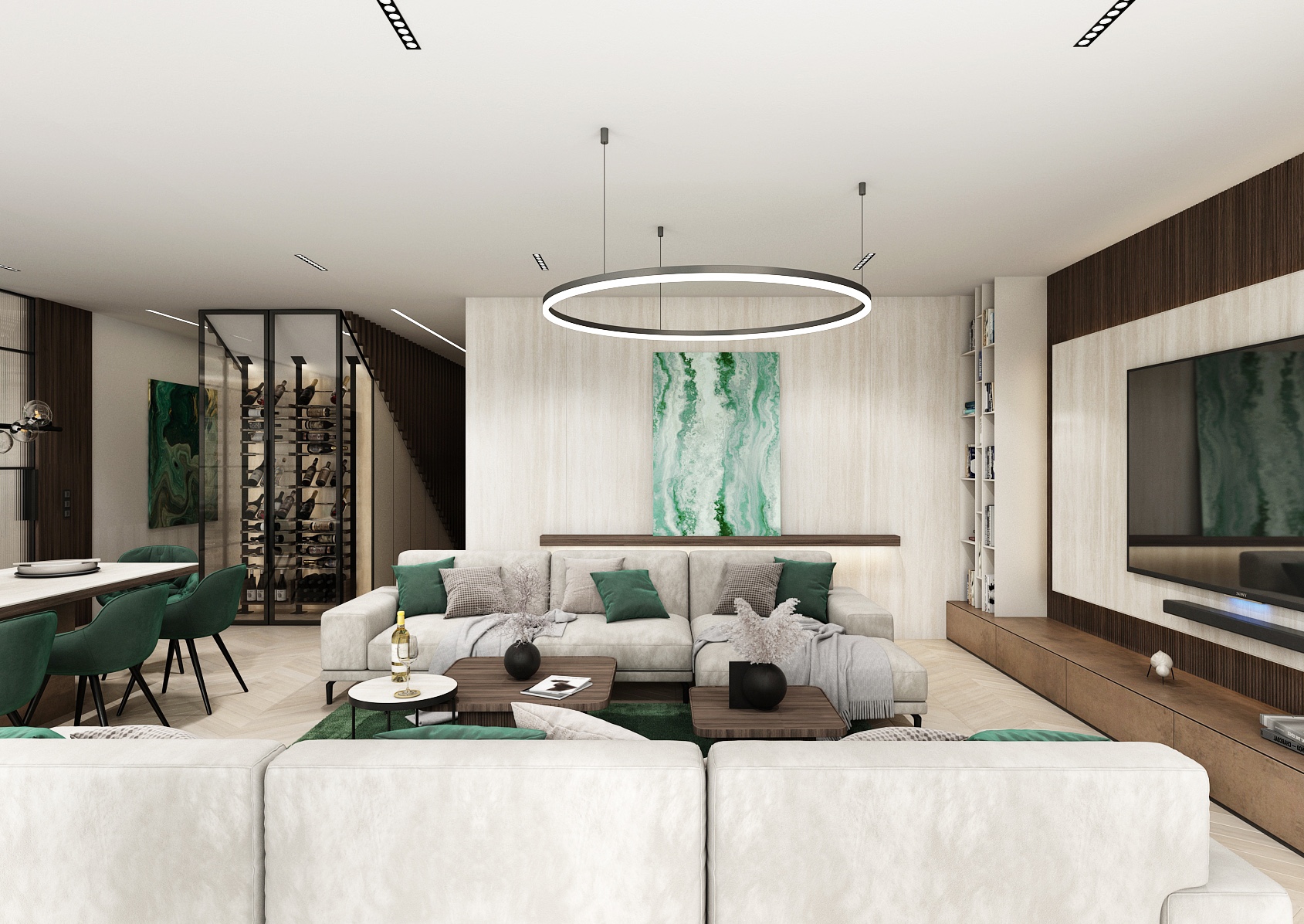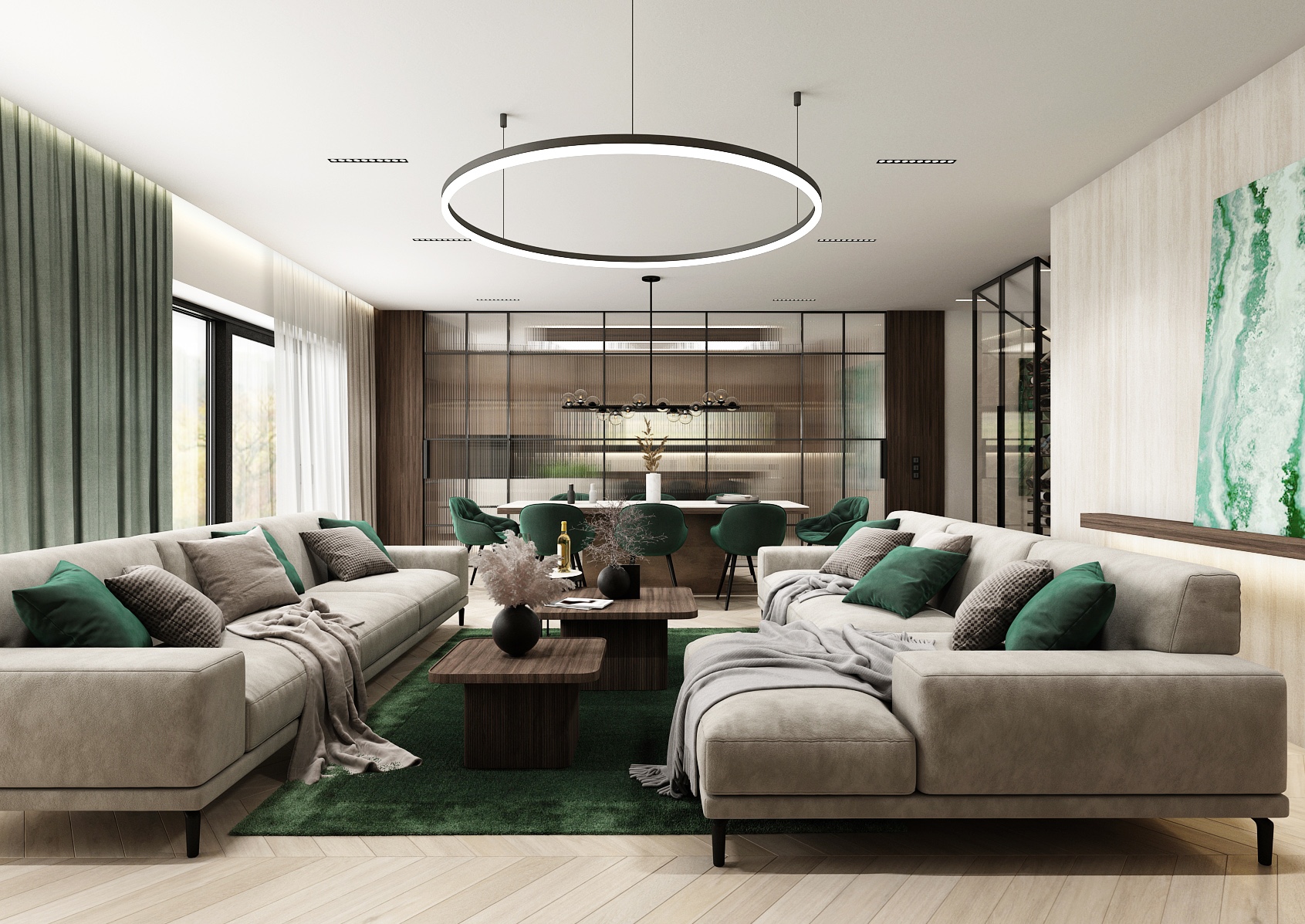 The dominant element of the room is bright comfortable sofas, complemented by green decorative pillows that give the space a sense of comfort. A large circular chandelier in the middle of the room not only provides ample light but also adds a modern aesthetic. The space is connected to the dining room, where the elegant dining table is surrounded by stylish green chairs, which creates a harmonious and uniform interior look.