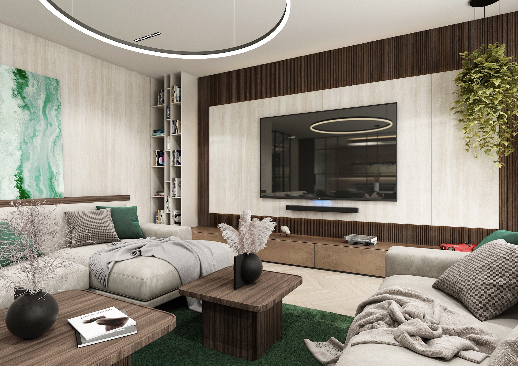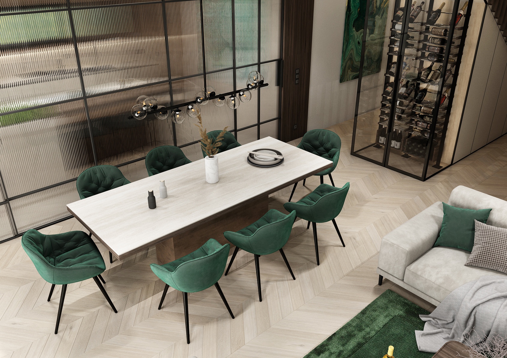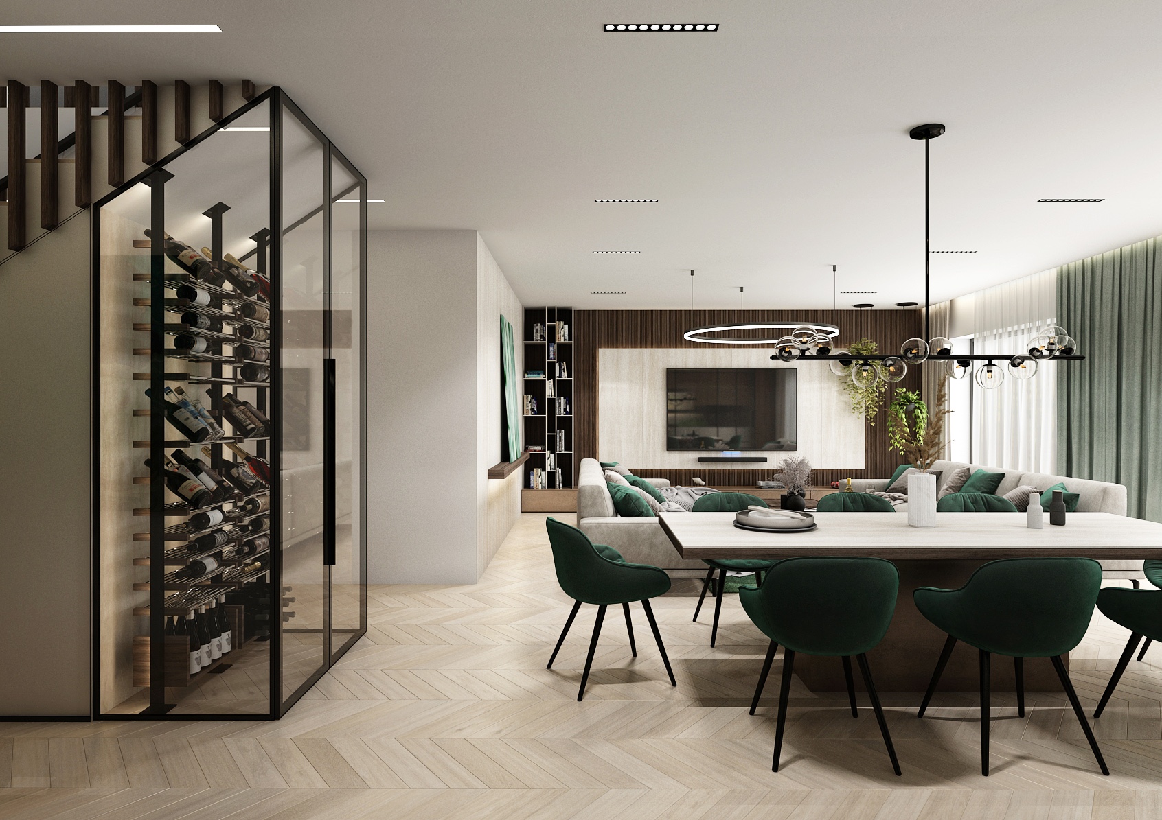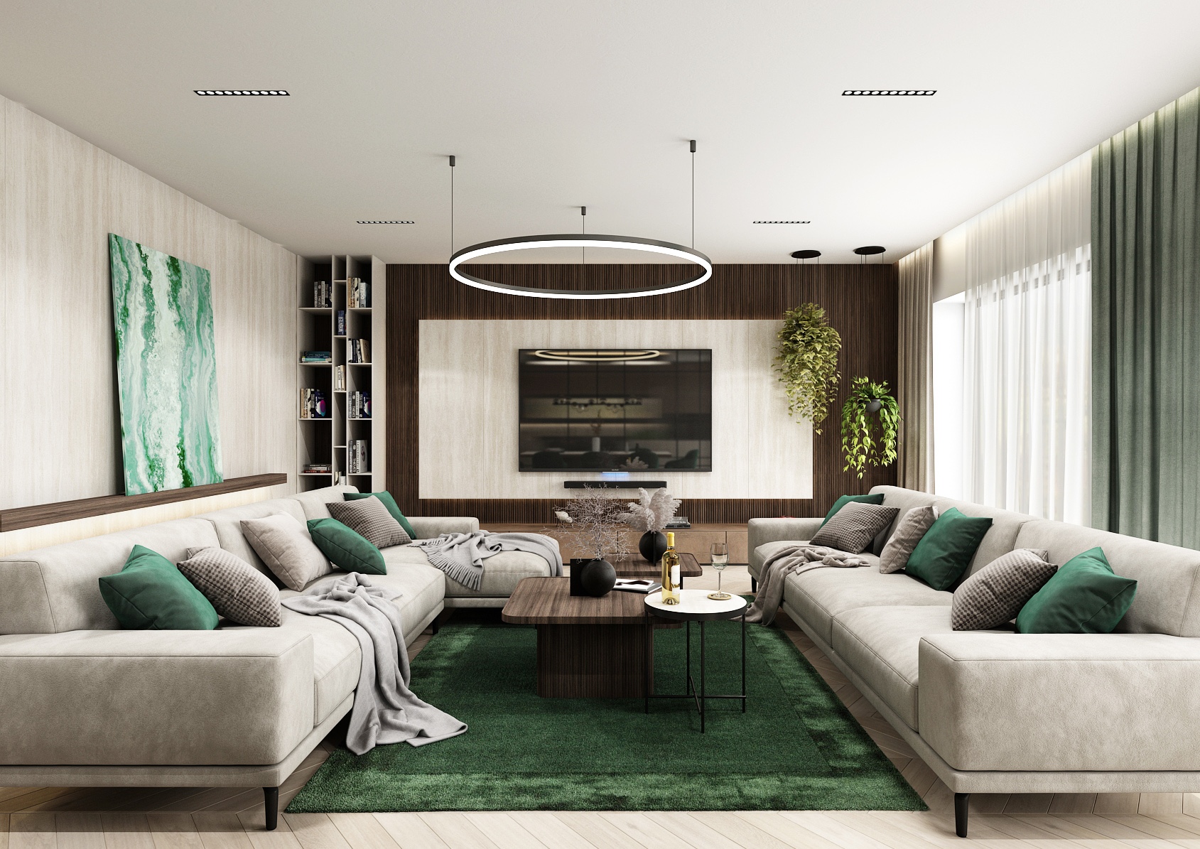 The dominant element of the room is bright comfortable sofas, complemented by green decorative pillows that give the space a sense of comfort. A large circular chandelier in the middle of the room not only provides ample light but also adds a modern aesthetic. The space is connected to the dining room, where the elegant dining table is surrounded by stylish green chairs, which creates a harmonious and uniform interior look.