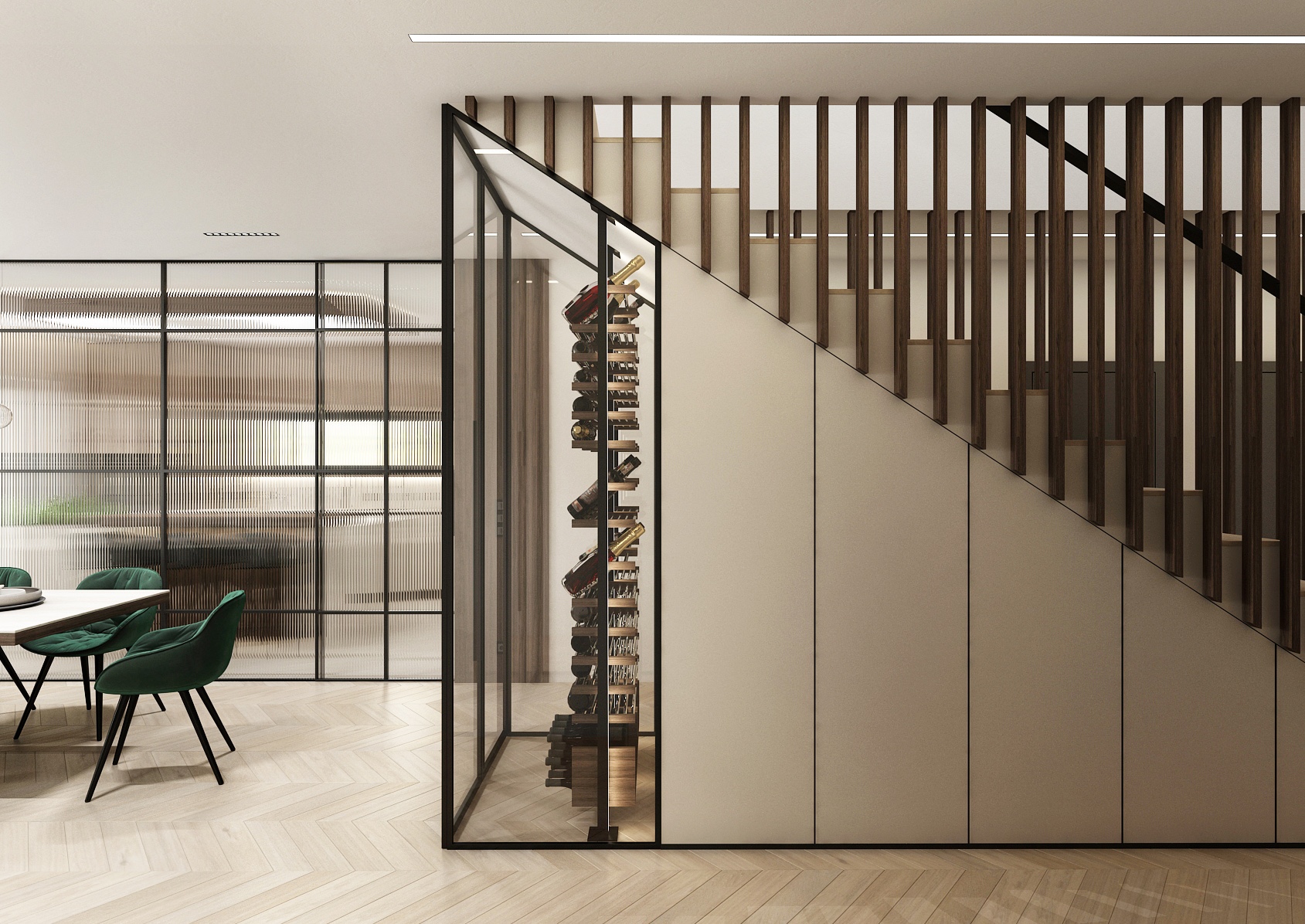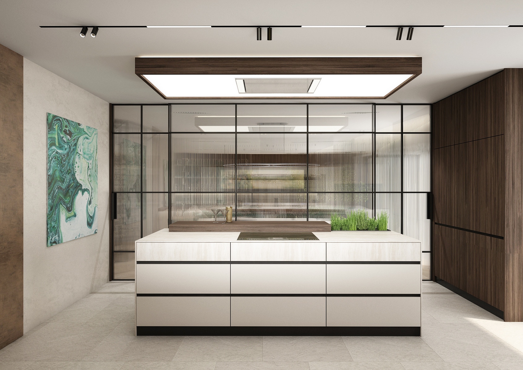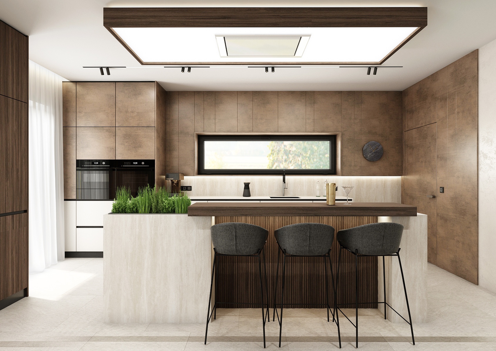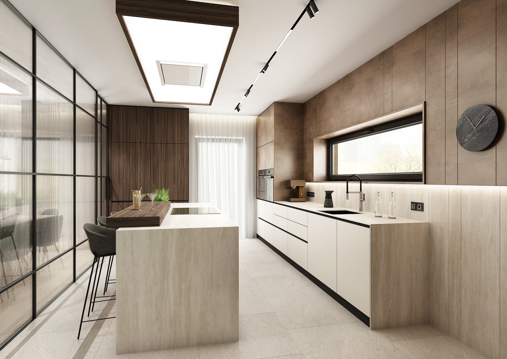 The kitchen of this family home is modern and functional, with clean lines and a thoughtful layout. The use of natural materials such as wood and stone gives the kitchen a warm and cozy look. The central kitchen island serves not only as a work area, but also as a place for quick meals or social gatherings with elegant bar stools on its sides. The built-in appliances and minimalist design of the cabinets ensure that the kitchen is not only aesthetically appealing, but also highly practical for everyday use.