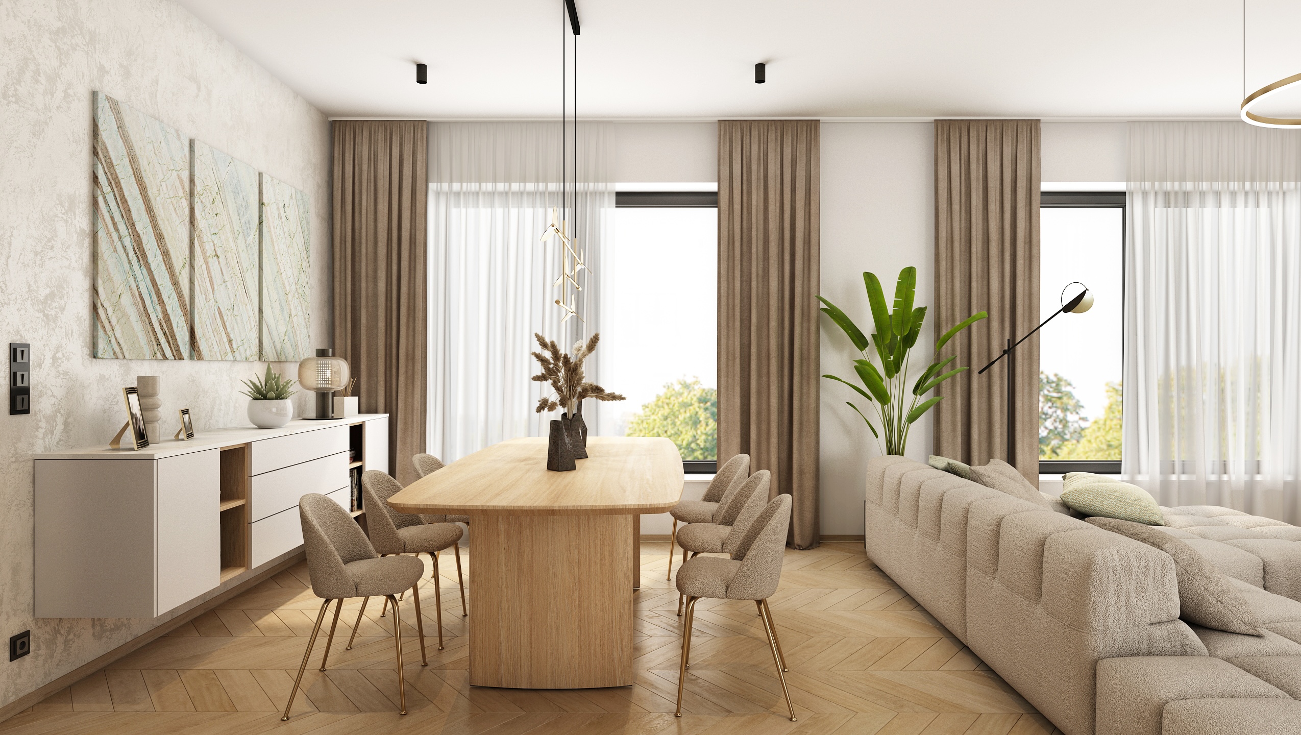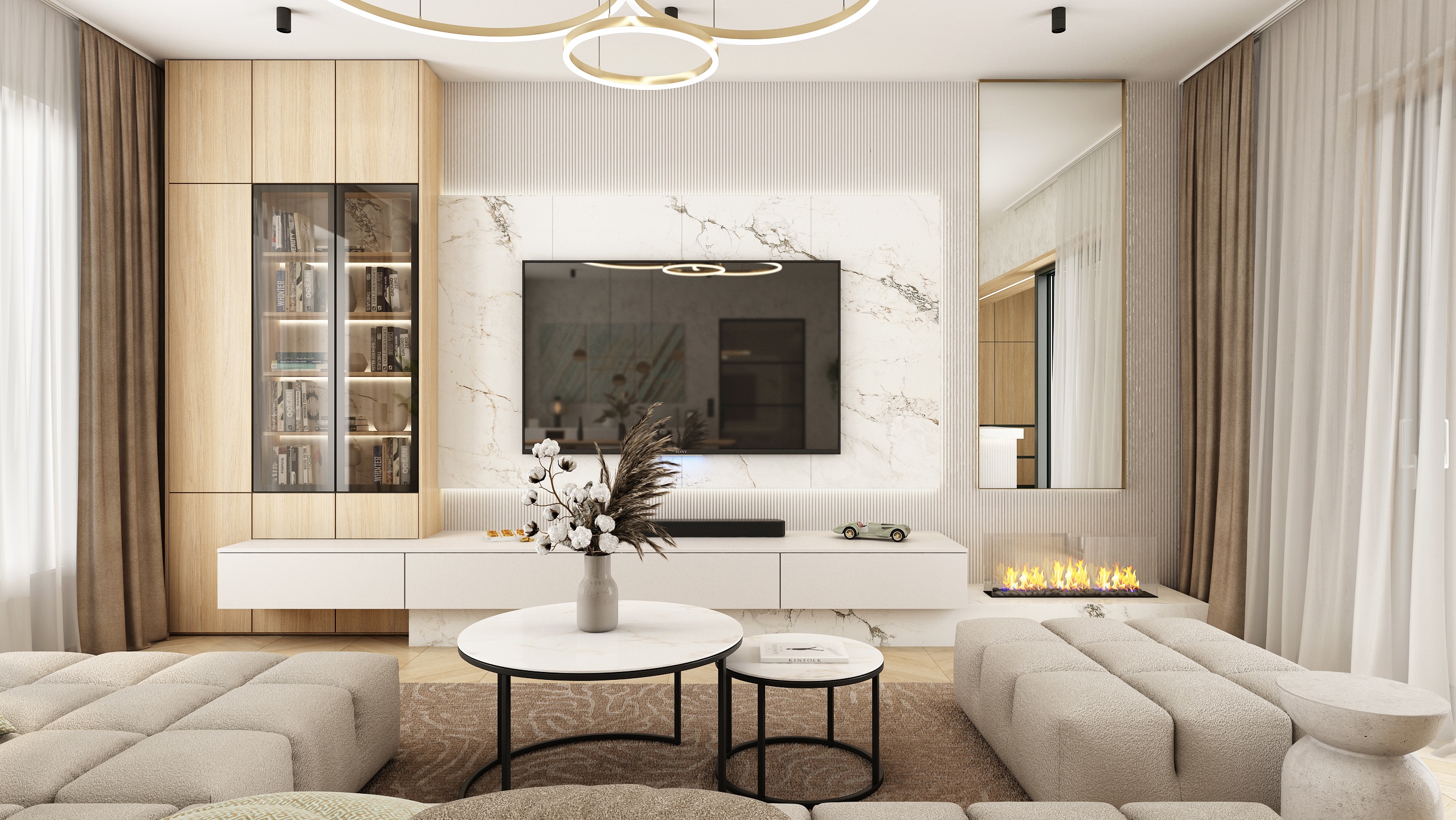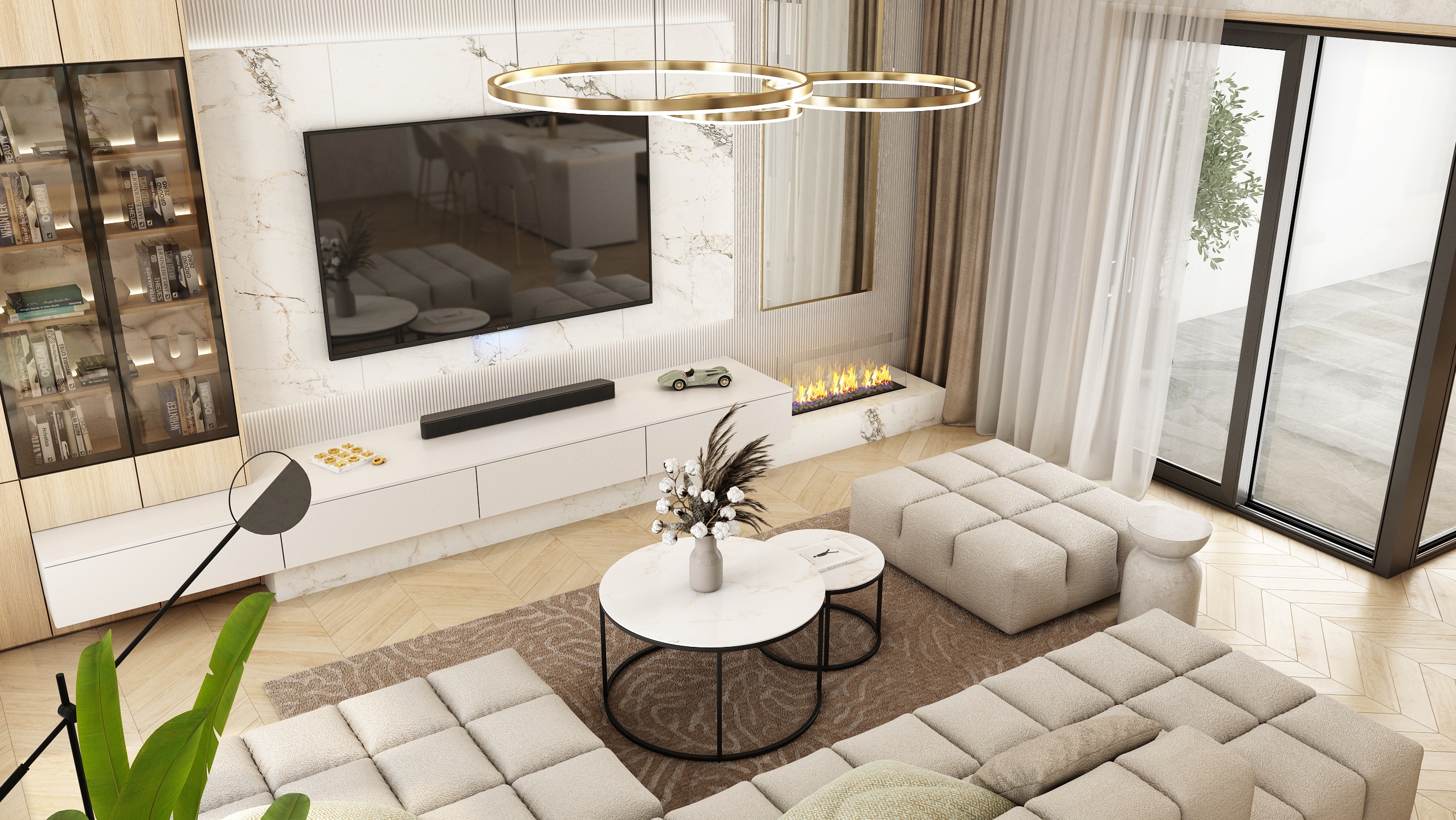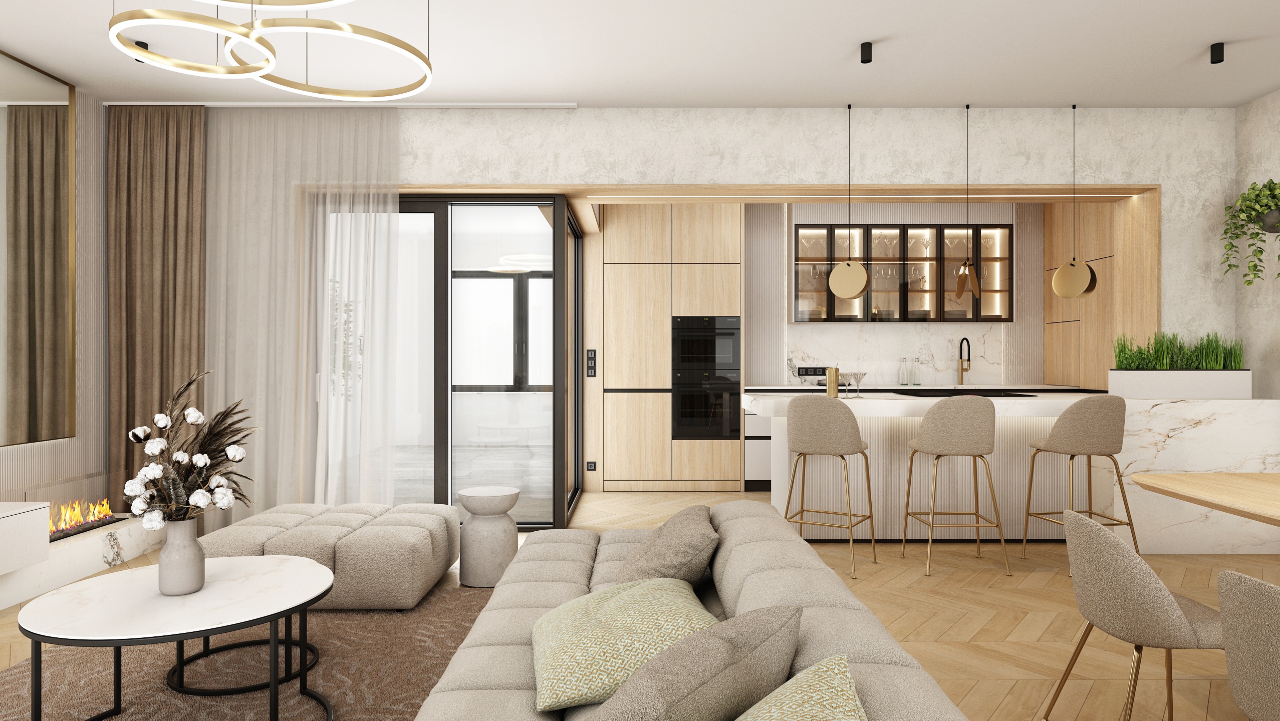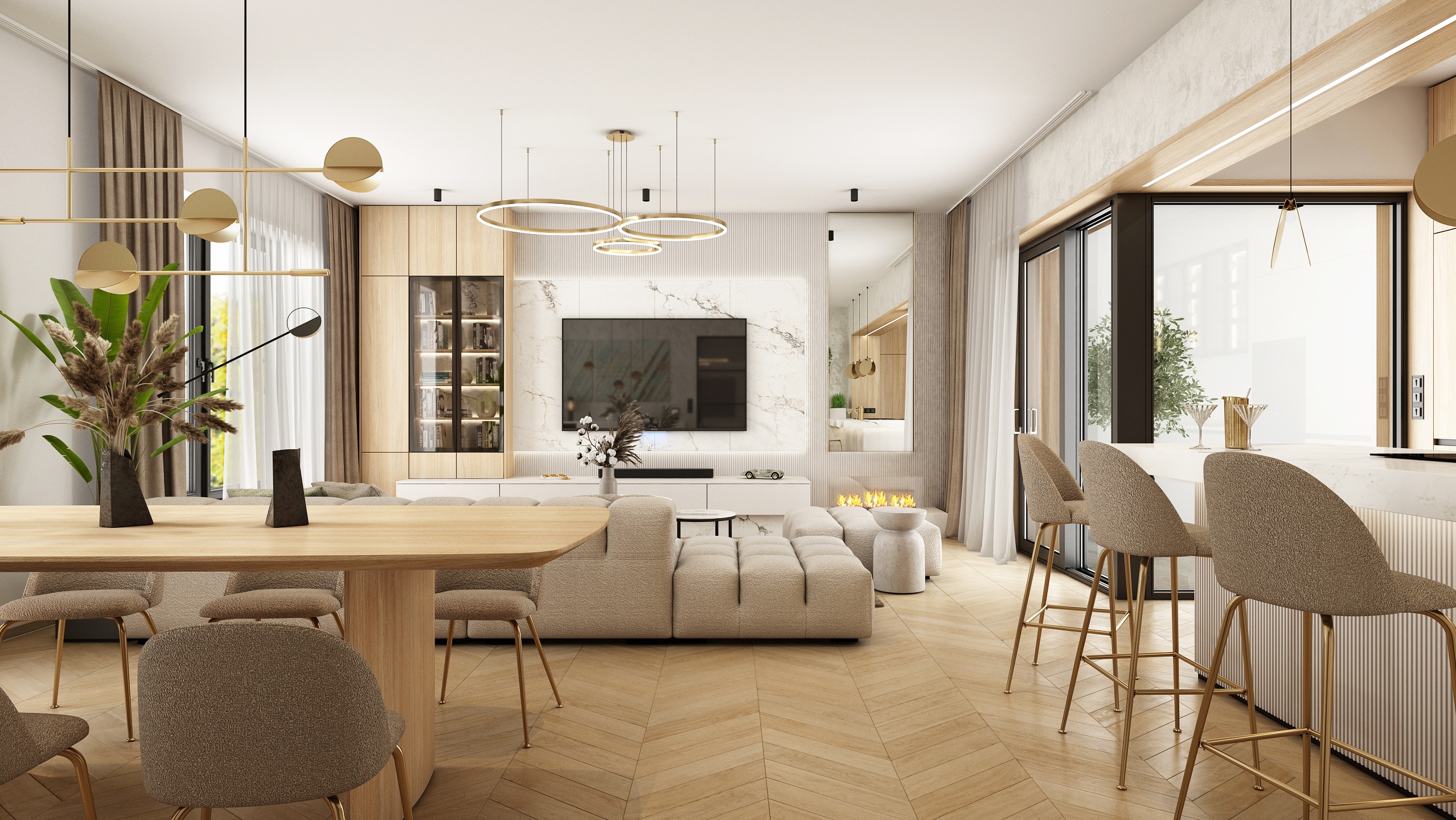 Large glass areas let in natural light, while the neutral tones of the furniture and wooden elements bring a feeling of warmth and coziness. The central point is a bright sofa set, complemented by stylish pendant lights and a minimalist fireplace, which creates a balanced and harmonious space.