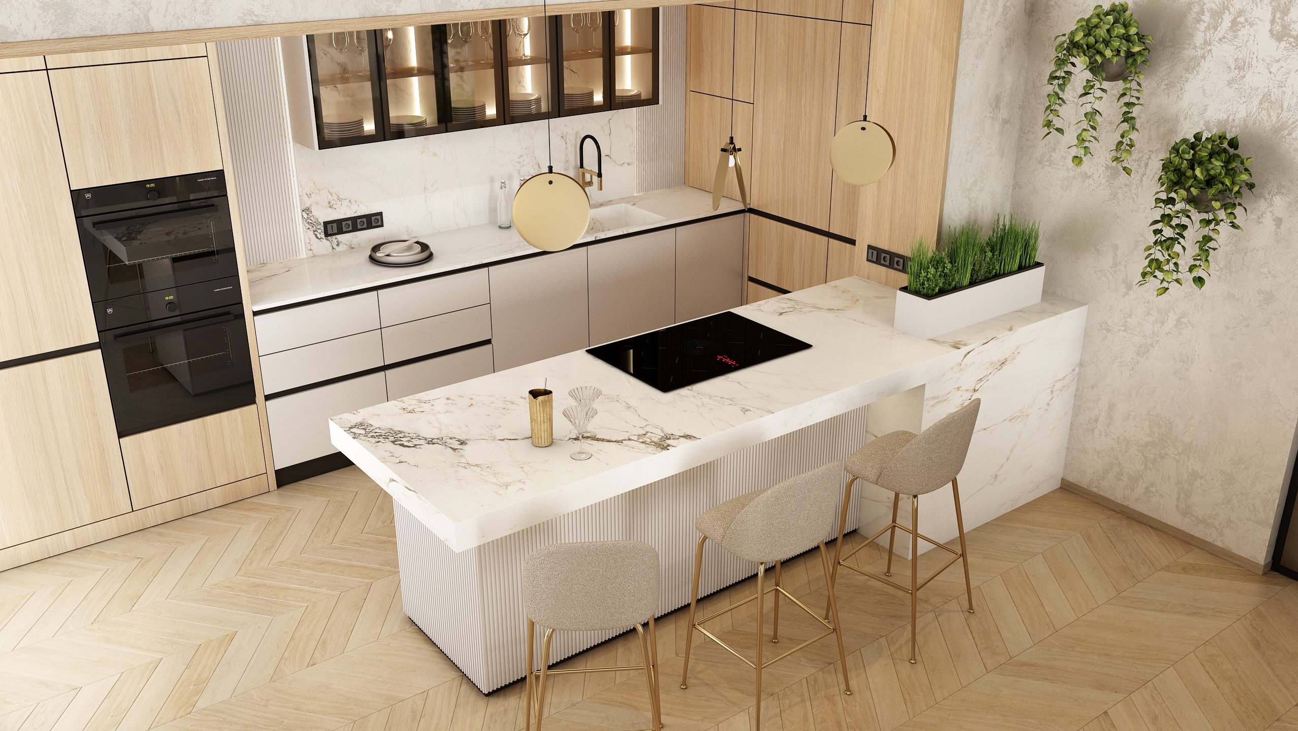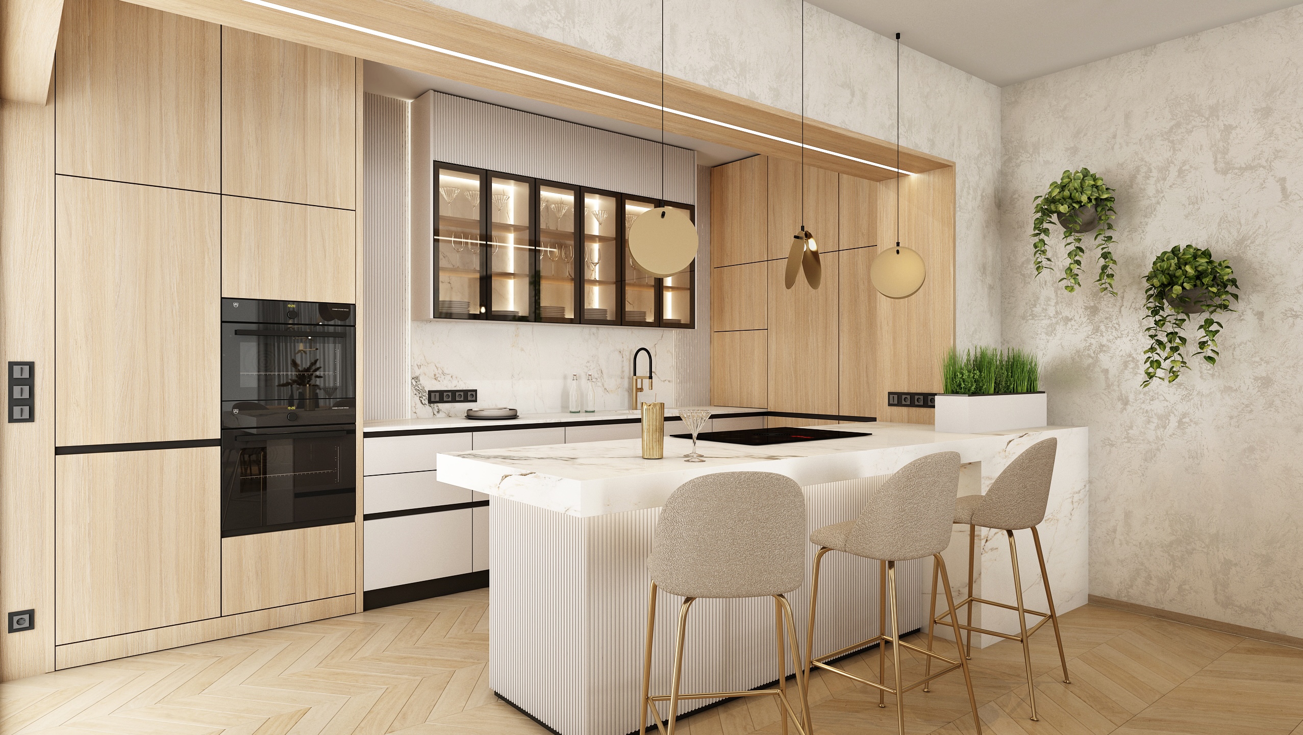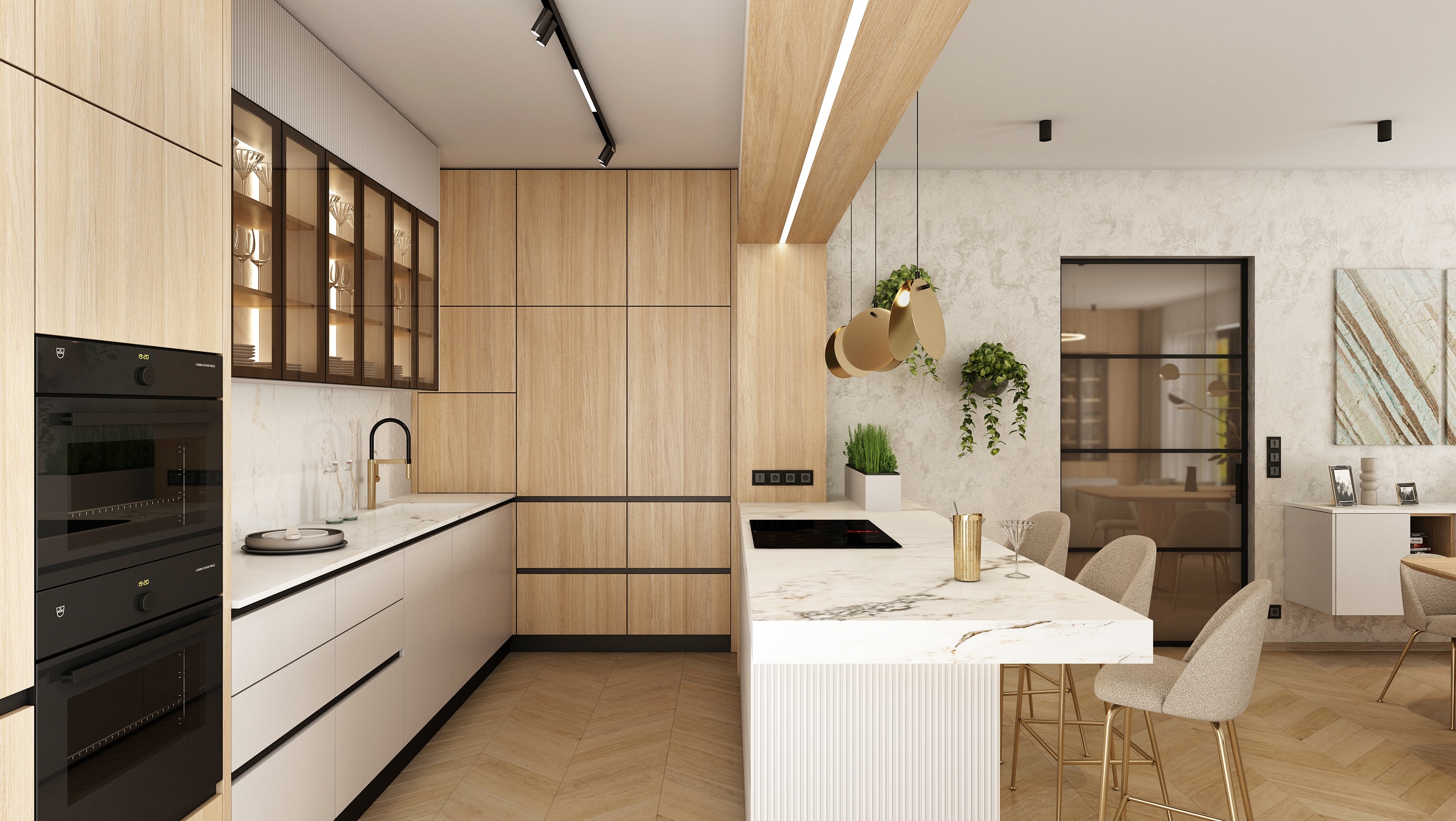 The kitchen is designed with an emphasis on functionality and aesthetics. Light wooden cabinets, combined with white imitation marble worktops, provide plenty of storage space. Black details, such as built-in appliances and faucets, add a sophisticated contrast to the space. Hanging lamps and green plants enliven the interior and give it a modern touch.