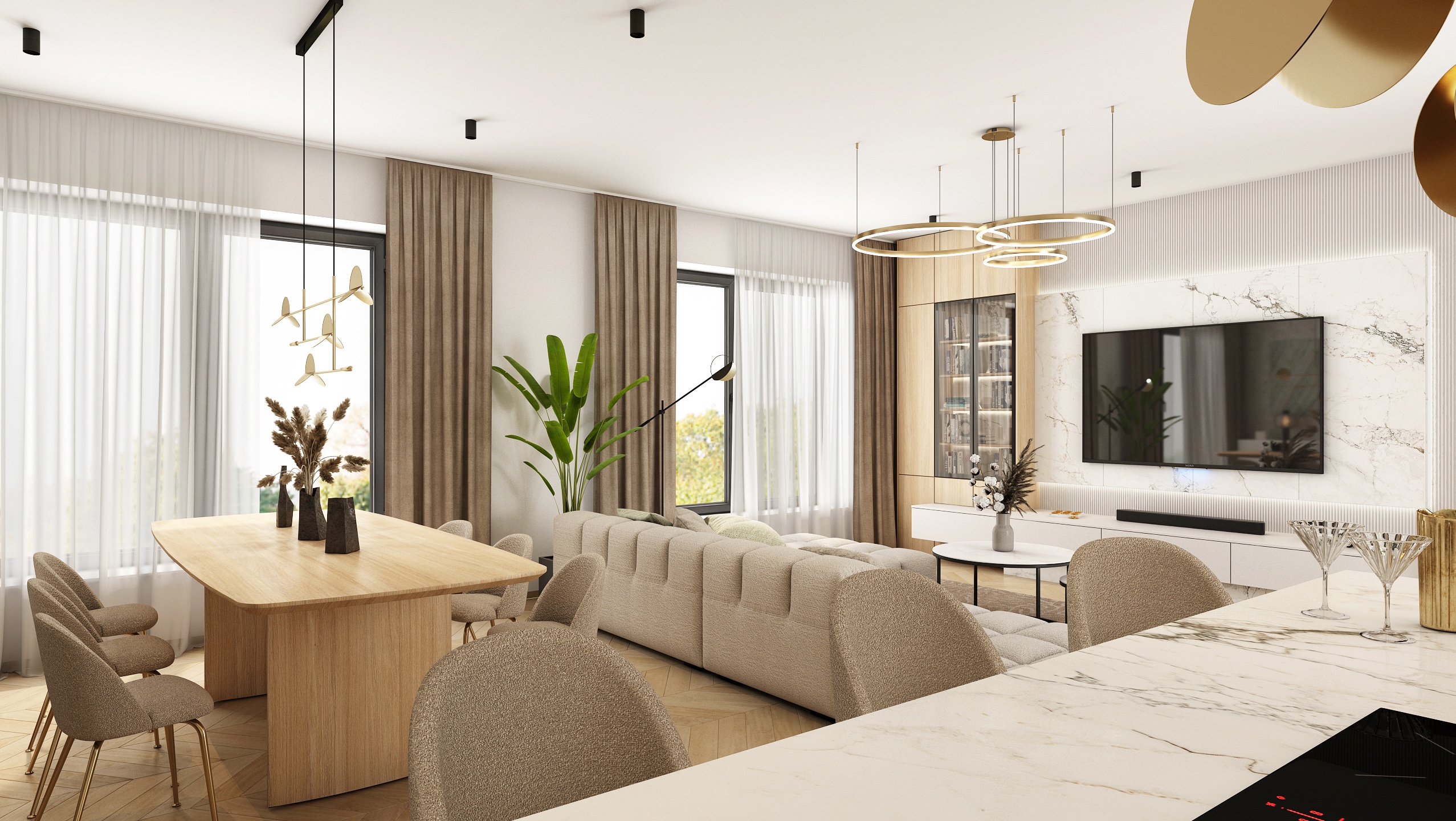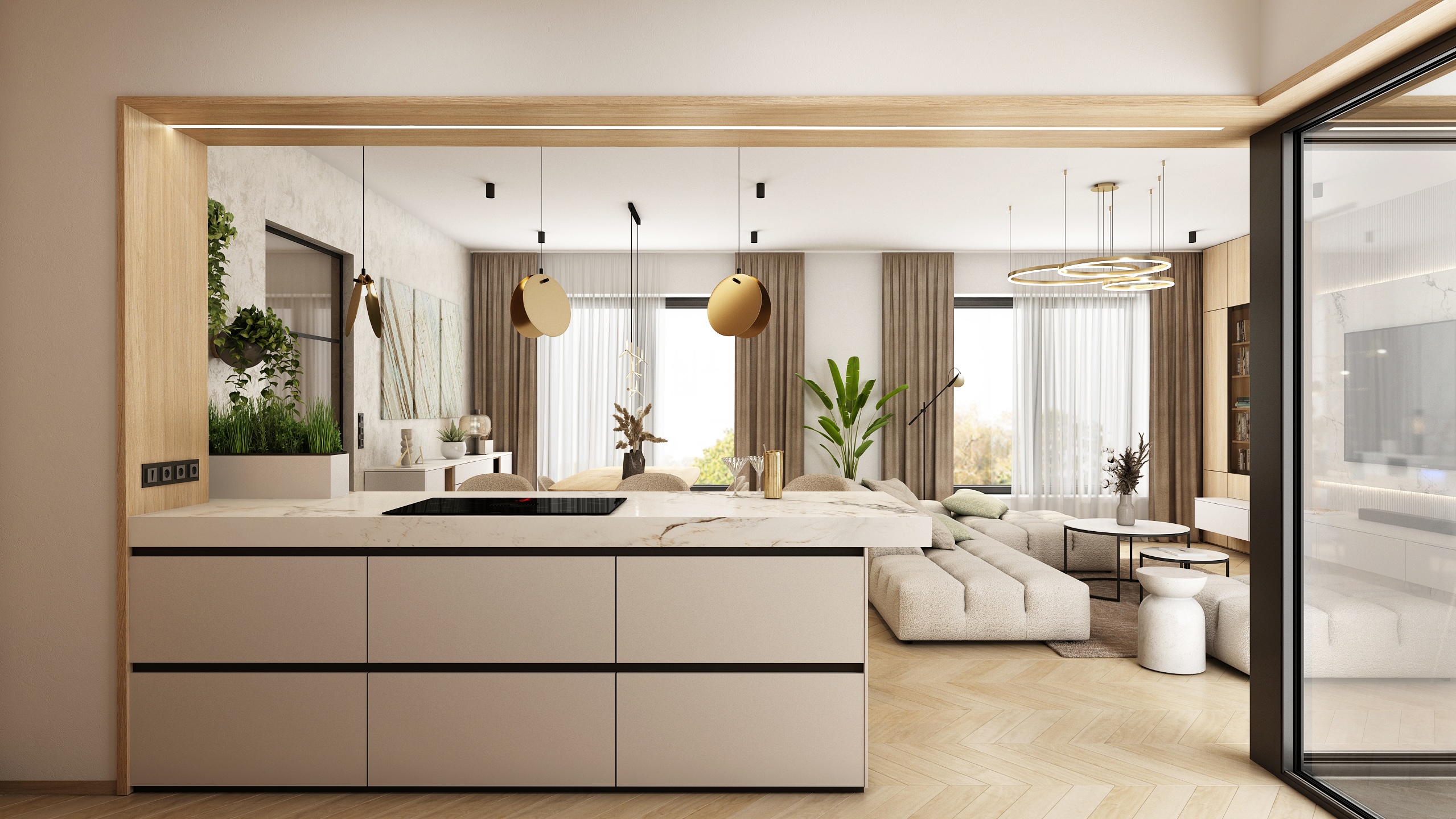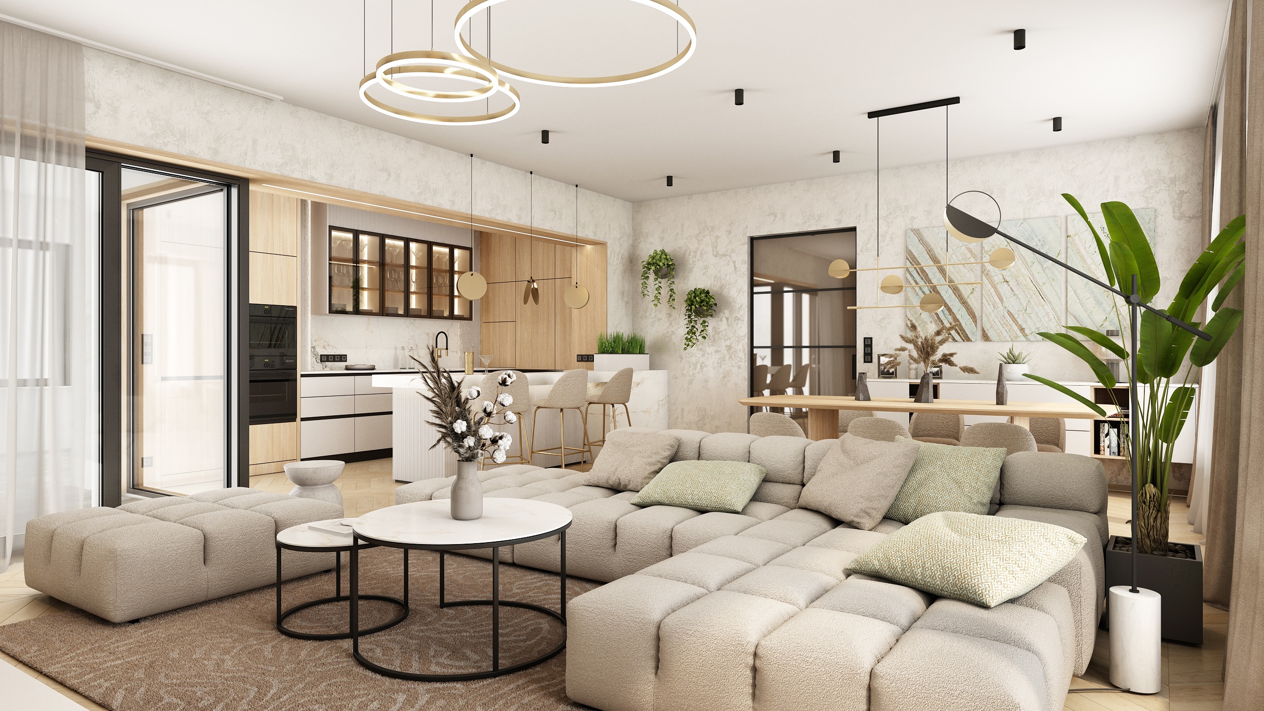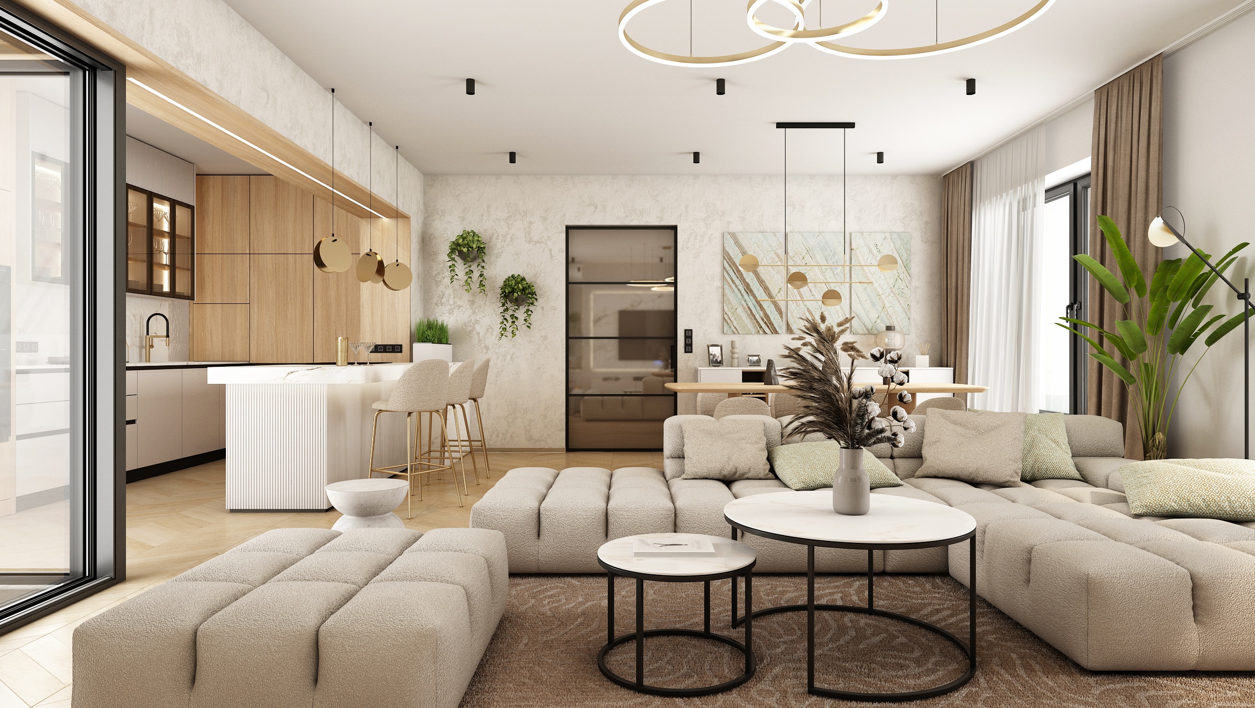 The kitchen is designed with an emphasis on functionality and aesthetics. Light wooden cabinets, combined with white imitation marble worktops, provide plenty of storage space. Black details, such as built-in appliances and faucets, add a sophisticated contrast to the space. Hanging lamps and green plants enliven the interior and give it a modern touch.