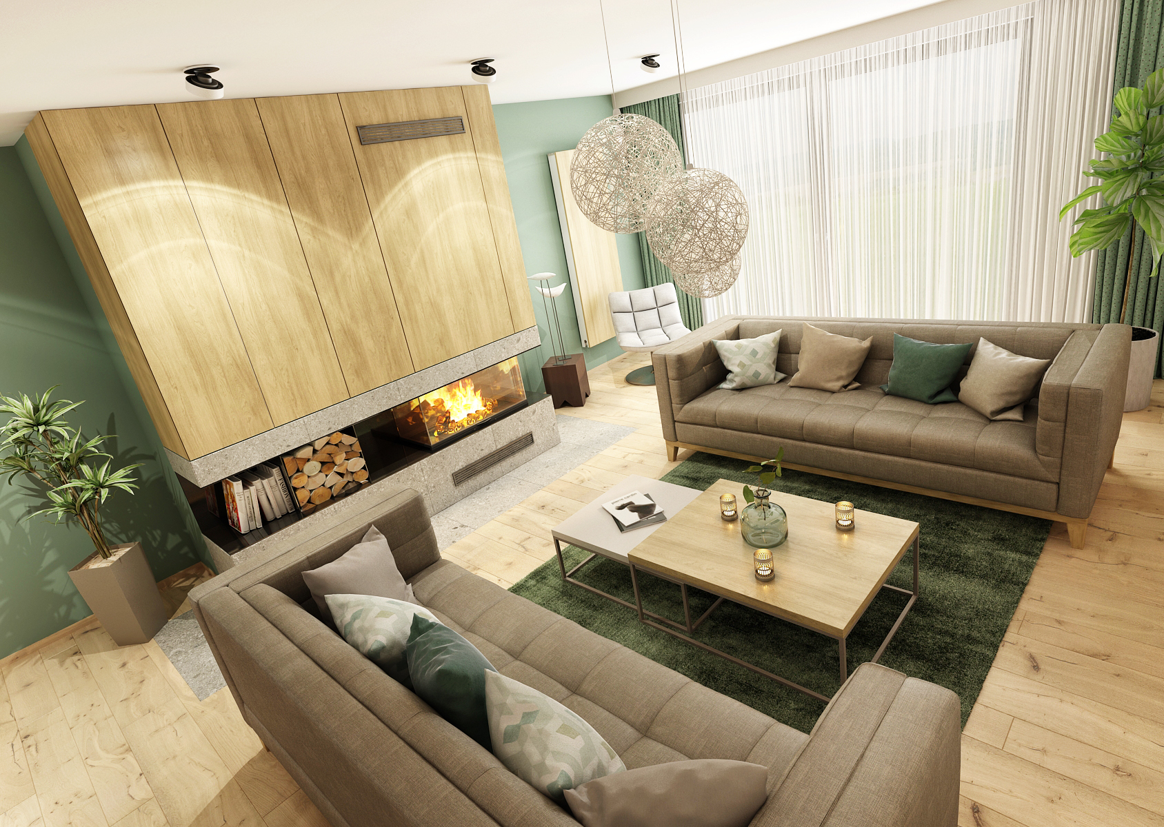 The oak wood decor is again used on the fireplace insert on the opposite wall. The whole space is dominated by two spacious seats located opposite each other. In the middle there is a set of coffee tables with a black metal base.