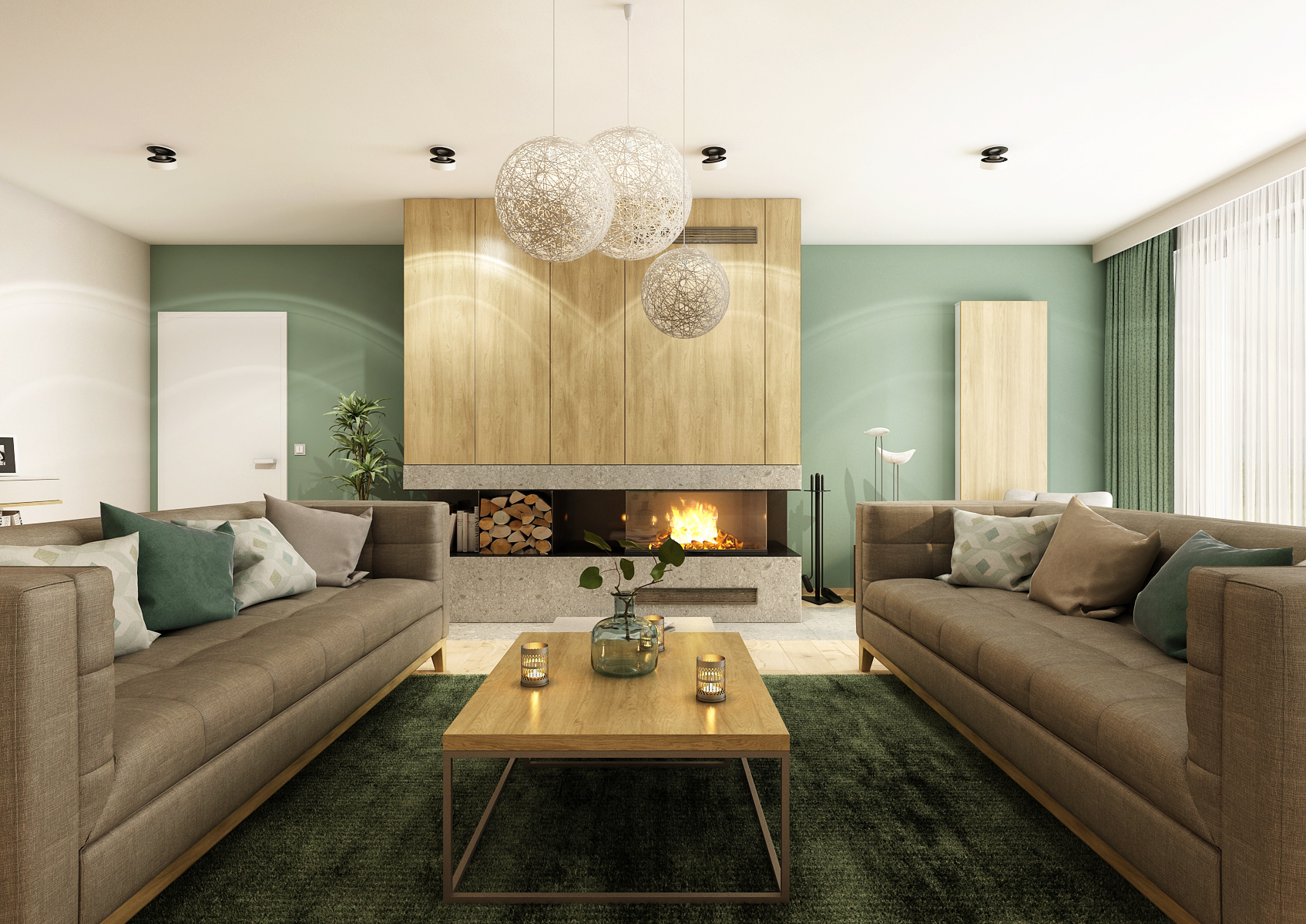 The room is lit by natural light with French windows. In the evening, the lights are provided by spotlights aimed at the fireplace and a designer pendant lamp.