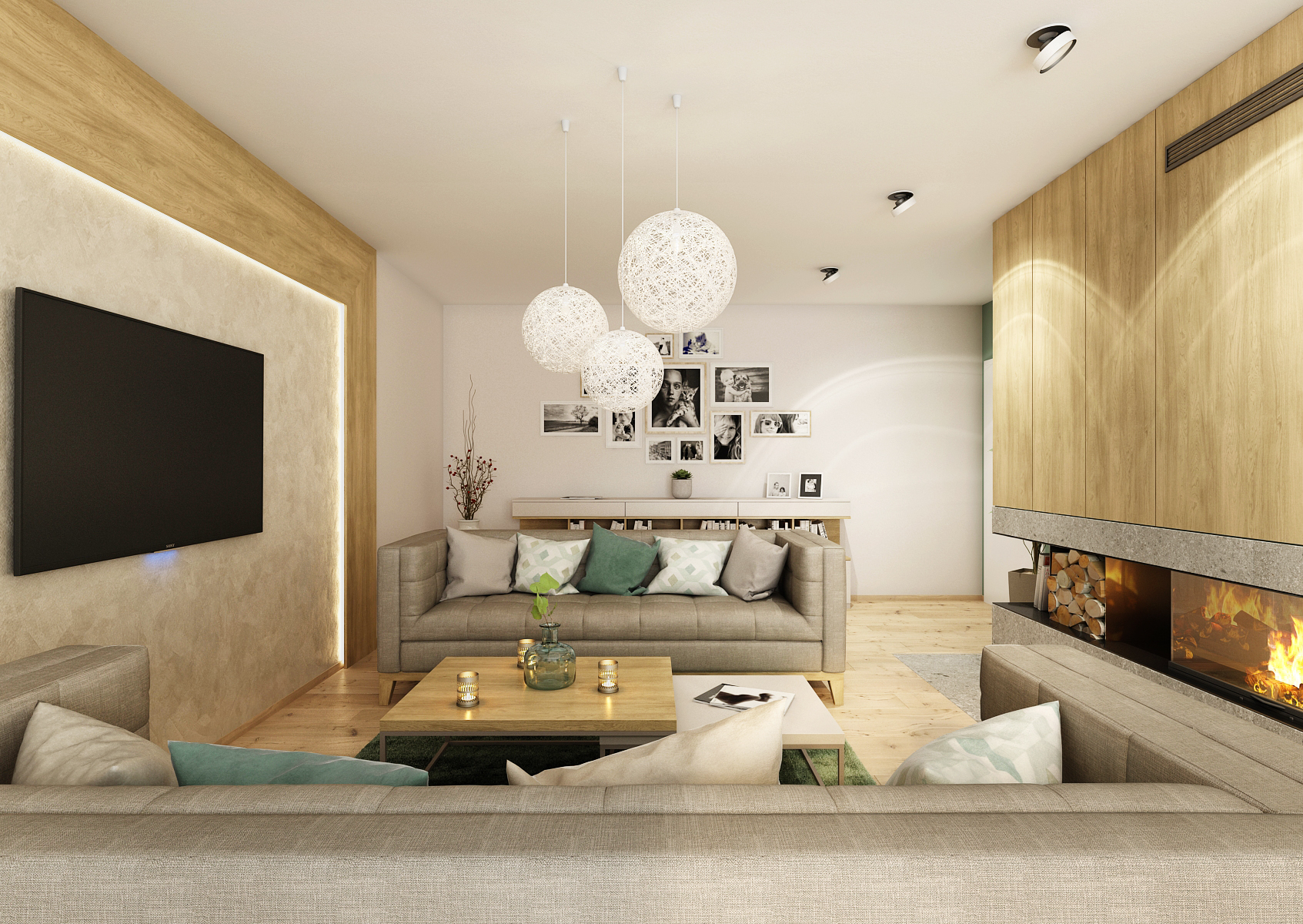 Spacious interior, where there is also a fireplace to create a pleasant atmosphere in the winter months, as well as a TV hung on the wall for entertainment. Around it there are oak panels, which form the frame for a place with a TV and at the same time provide the living room with ambient lighting.