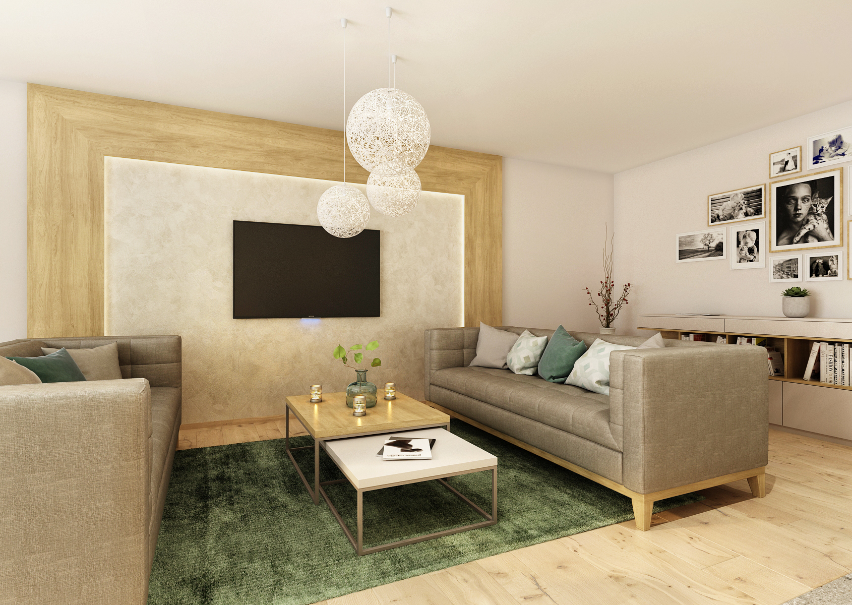 The living room in the family house is decorated in light colors, which are contrasted by green paintings on the walls and selected accessories of the same color.