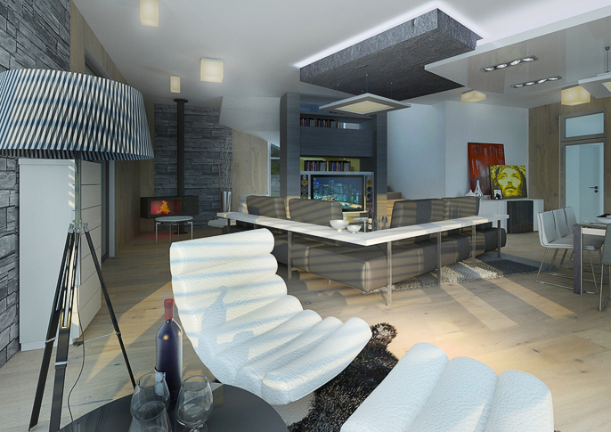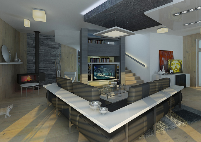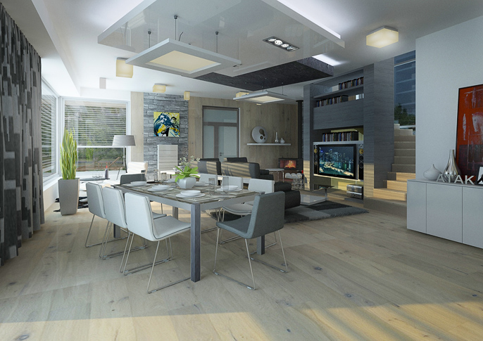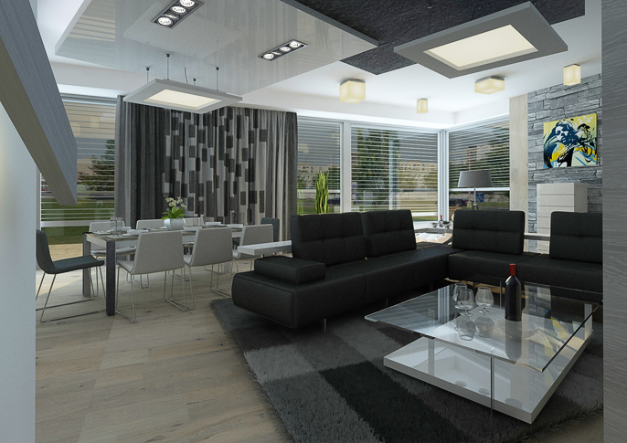 Living room in a modern design with distinctive black elements, is harmonized in darker colors in combination with white wall paint and light wood. A large black leather sofa set, home theater and use of soffits dominates in the room. In the soffit, there's built-in direct and indirect lightning as well. Large French windows along the entire lenght of the wall allows a view to the garden from the dining table and brighten up the room in the same time.