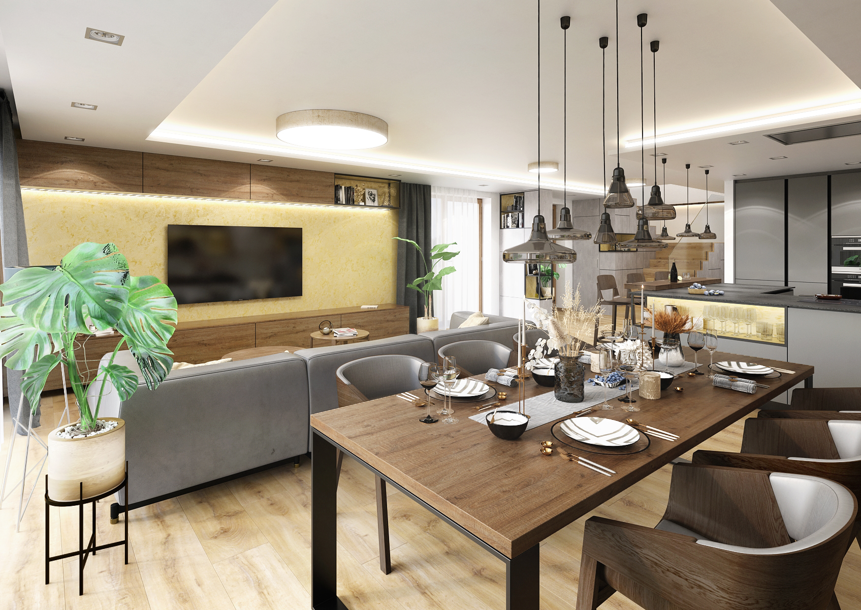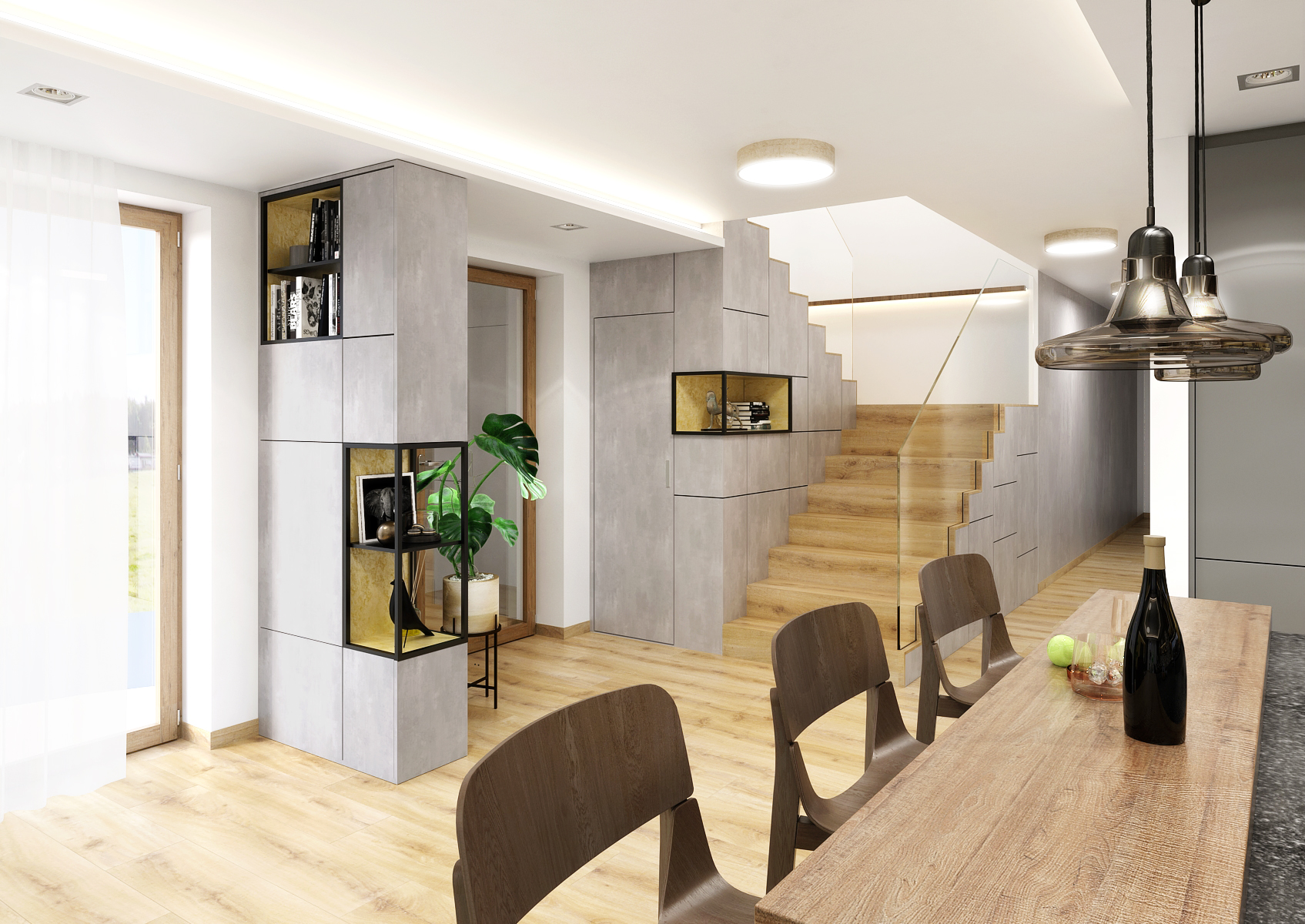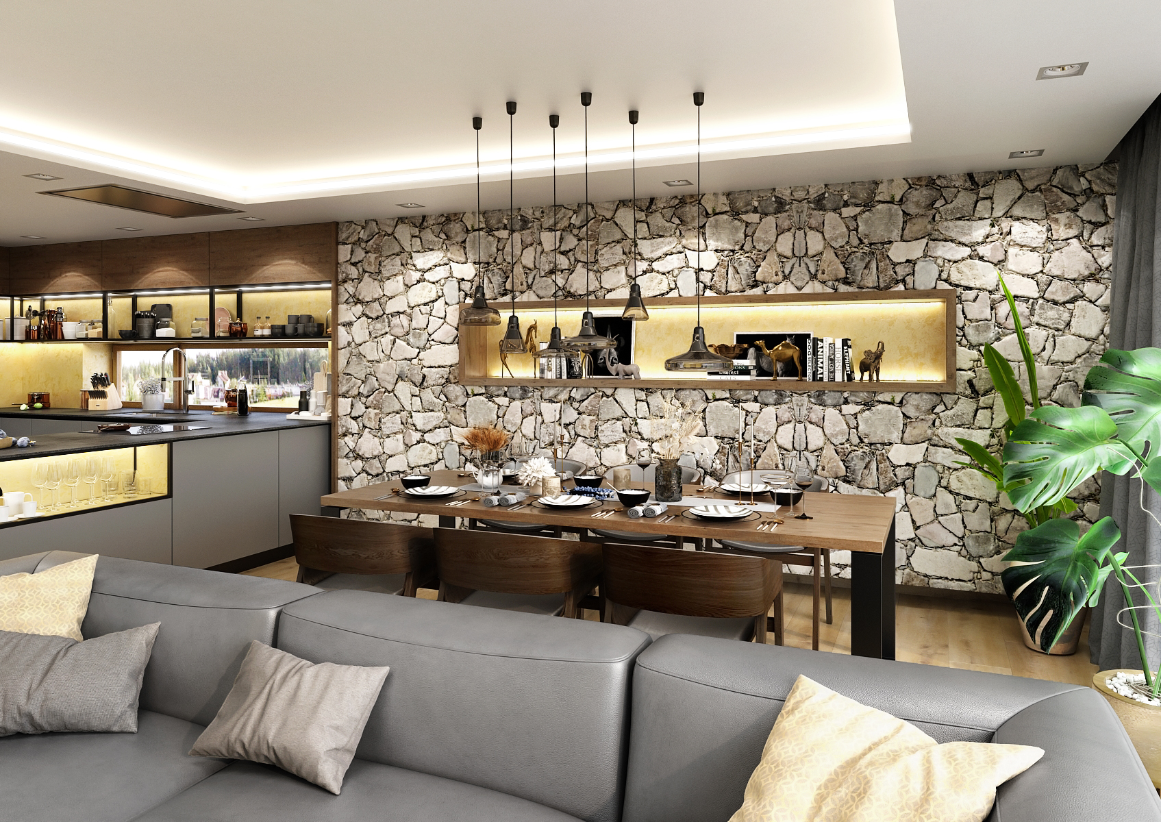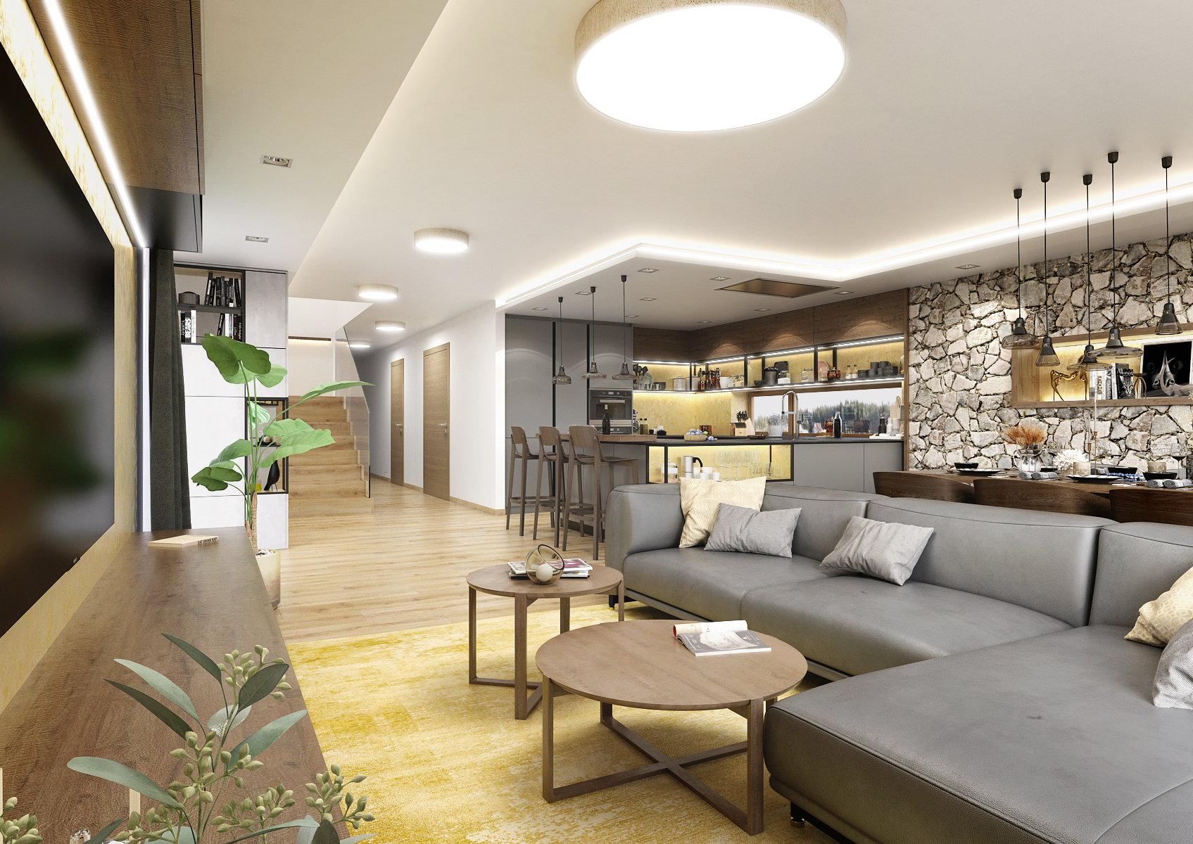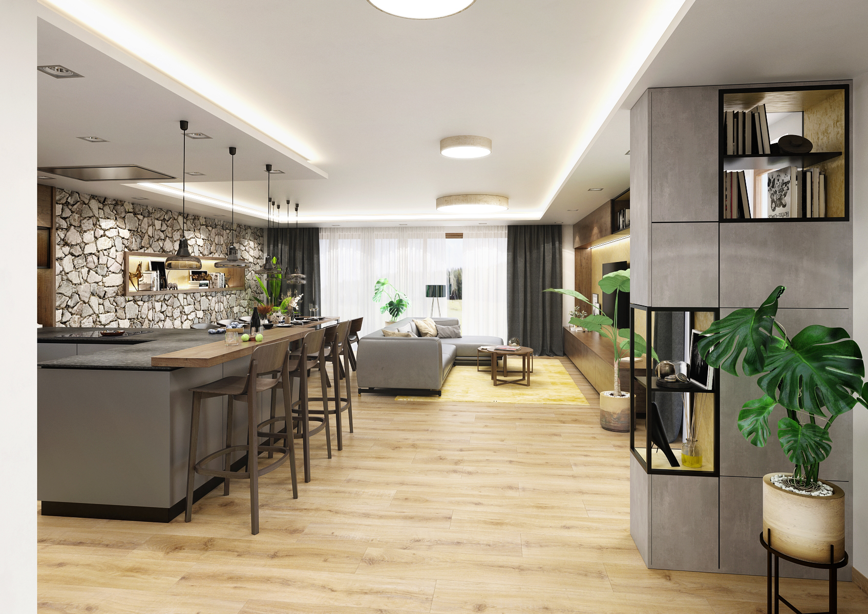 One of the natural materials used in this design is stone. This covers the wall at the dining table adjoining the kitchen. It is located under a suspended ceiling with LED lighting around its entire perimeter, thanks to which it is visually separated from the rest of the space. There is also a built-in hood and spot lighting in the soffit. The bar with Leaf bar stools from the TON brand is lit by pendant lights. The open storage spaces are brightened up with a golden concrete screed.