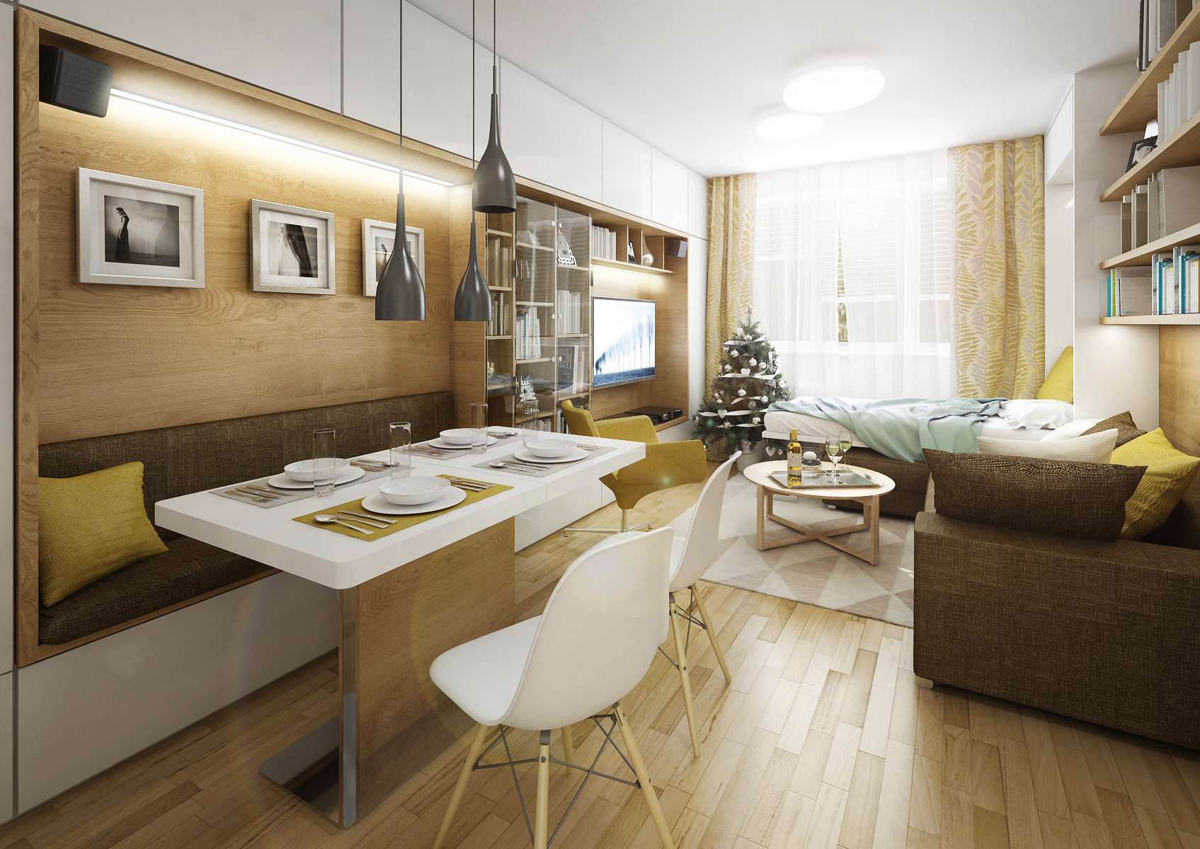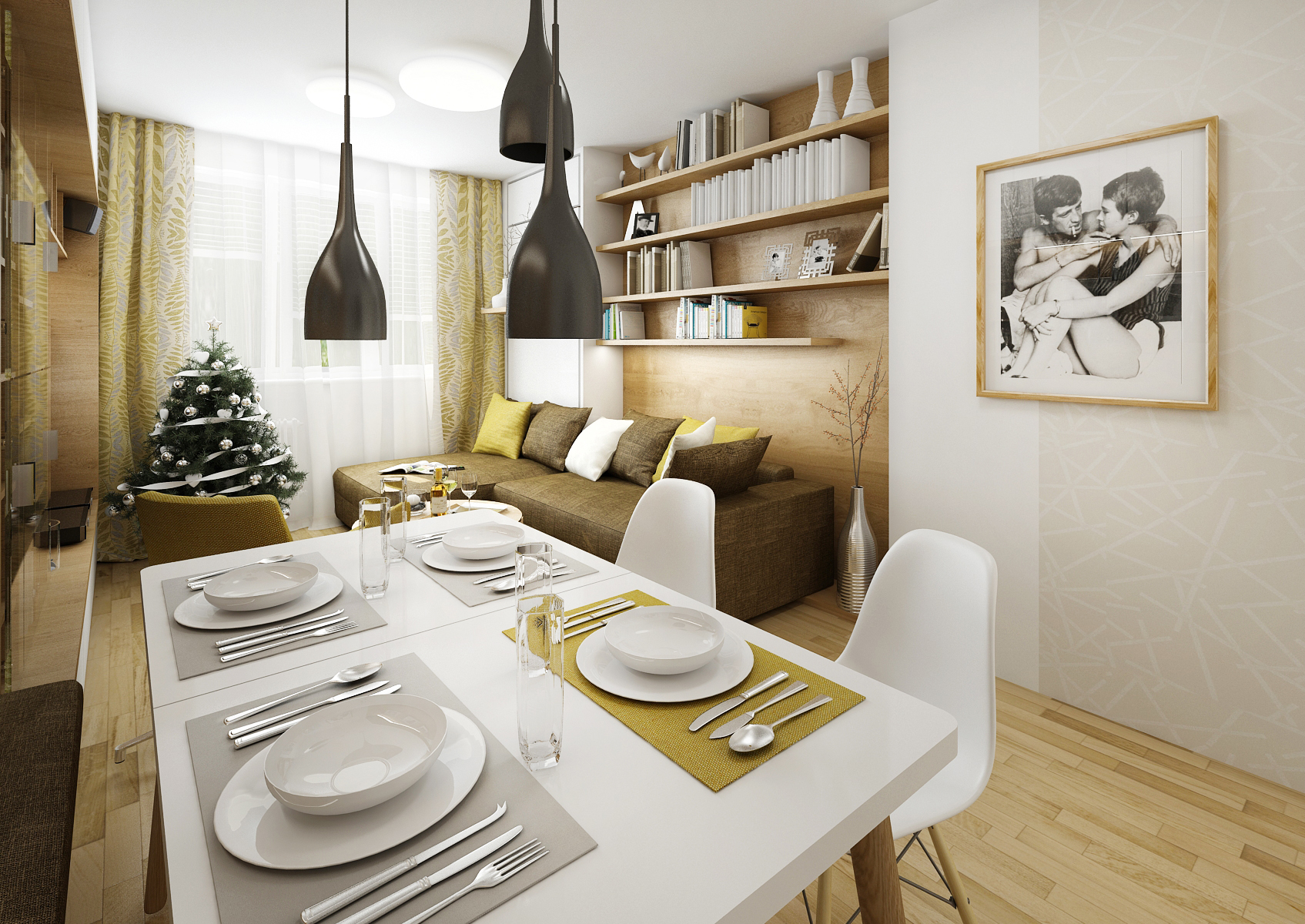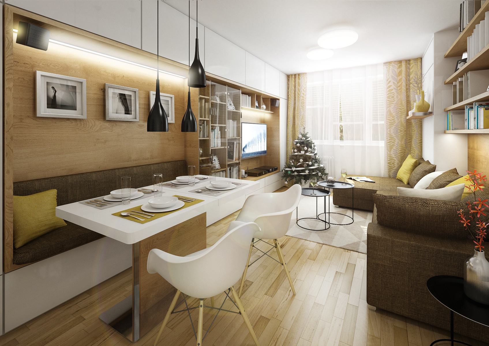 The dominant material is LTD in white and natural oak decor. In the living room wall, there is a niche and a bench, which is elegently designed for stting at the dining table and thus saves space that would be otherwise be needed for chairs. Ceiling lights are from Lucis-Orbis company. Hanging lights over the table are Rendl Light Studio - Swan.